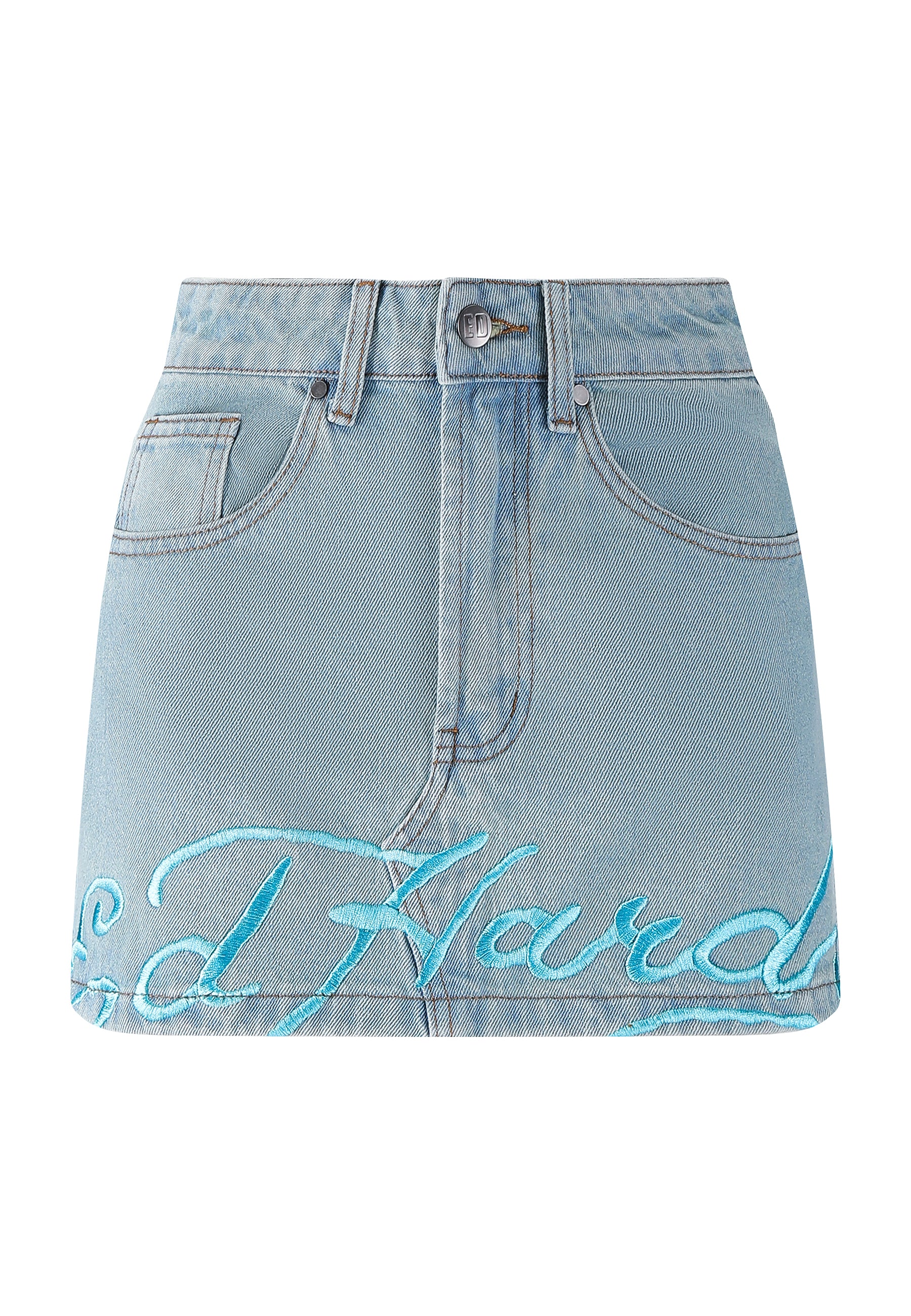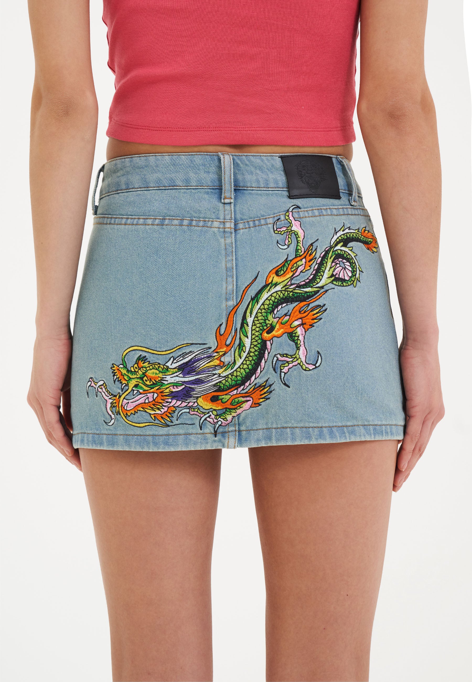 Womens Crawling Dragon Denim Mini Skirt - Blue