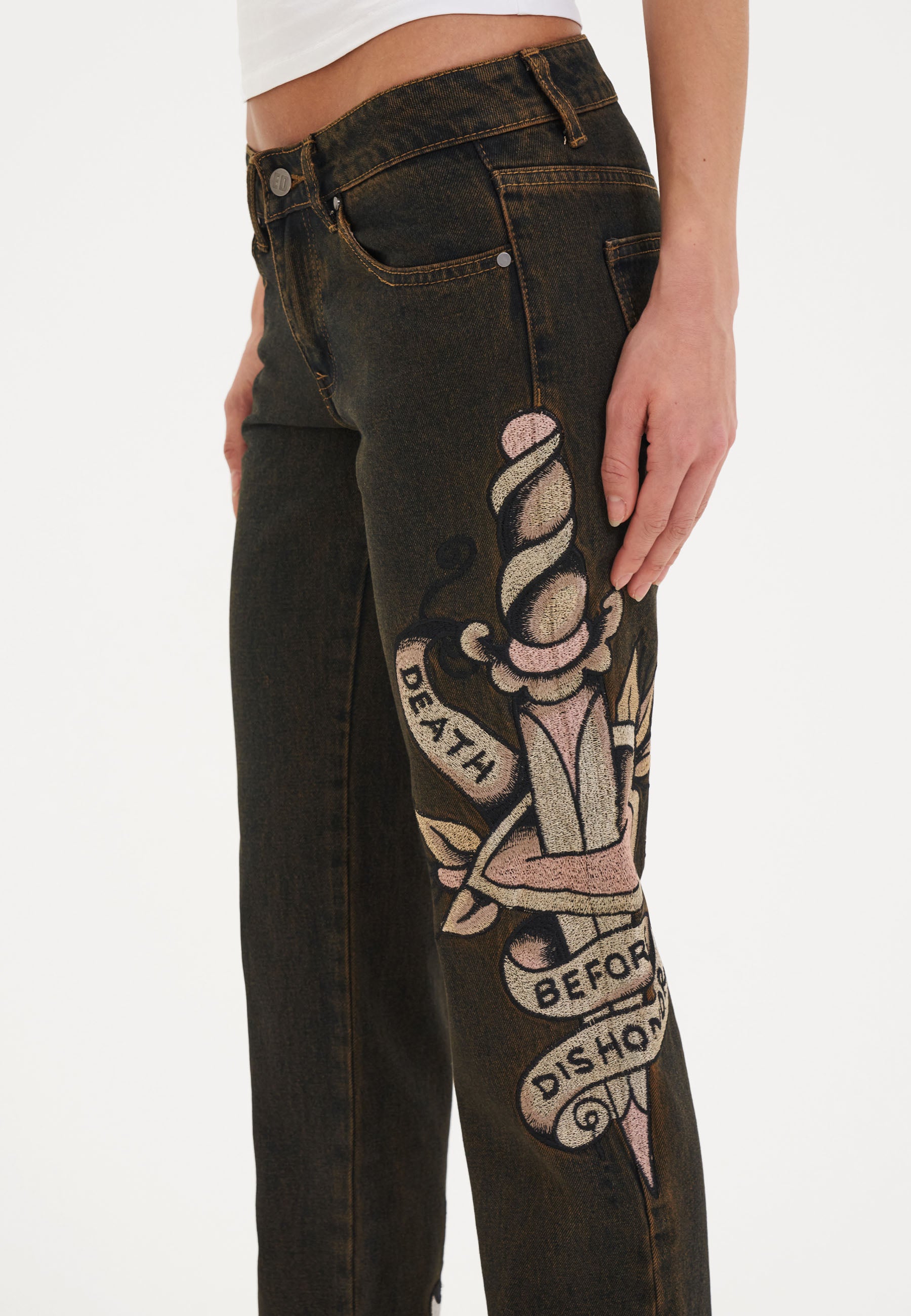 Drawing from the free-spirited energy of Summer Festivals and the power of Punk rebellion, the Death & Dishonour Jeans make a powerful statement in your wardrobe.