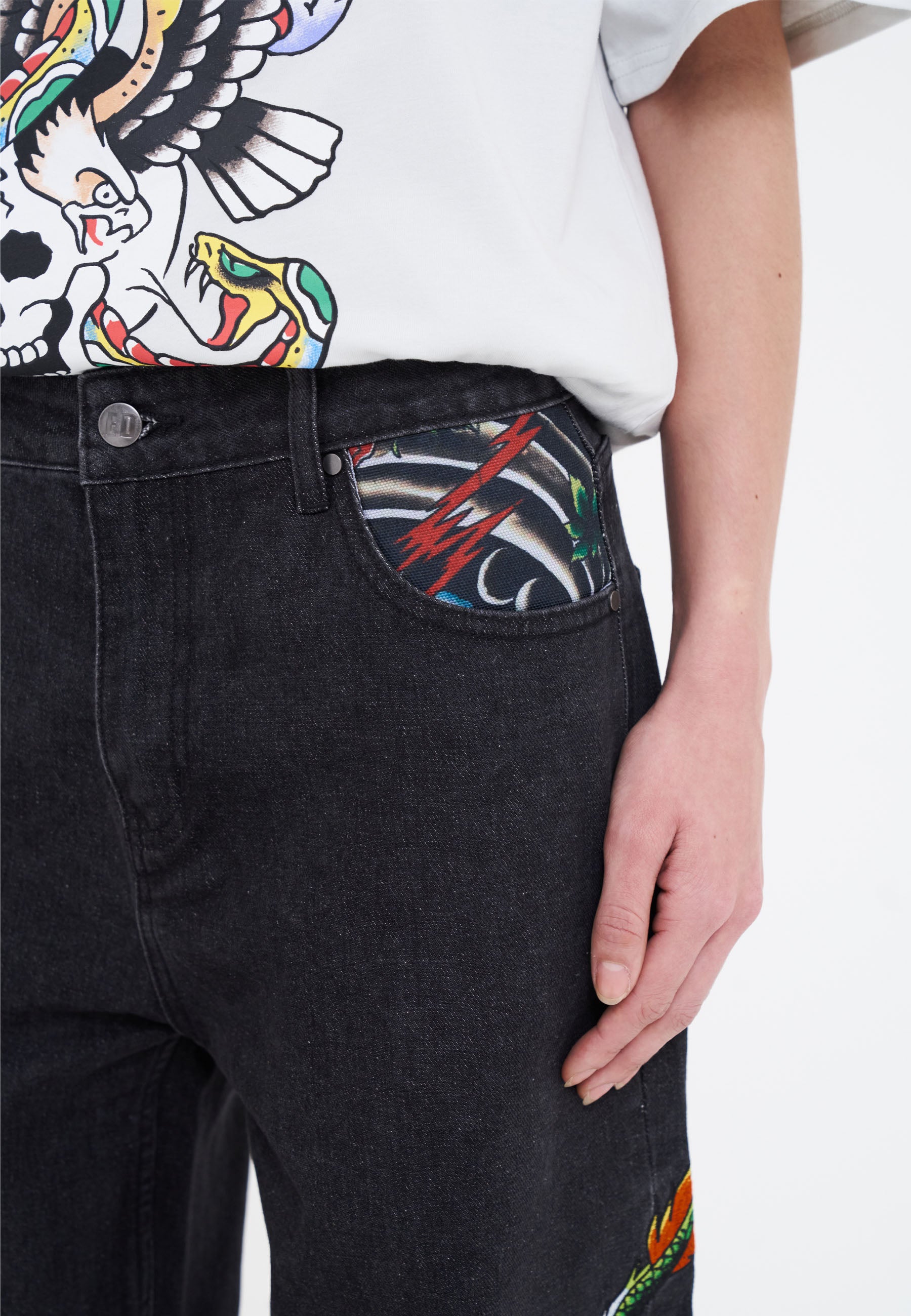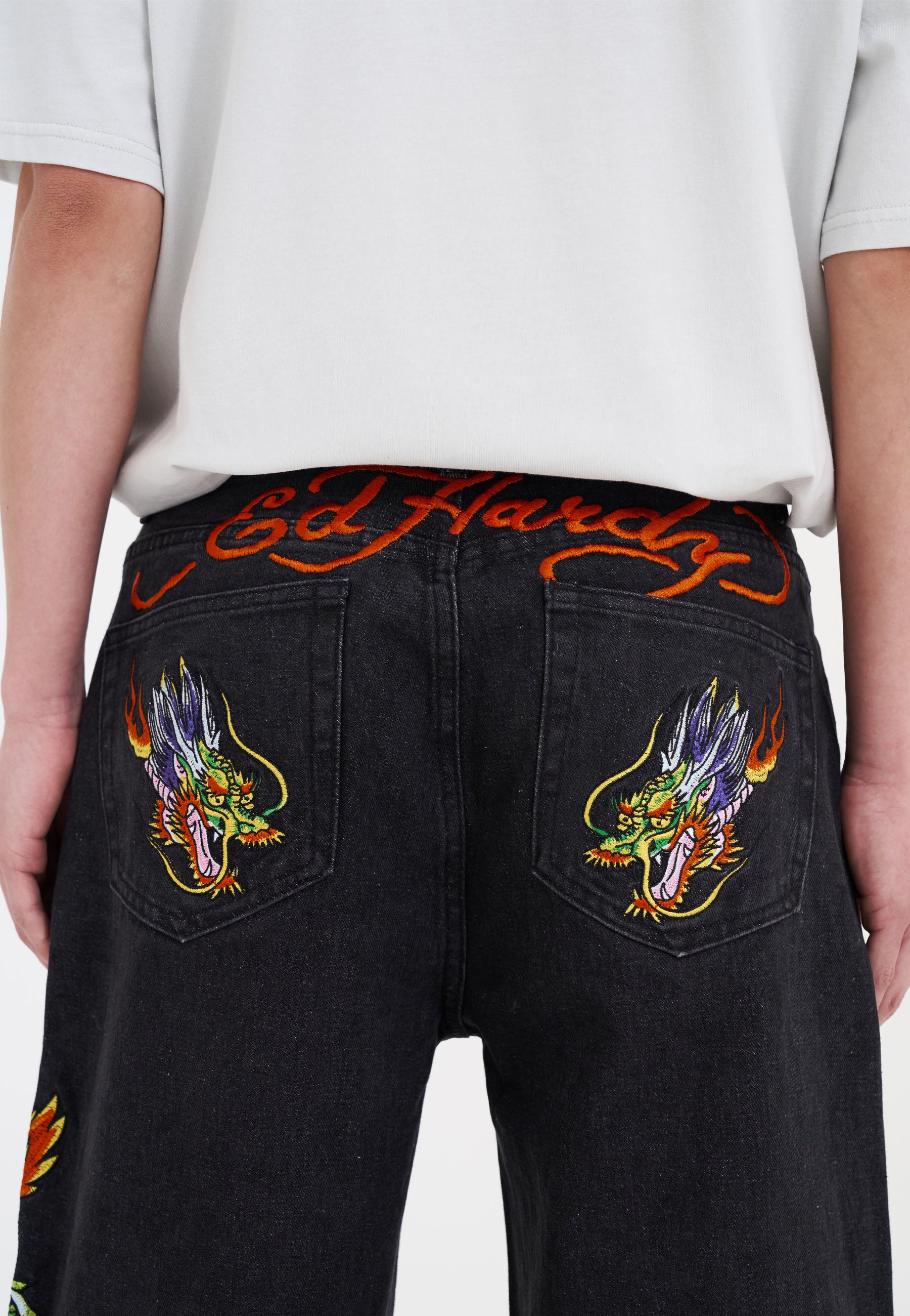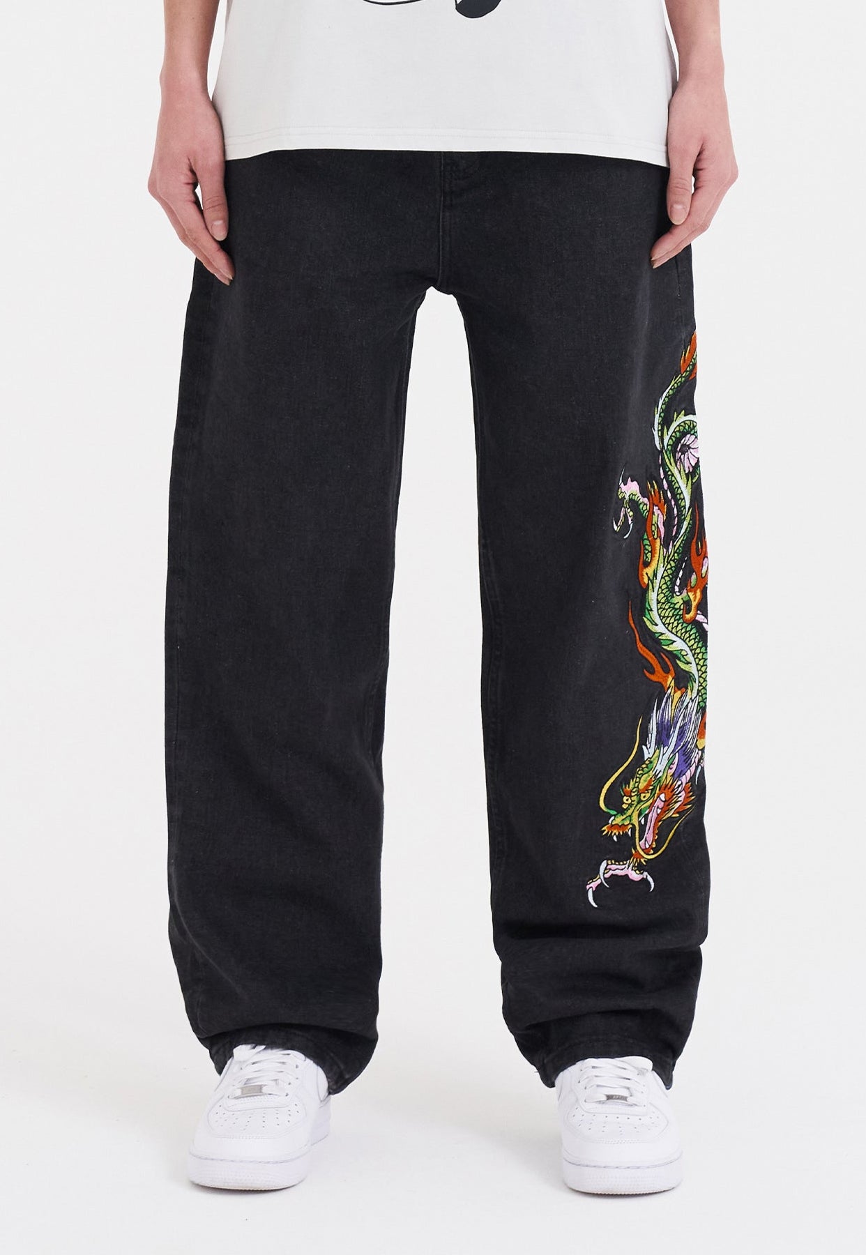 Womens Crawling Dragon Relaxed Fit Denim Trousers Jeans - Black