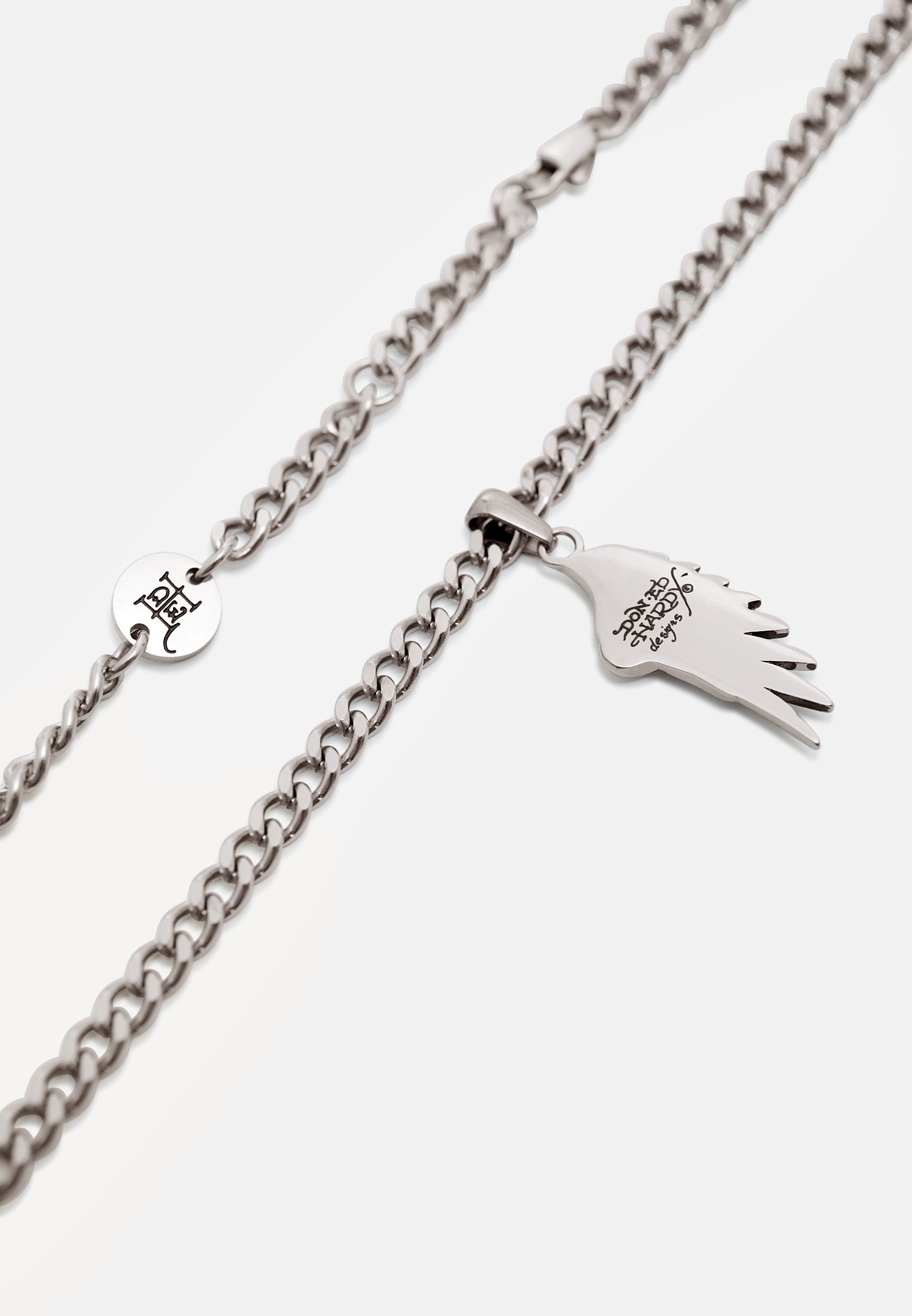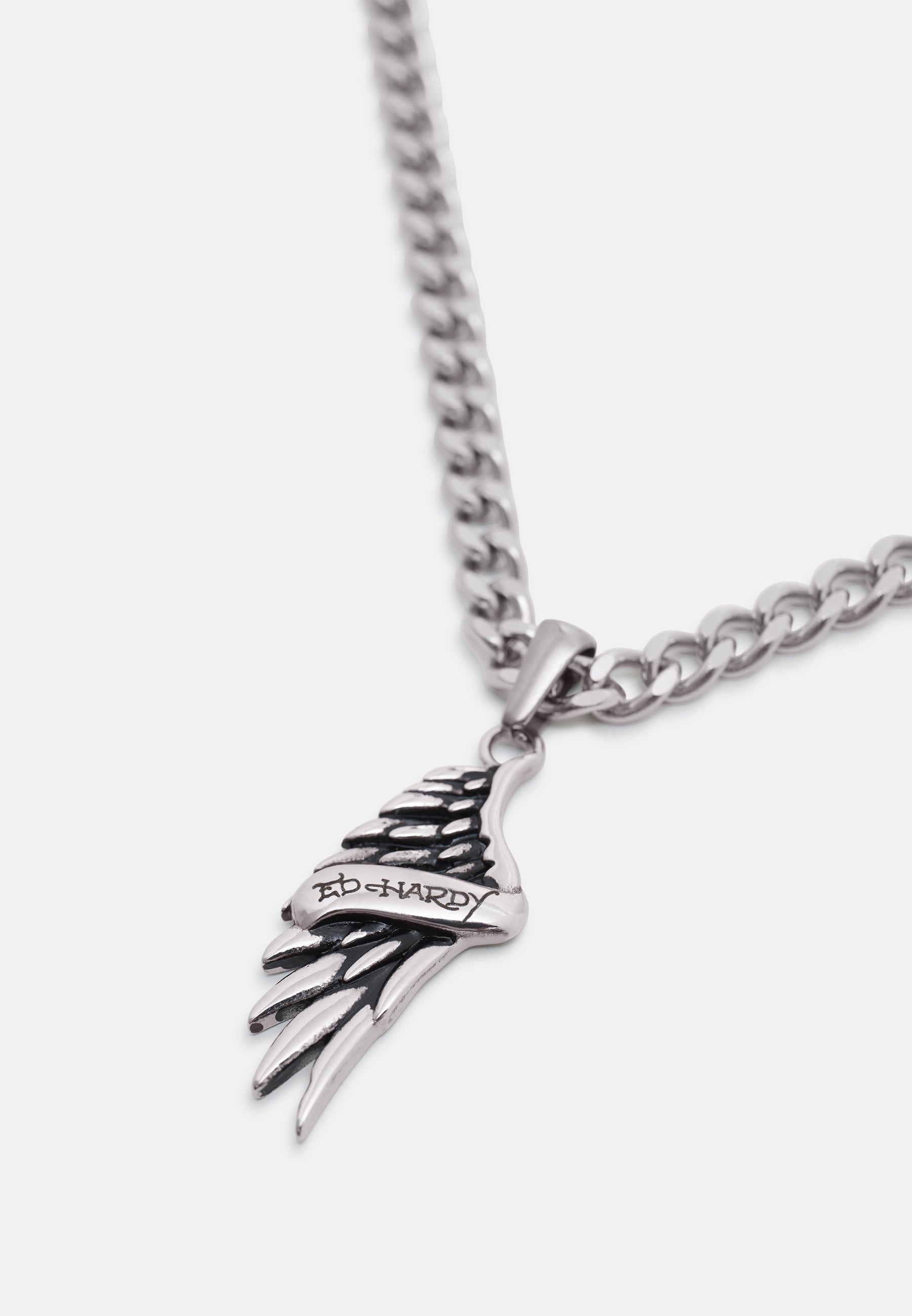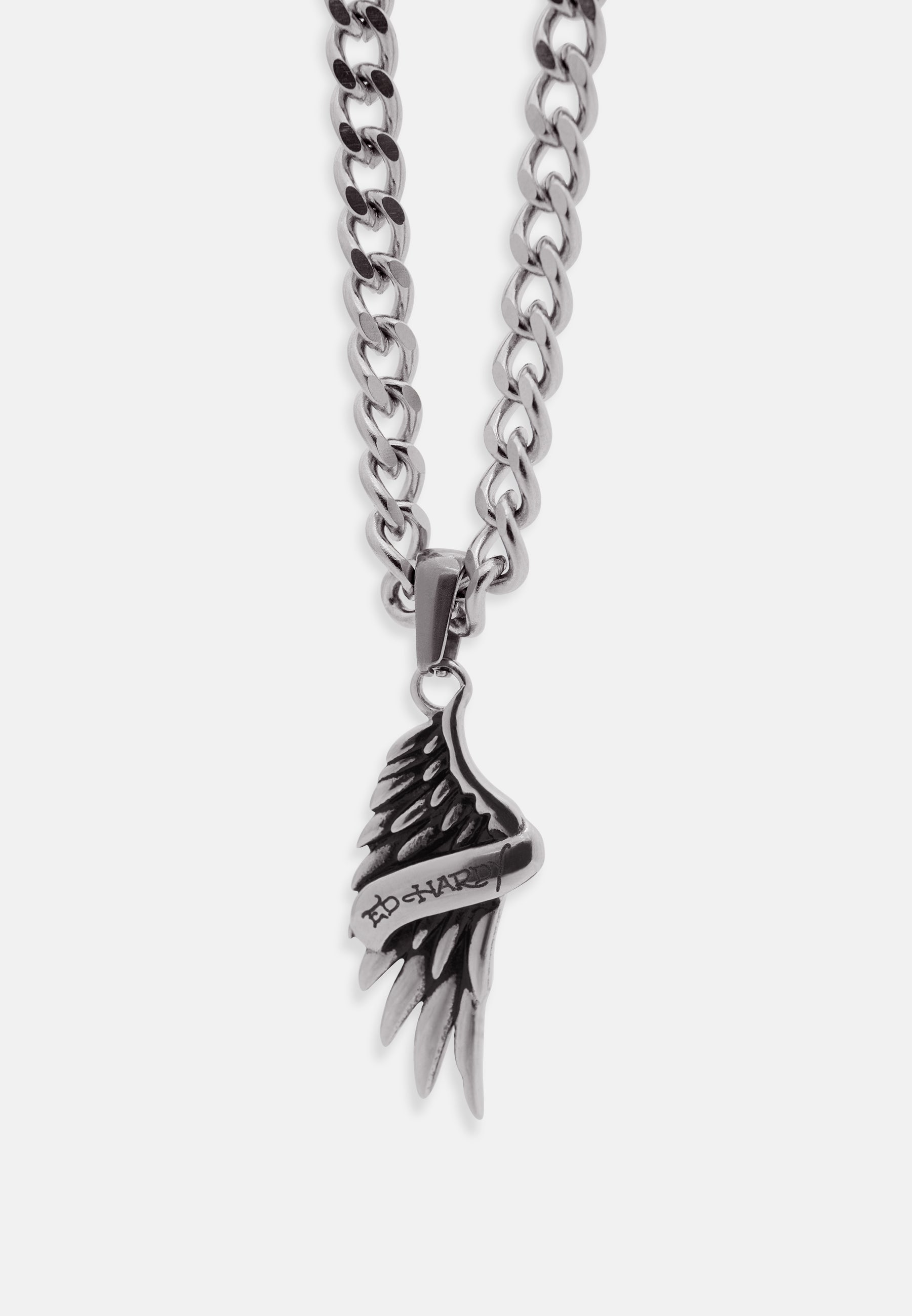 Stainless steel curb chain necklace with custom cast ED HARDY angel wing pendant with Ed Hardy scroll logo, finished in an antiqued silver finish.