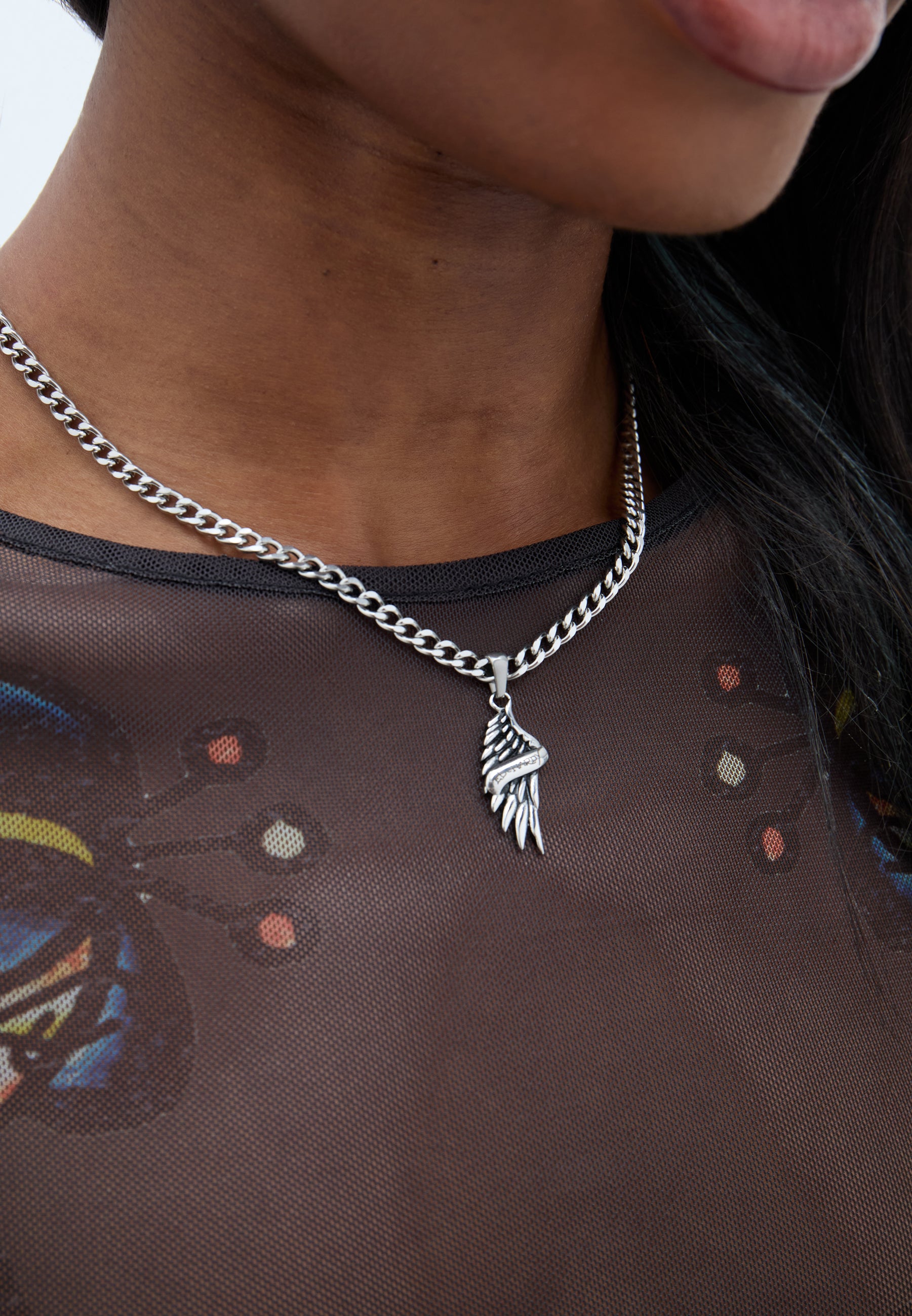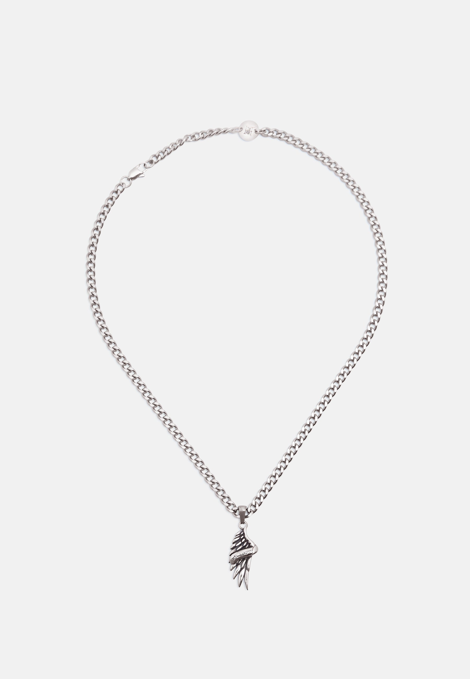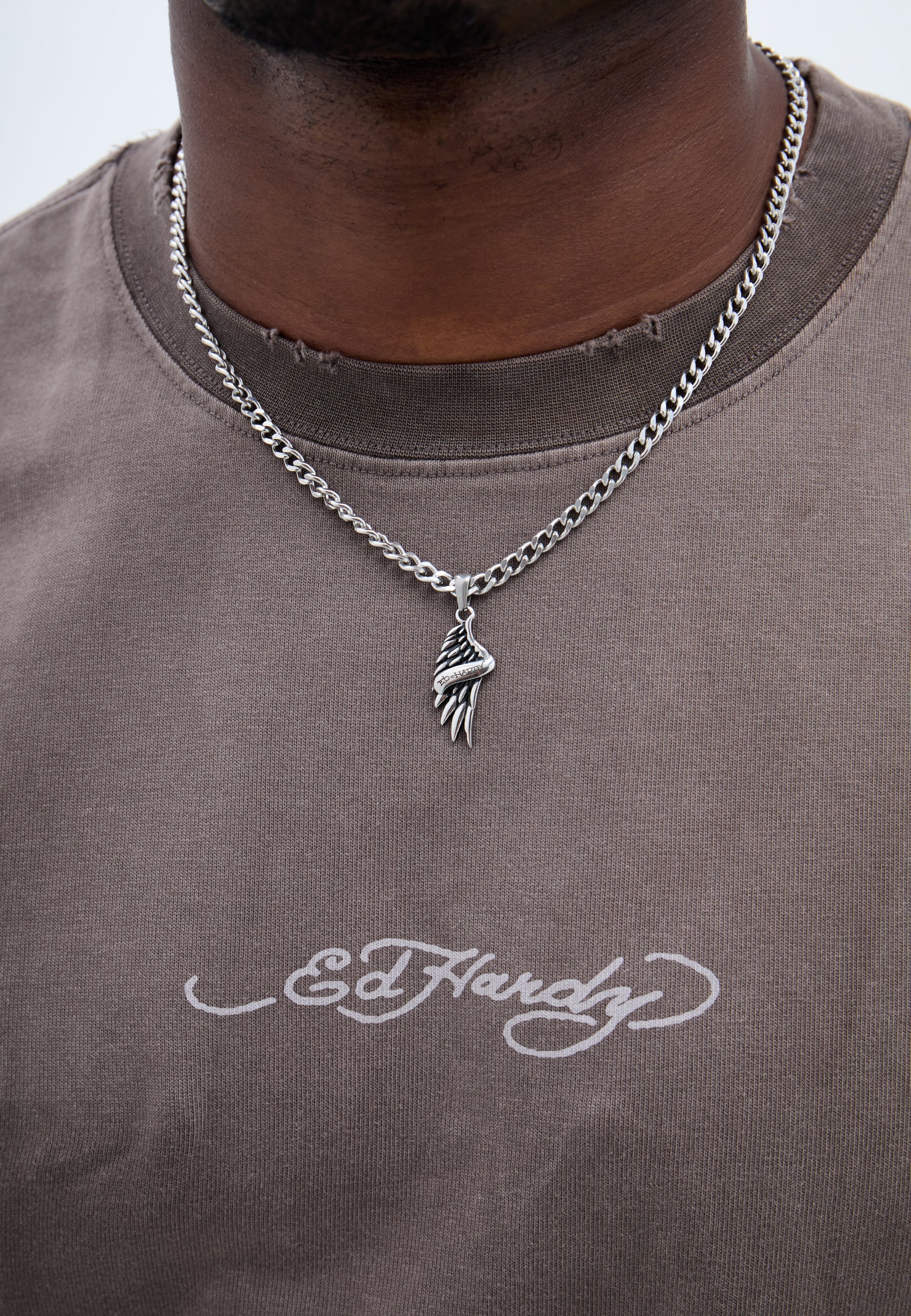 Stainless steel curb chain necklace with custom cast ED HARDY angel wing pendant with Ed Hardy scroll logo, finished in an antiqued silver finish.