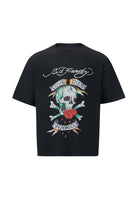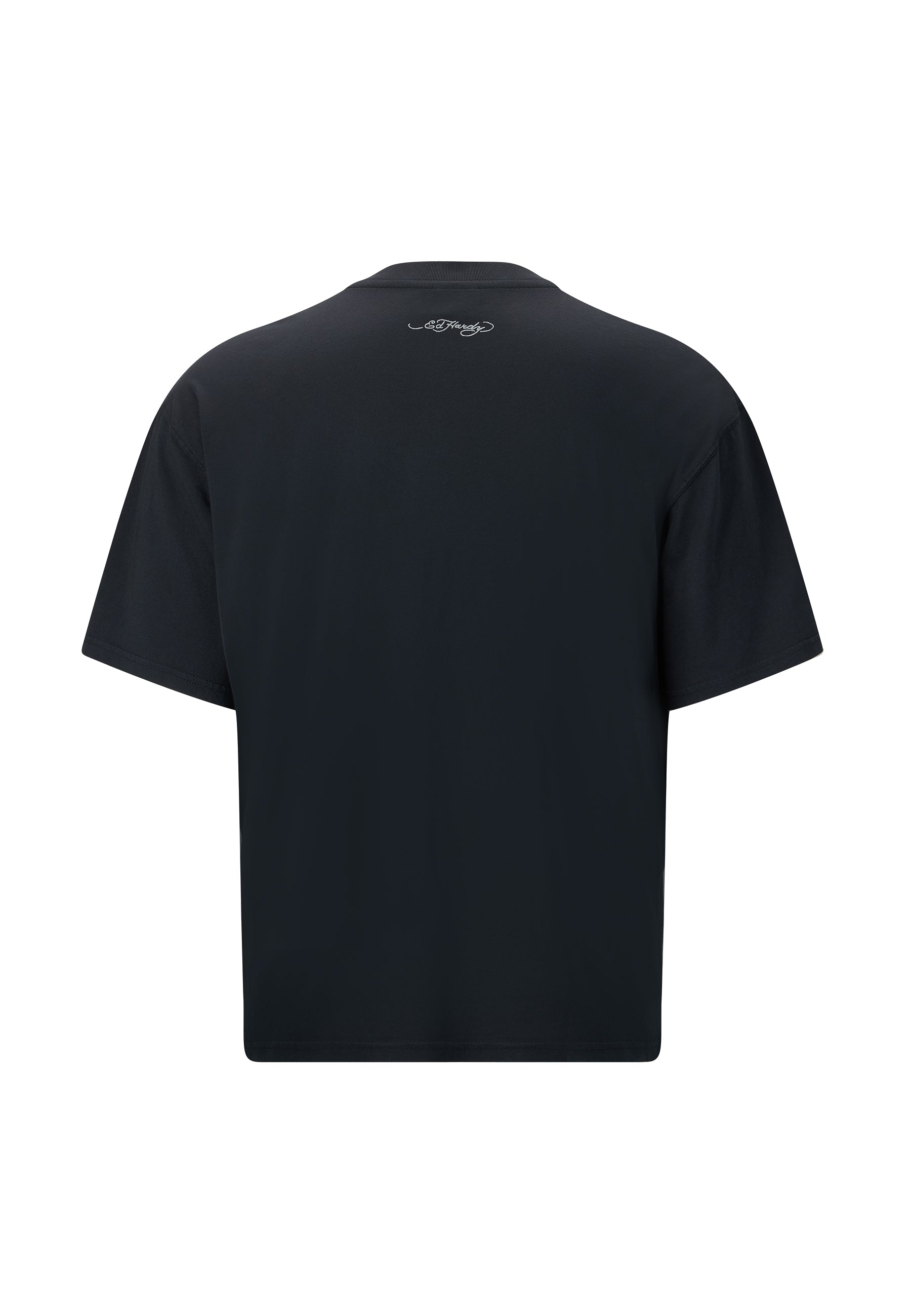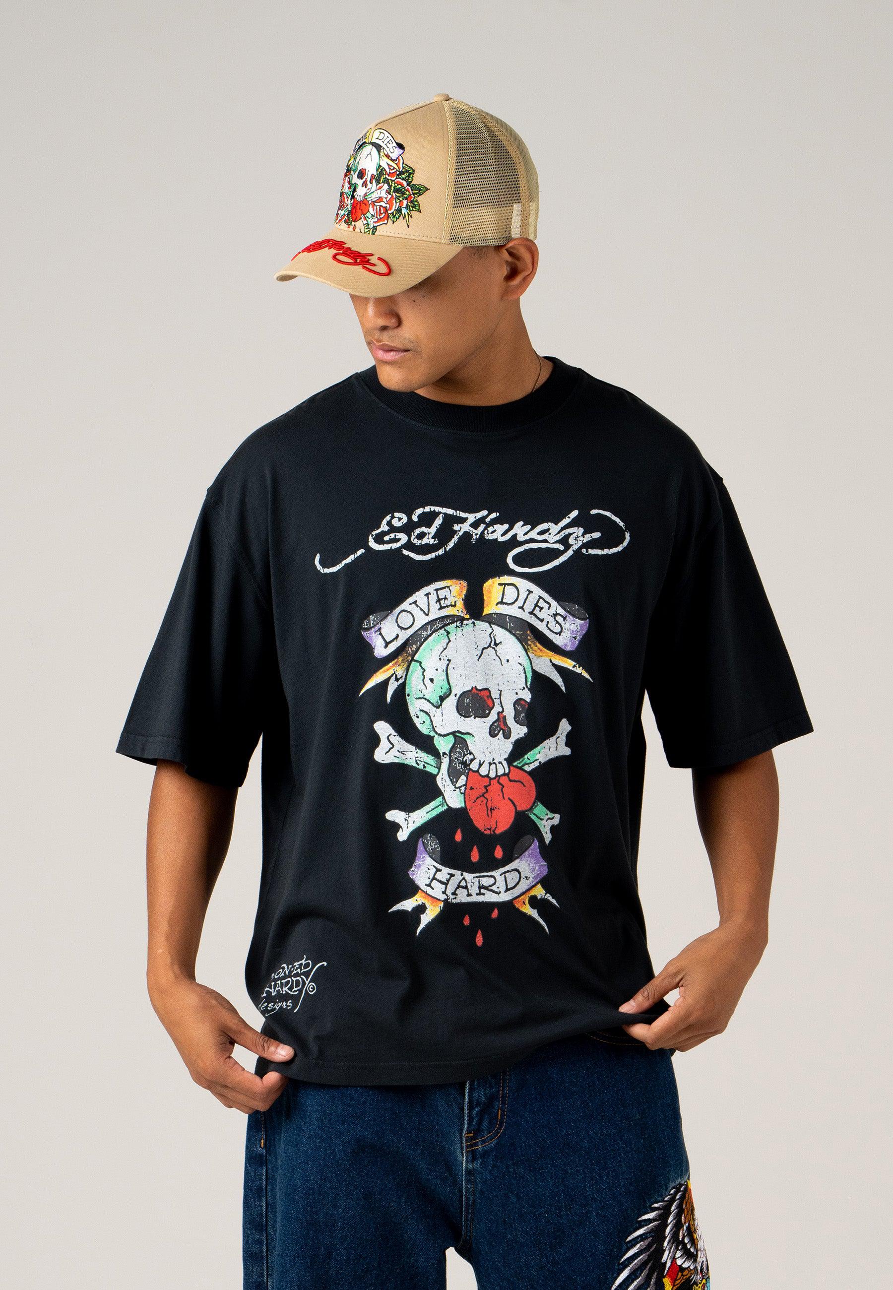 This T-shirt’s washed black colouration and distressed “LOVE DIES HARD” print of a bone-white skull crushing a heart make it vintage Ed Hardy through and through. With Ed Hardy’s iconic logo printed in white above the graphic and an oversized fit, this T-shirt is cool and comfortable. 100%Cotton Jersey 180GSM.