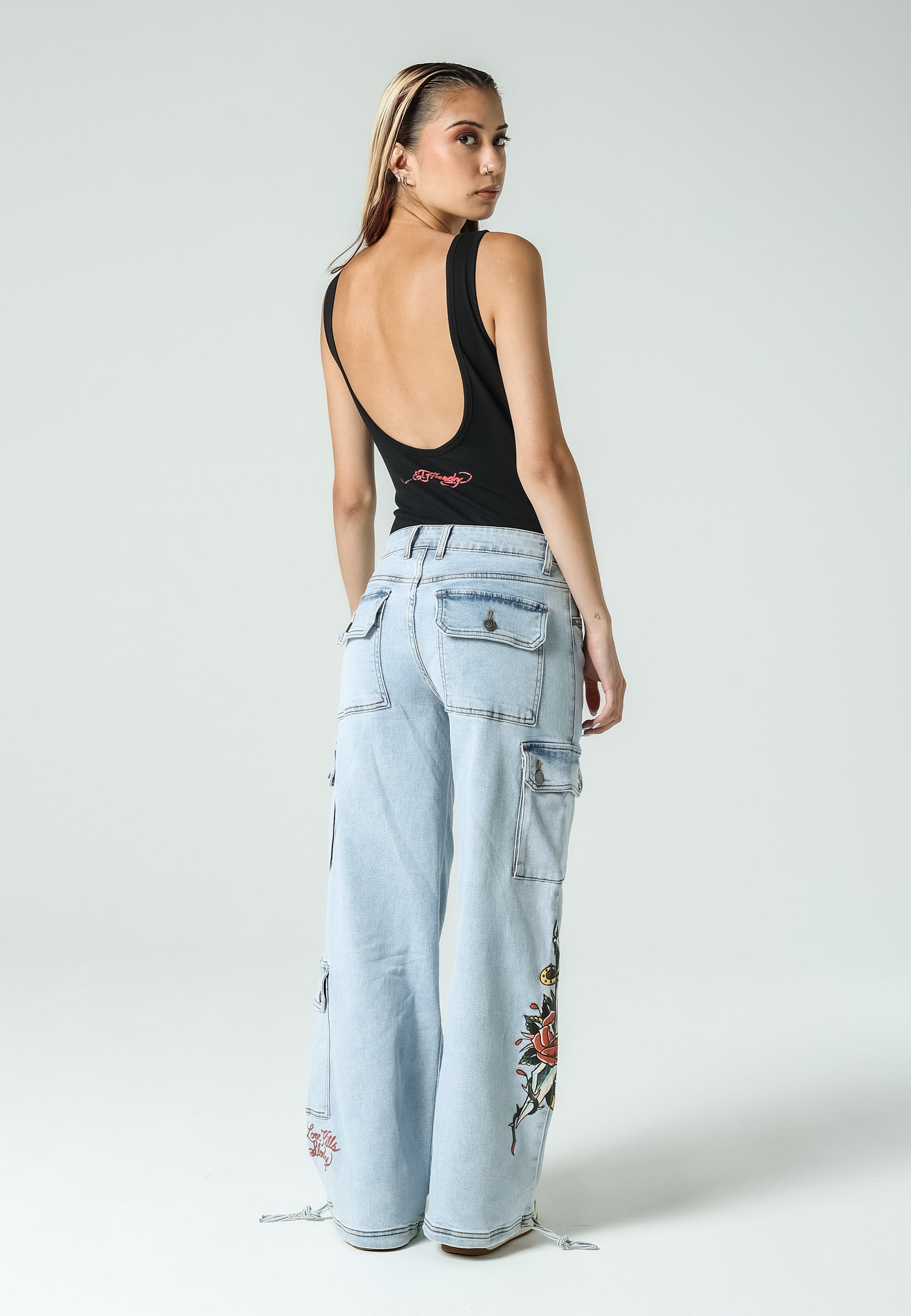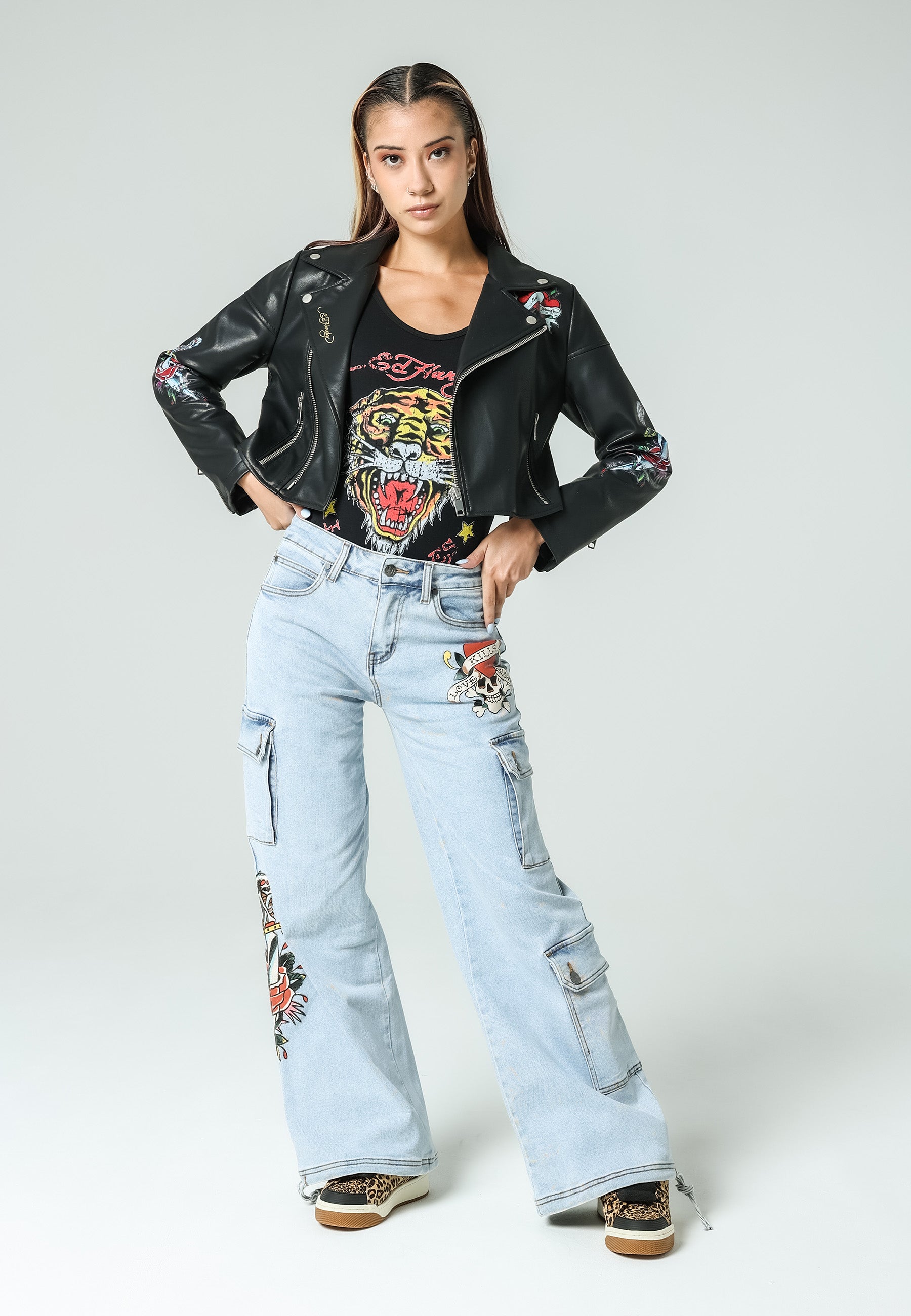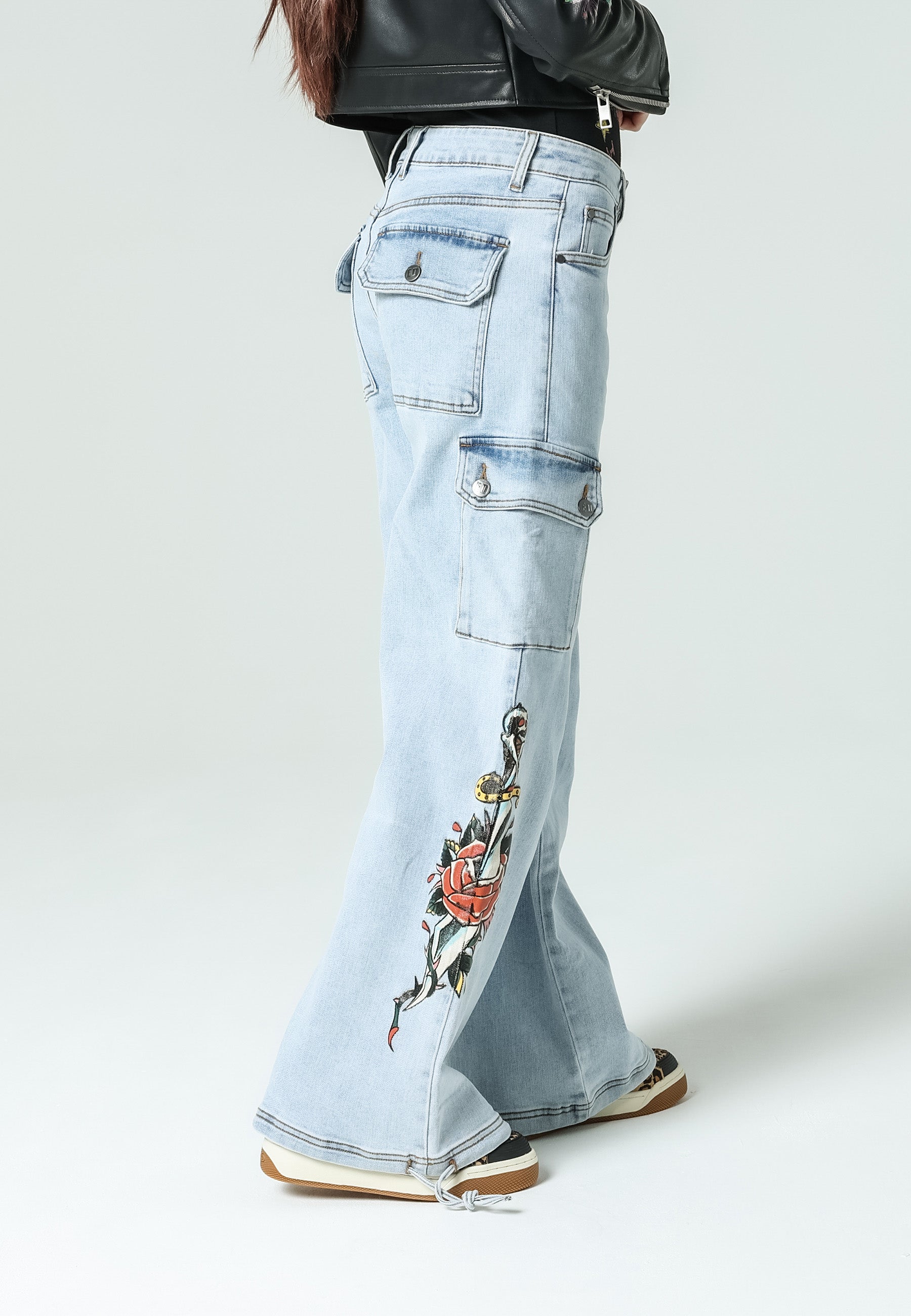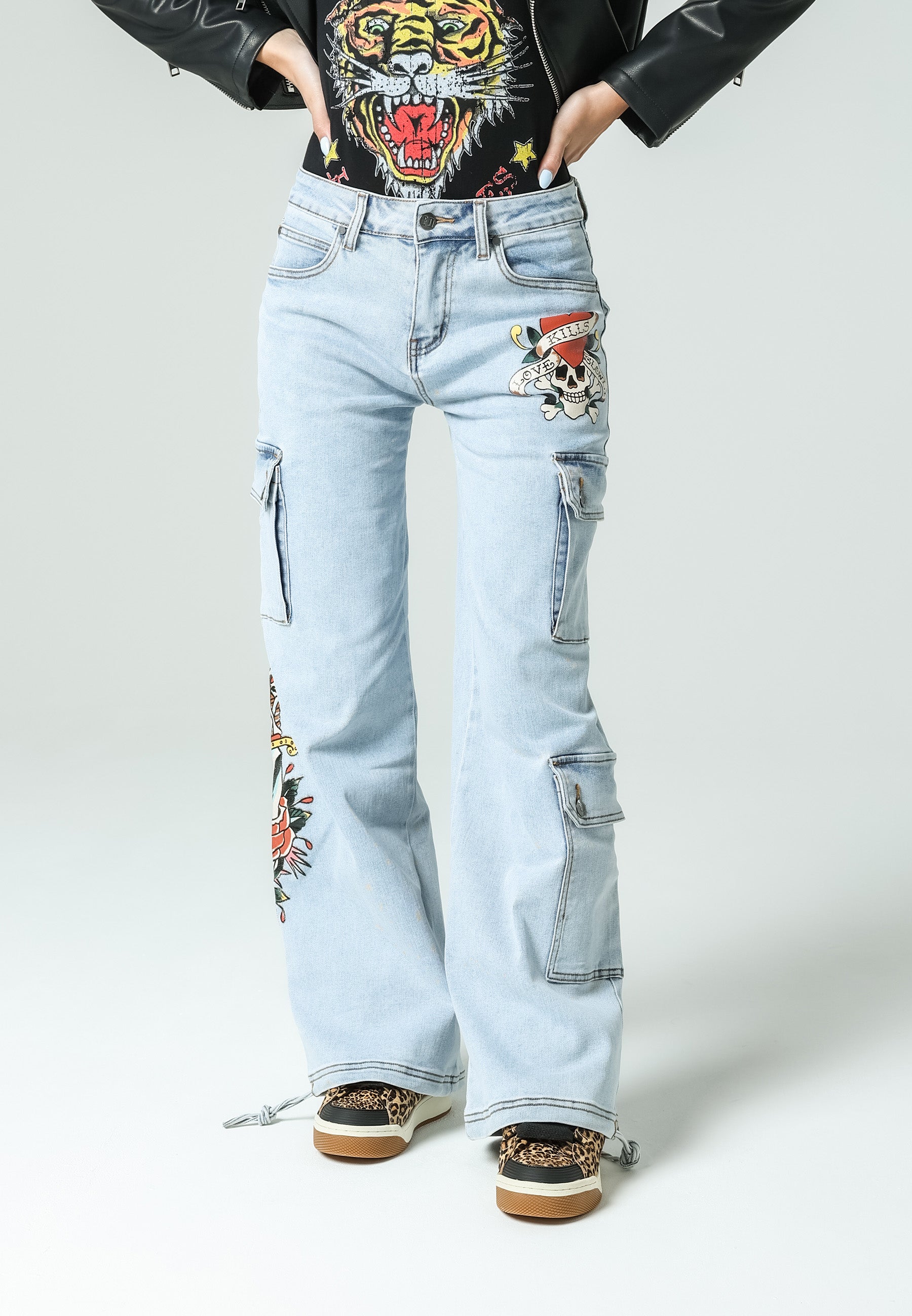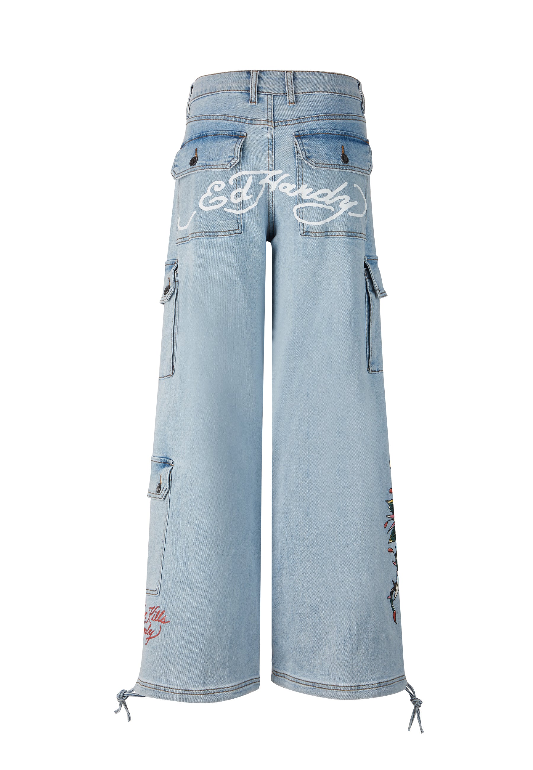 We wholeheartedly believe that bigger and bolder is better. The Love Kills relaxed cargo jean in the washed bleach colour is a throwback we’re loving, with its wide leg, plethora of pockets, and tattoo-inspired printed love-kills graphic. 78%Cotton 20%Polyester 2%Spandex Denim.