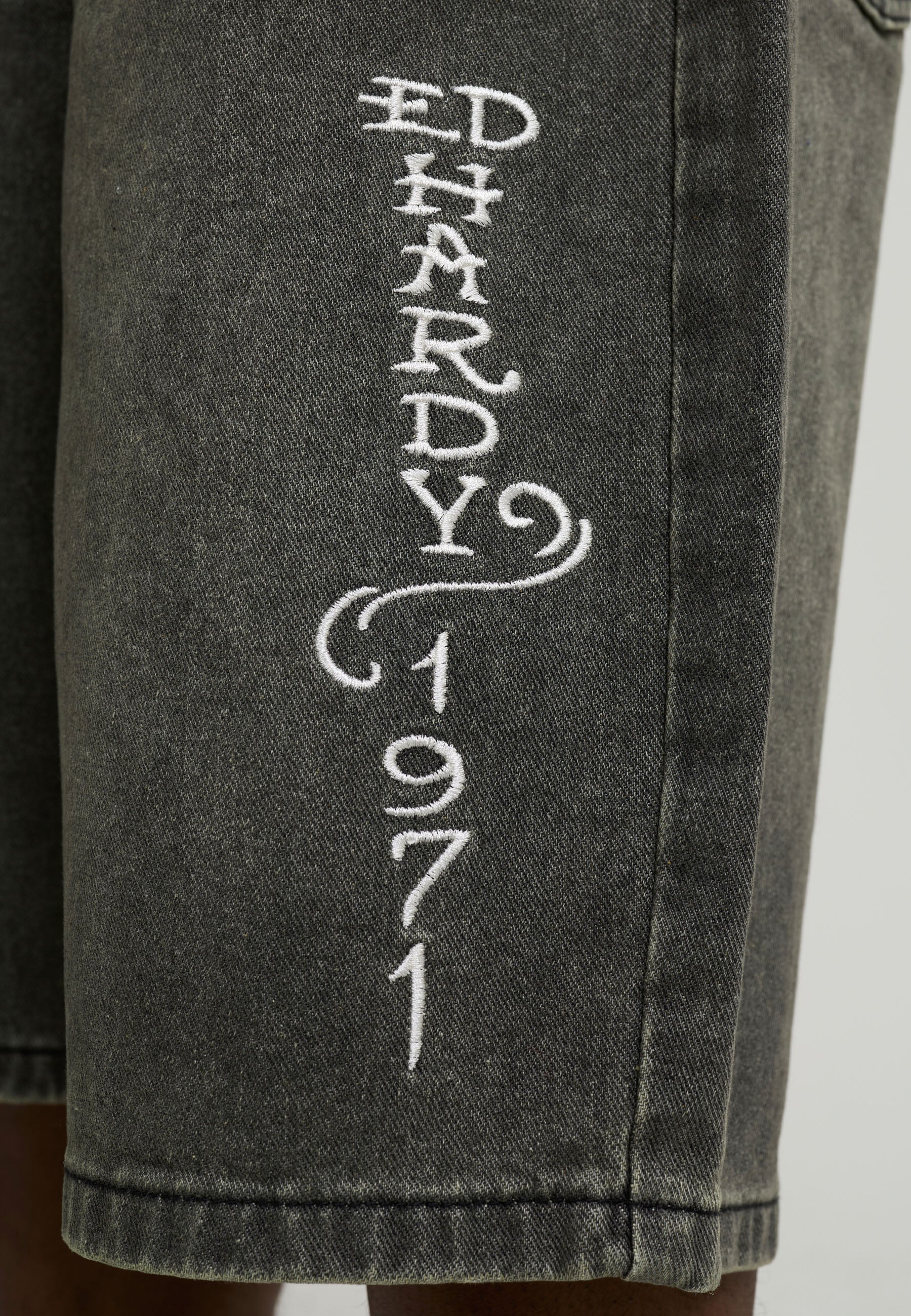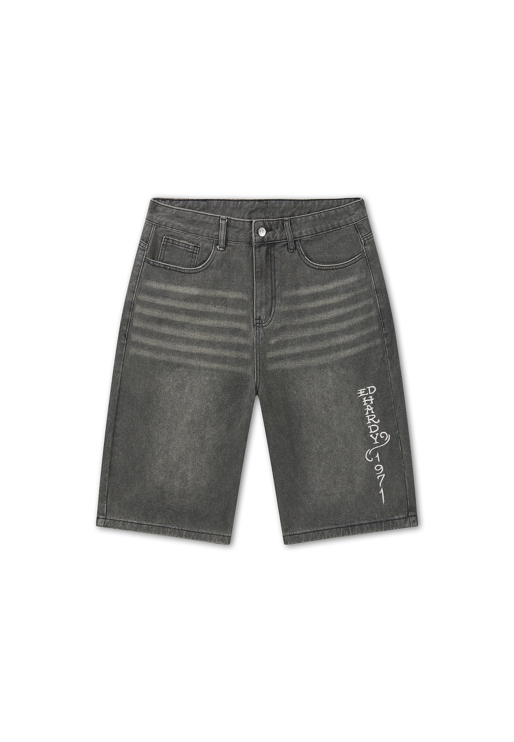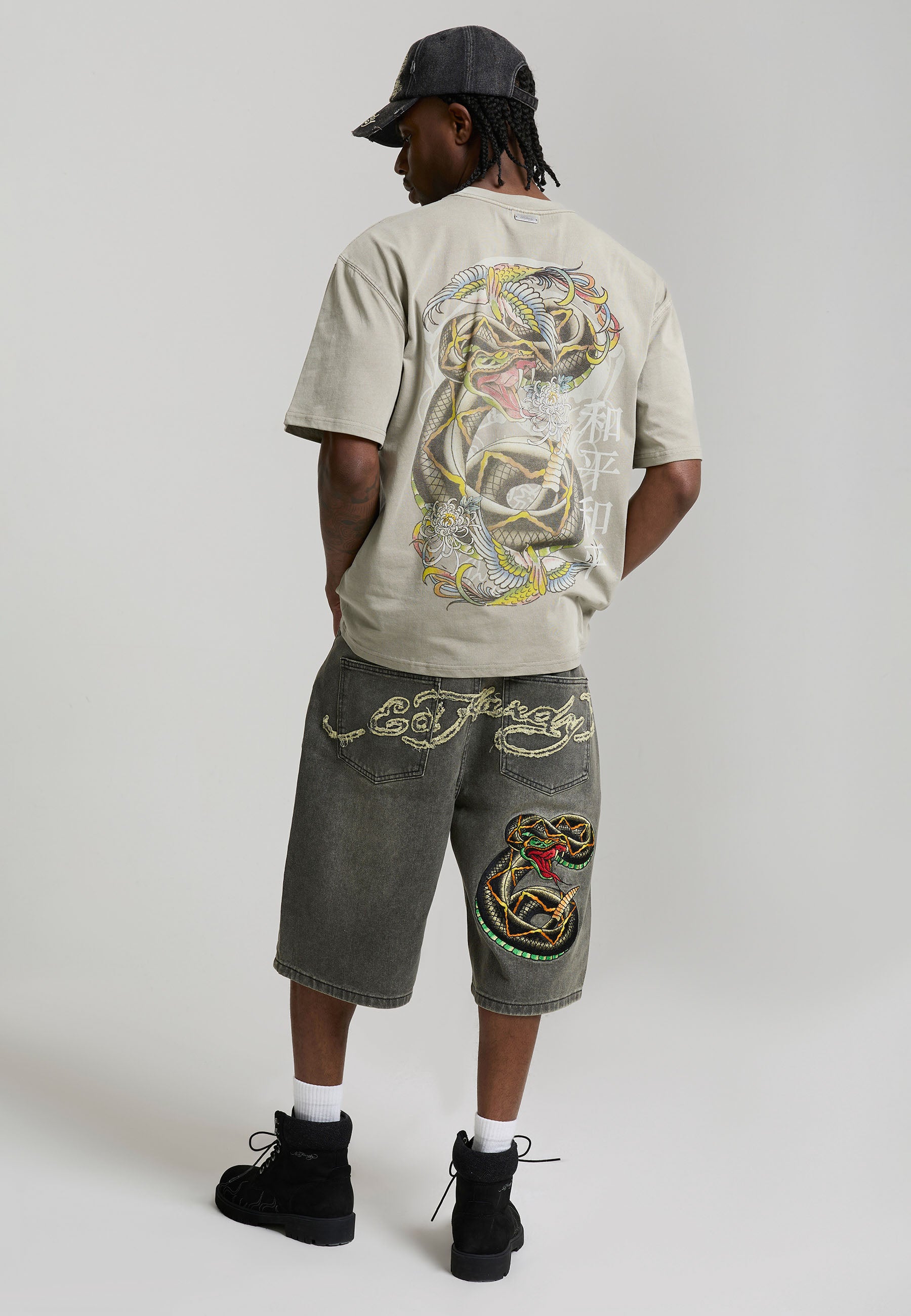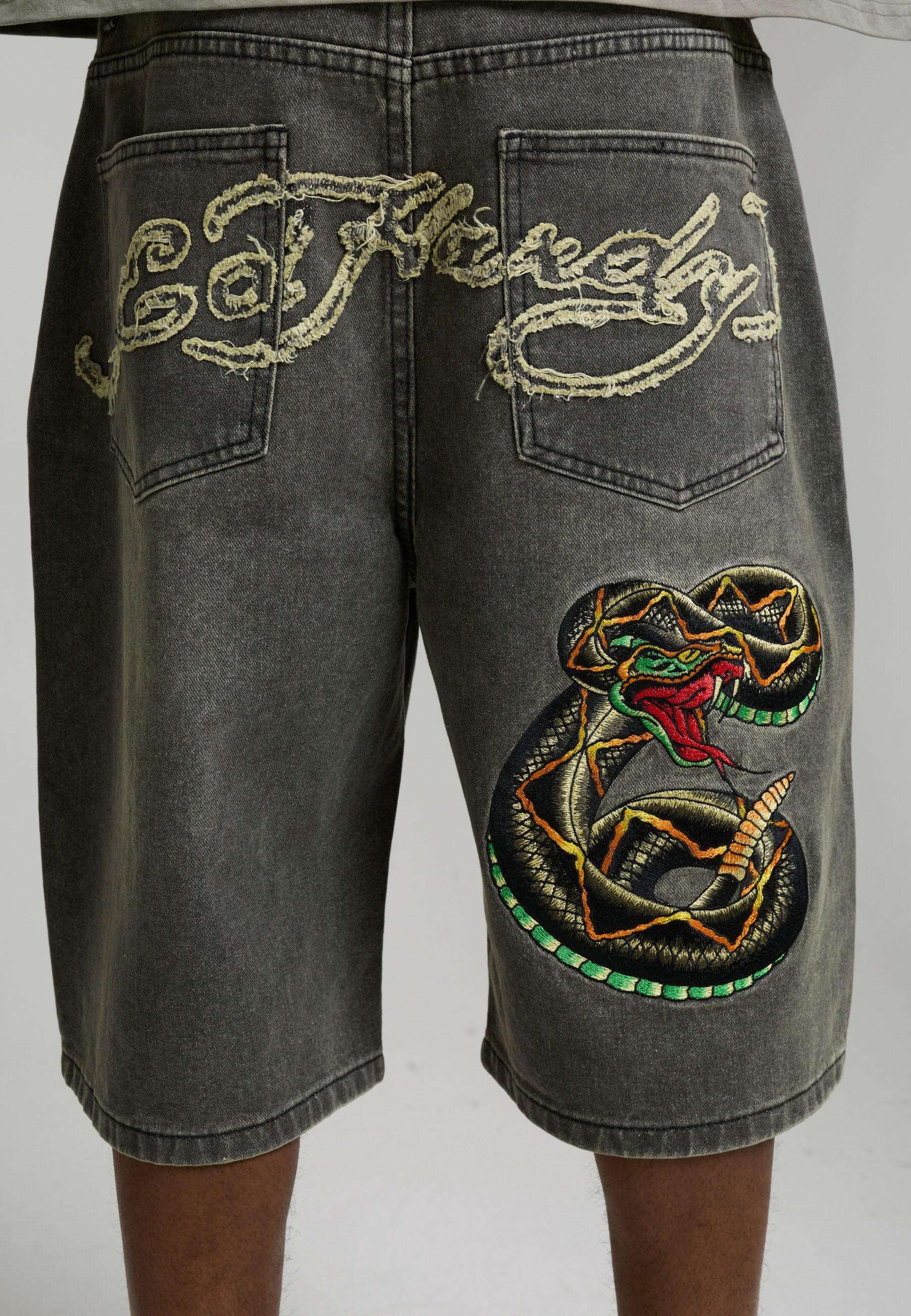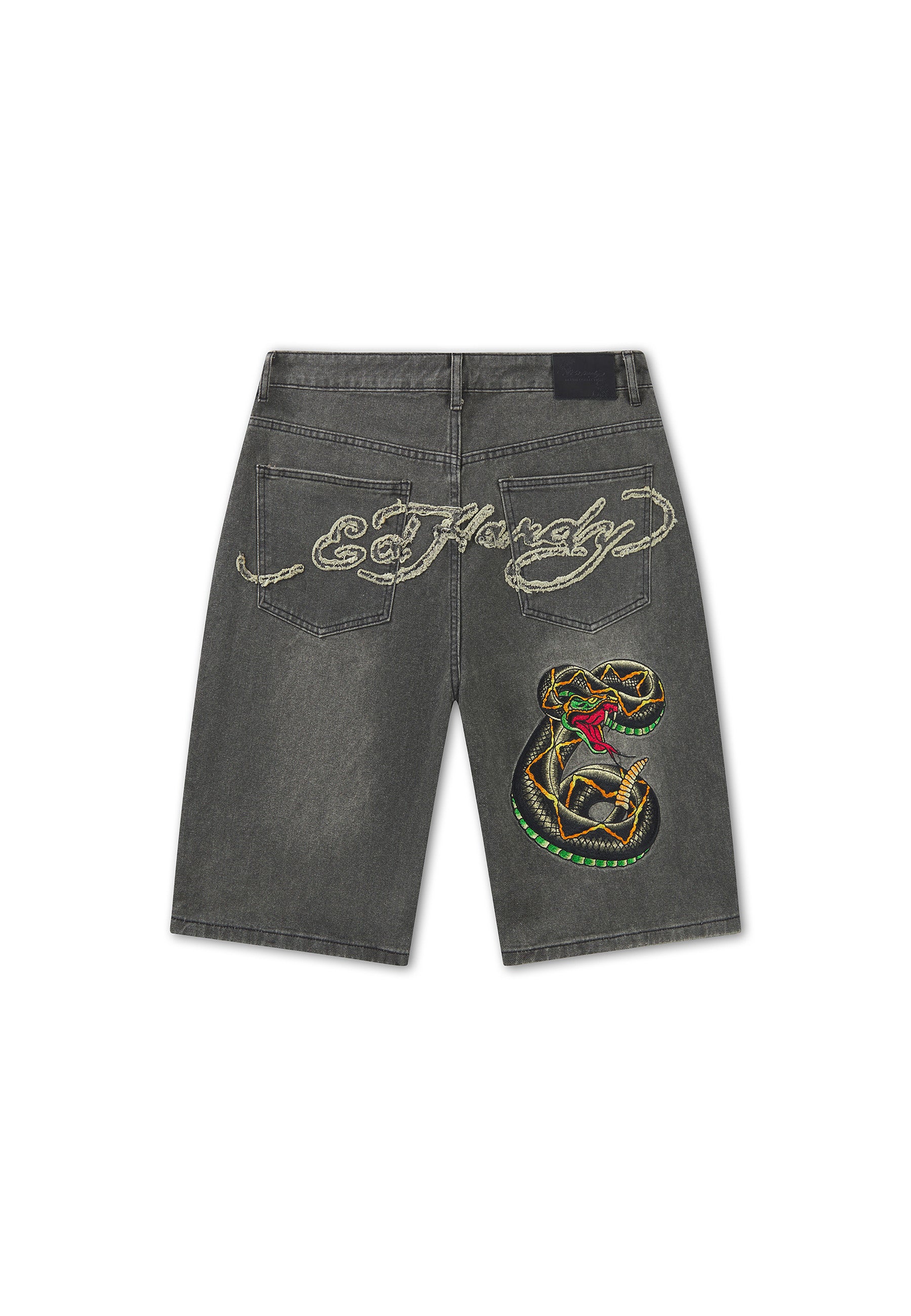 90% COTTON, 10% POLYESTER 12OZ RELAXED FIT SAND WASH ED HARDY DISTRESSED APPLIQUE SNAKE CHARMER EMBROIDERY .LIGHT DISTRESSING ED HARDY EMBROIDERY AT LEG