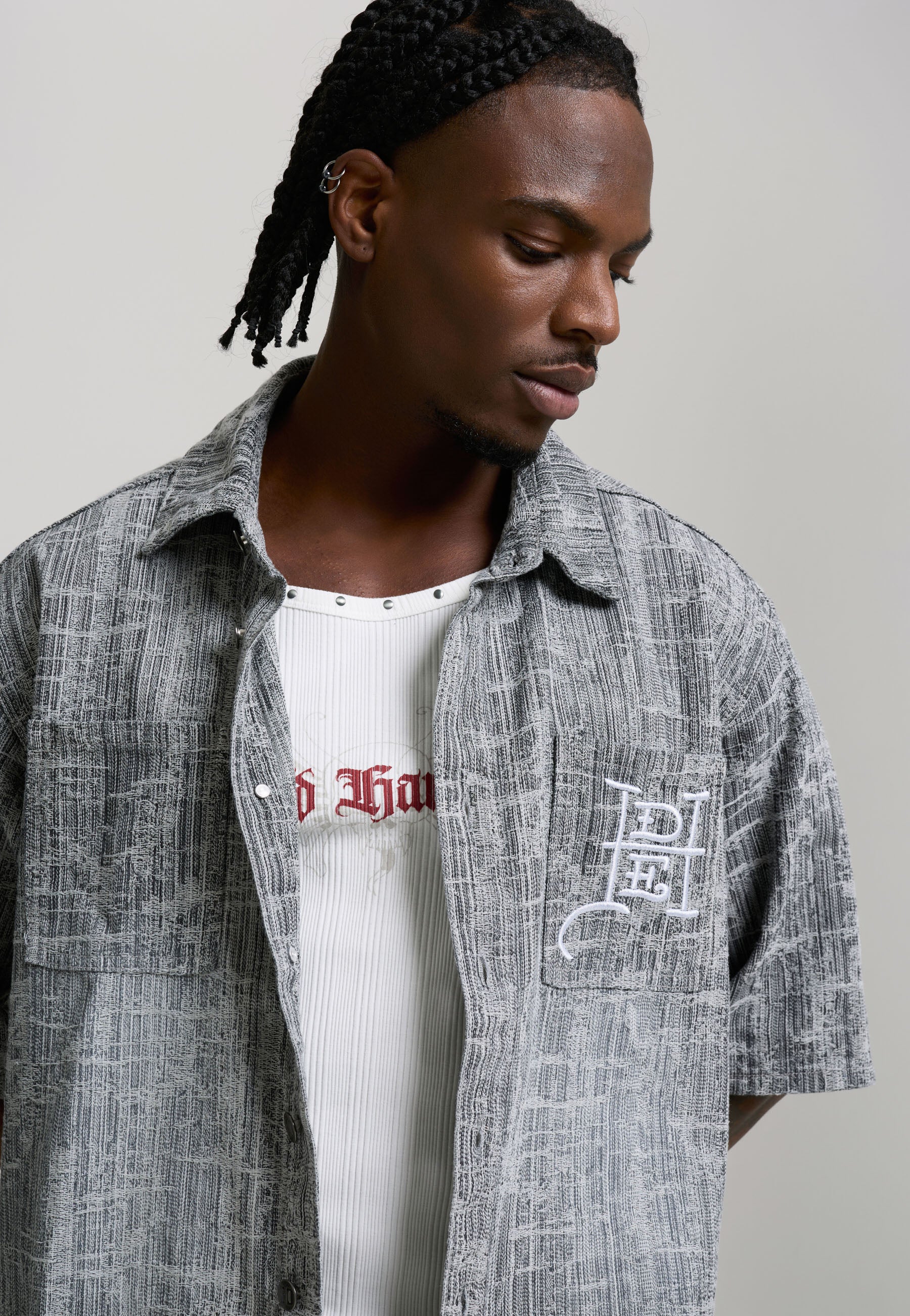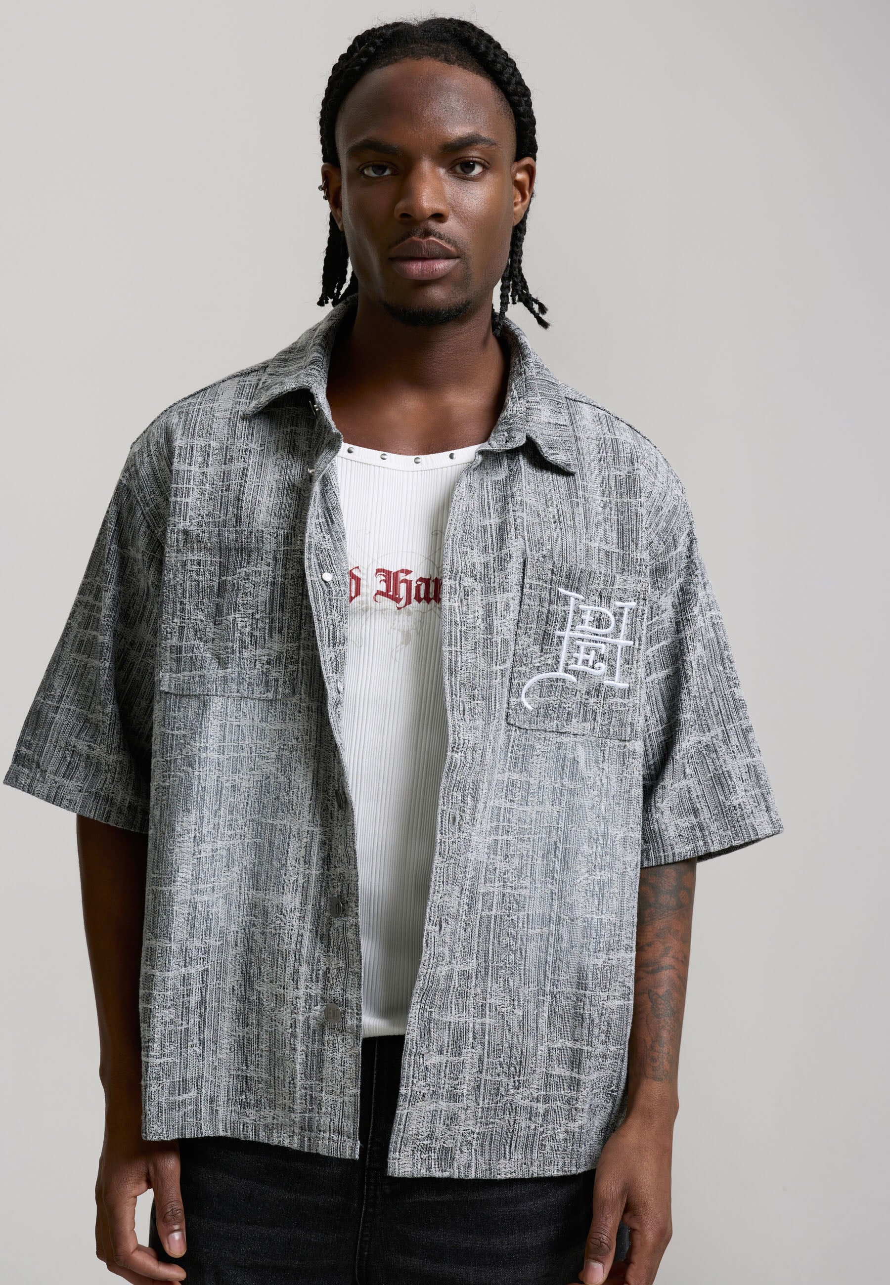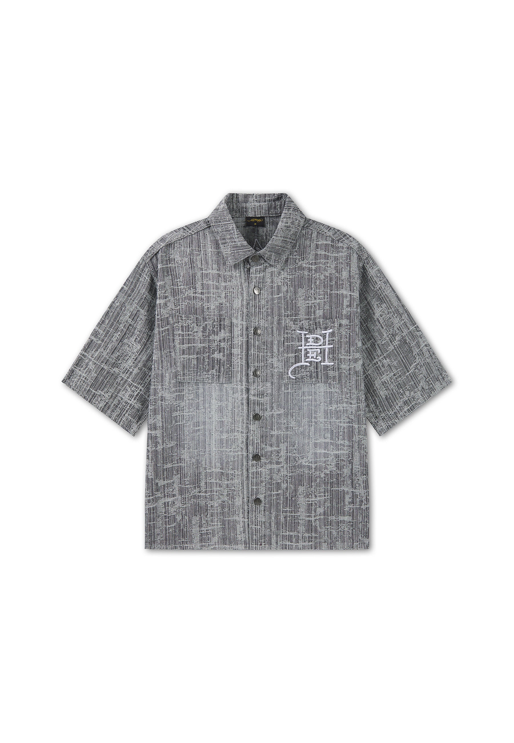 100% COTTON RELAXED FIT ENZME WASH DISTRESSED FABRICATION ED HARDY CROSS EMBROIDERY CHEST POCKET DETAILING ED HARDY BRANDED SHANK FASTENING