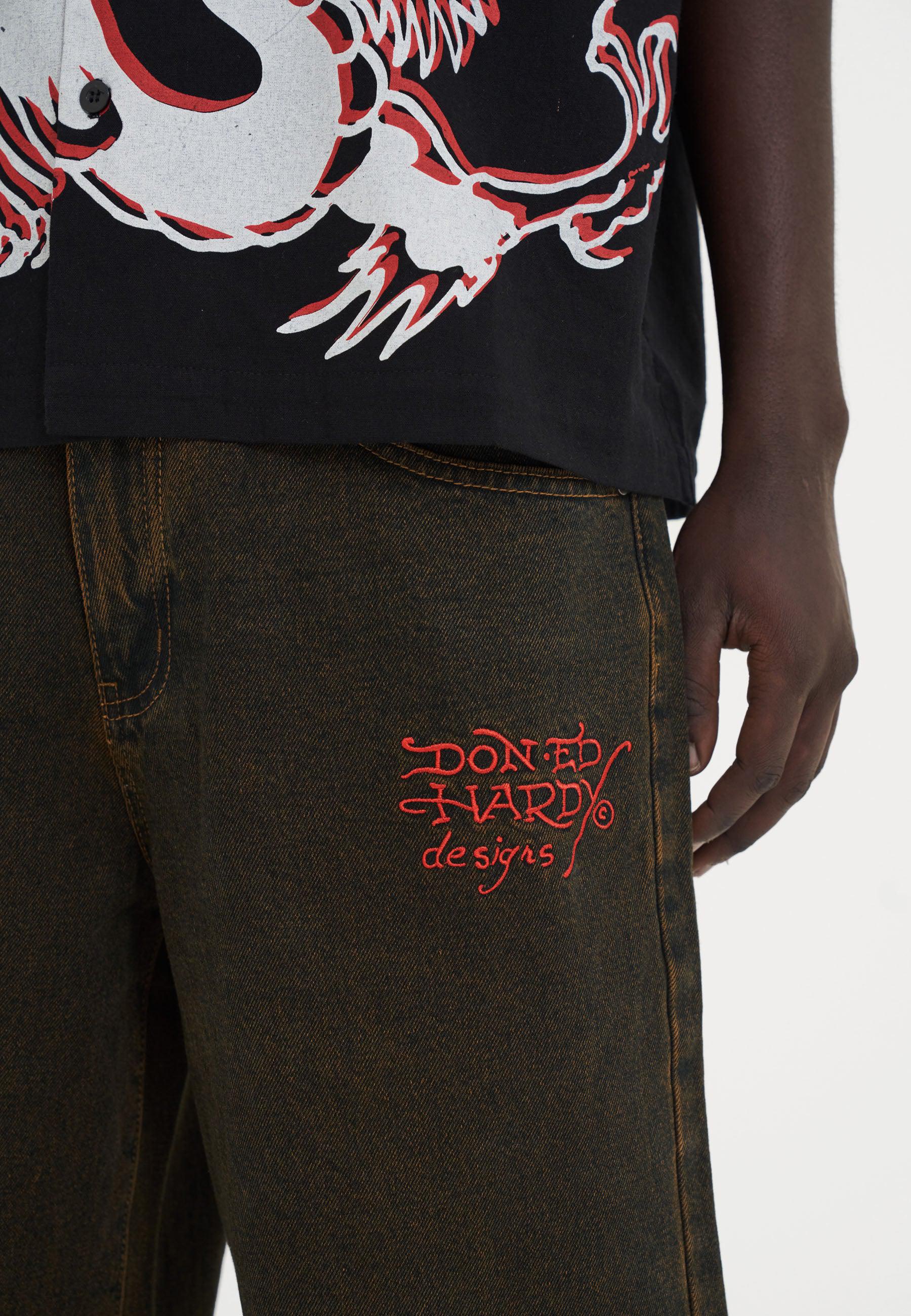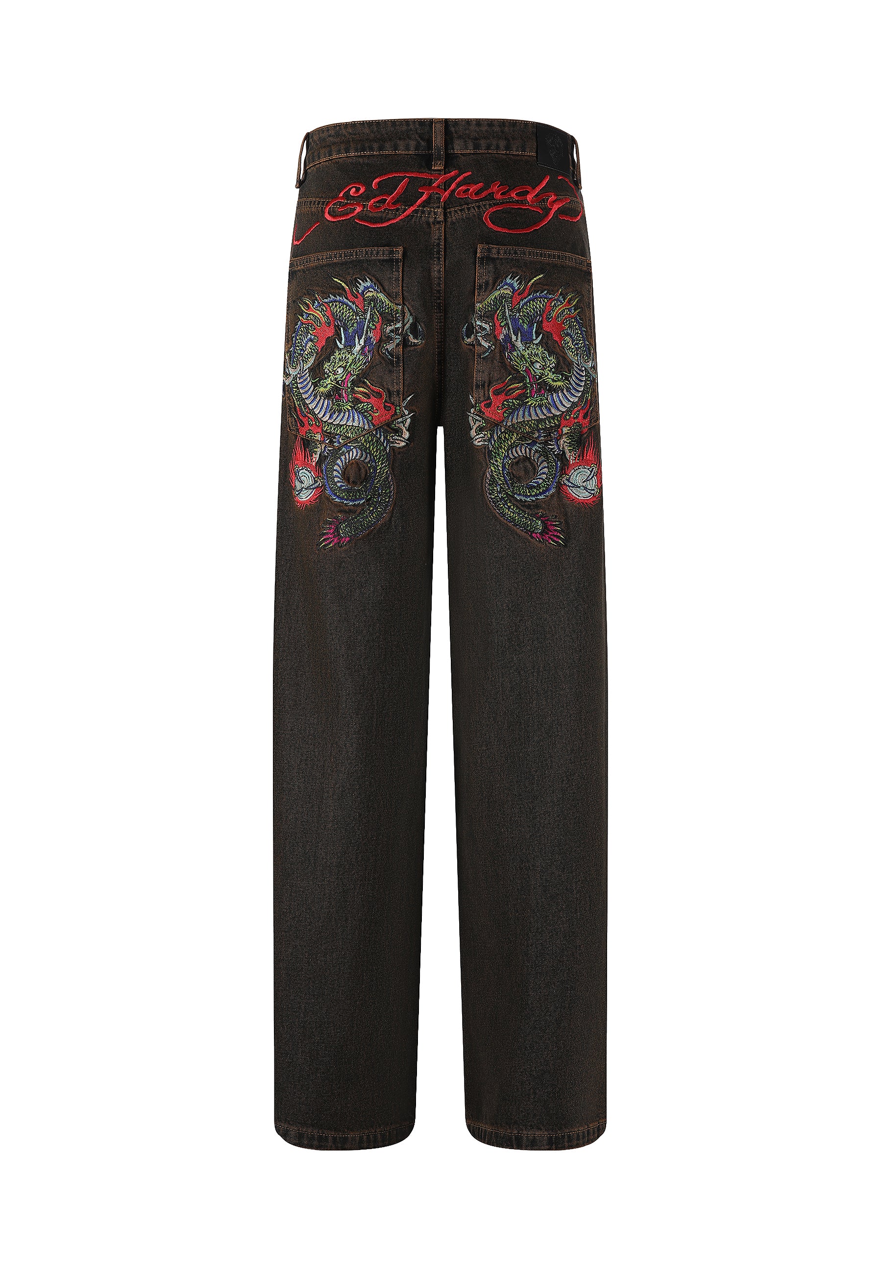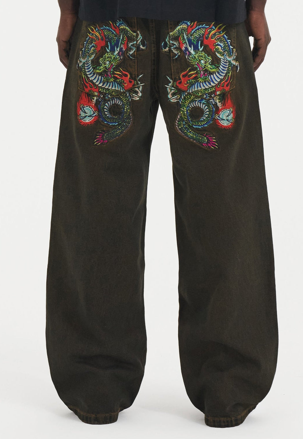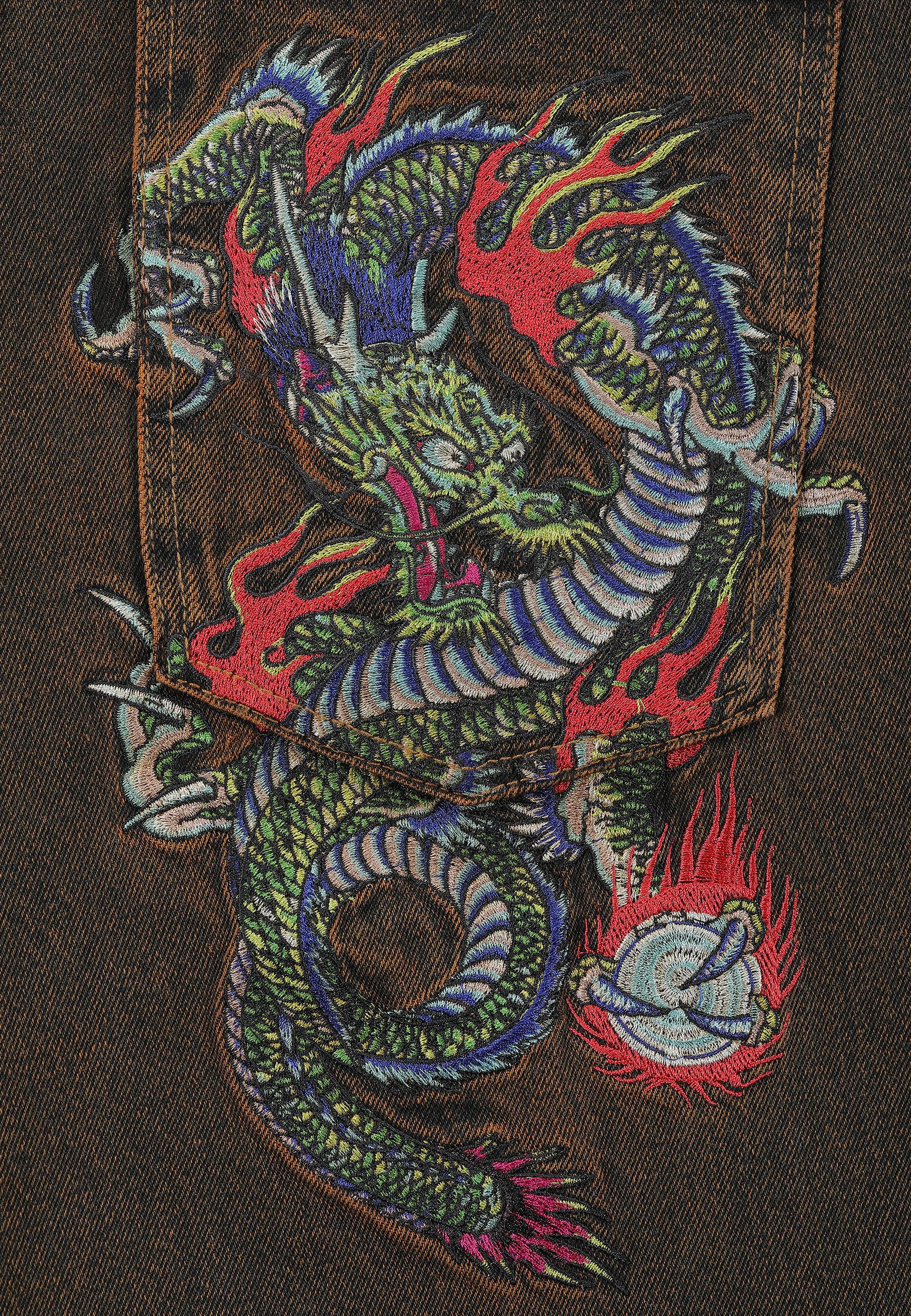 Ed's innovative design showcases a vibrant burst of full-colour intricate embroidery, creating a dynamic contrast against the backdrop of our fresh brown tint bleach wash in the Fireball Dragon Denim Jeans.