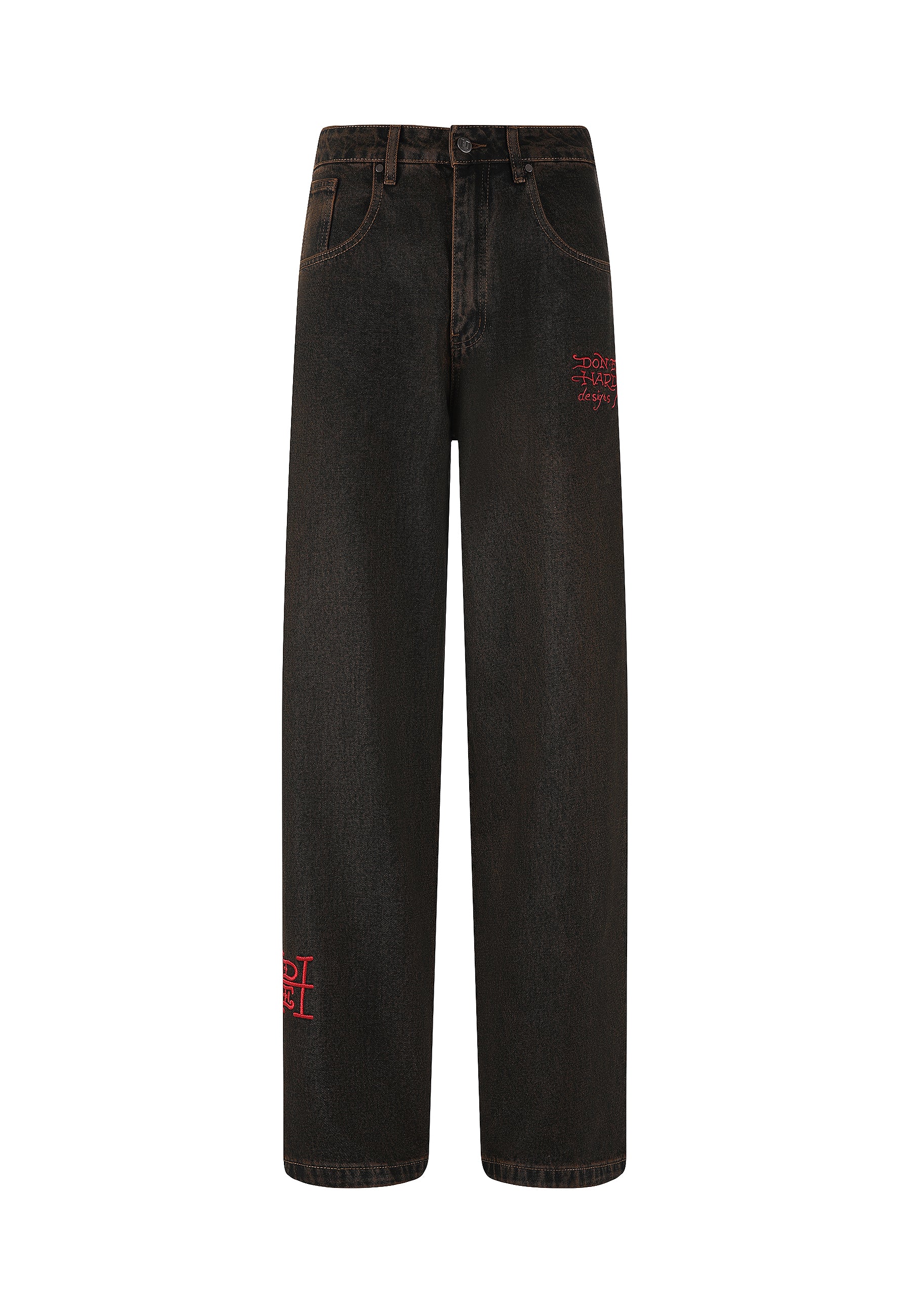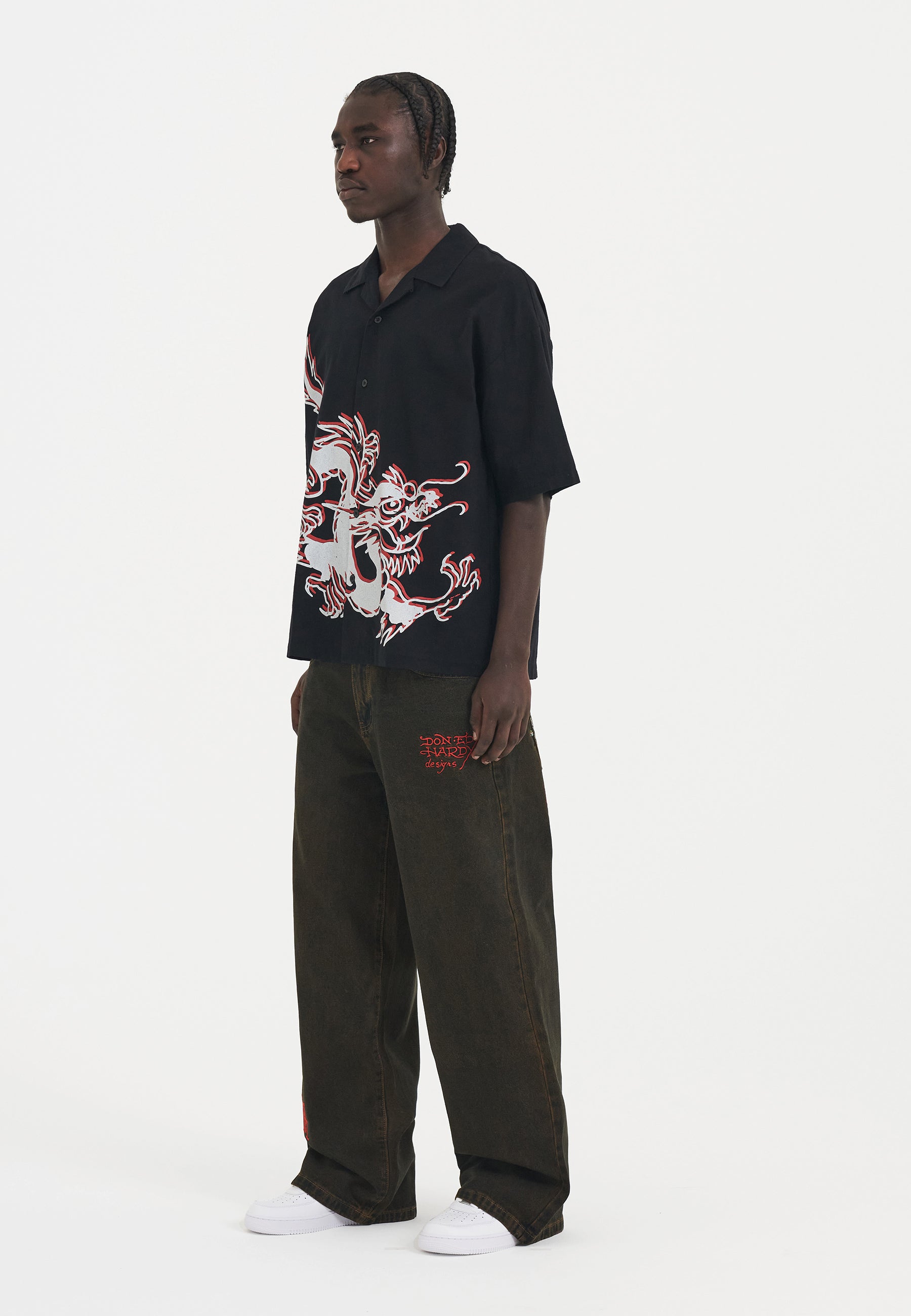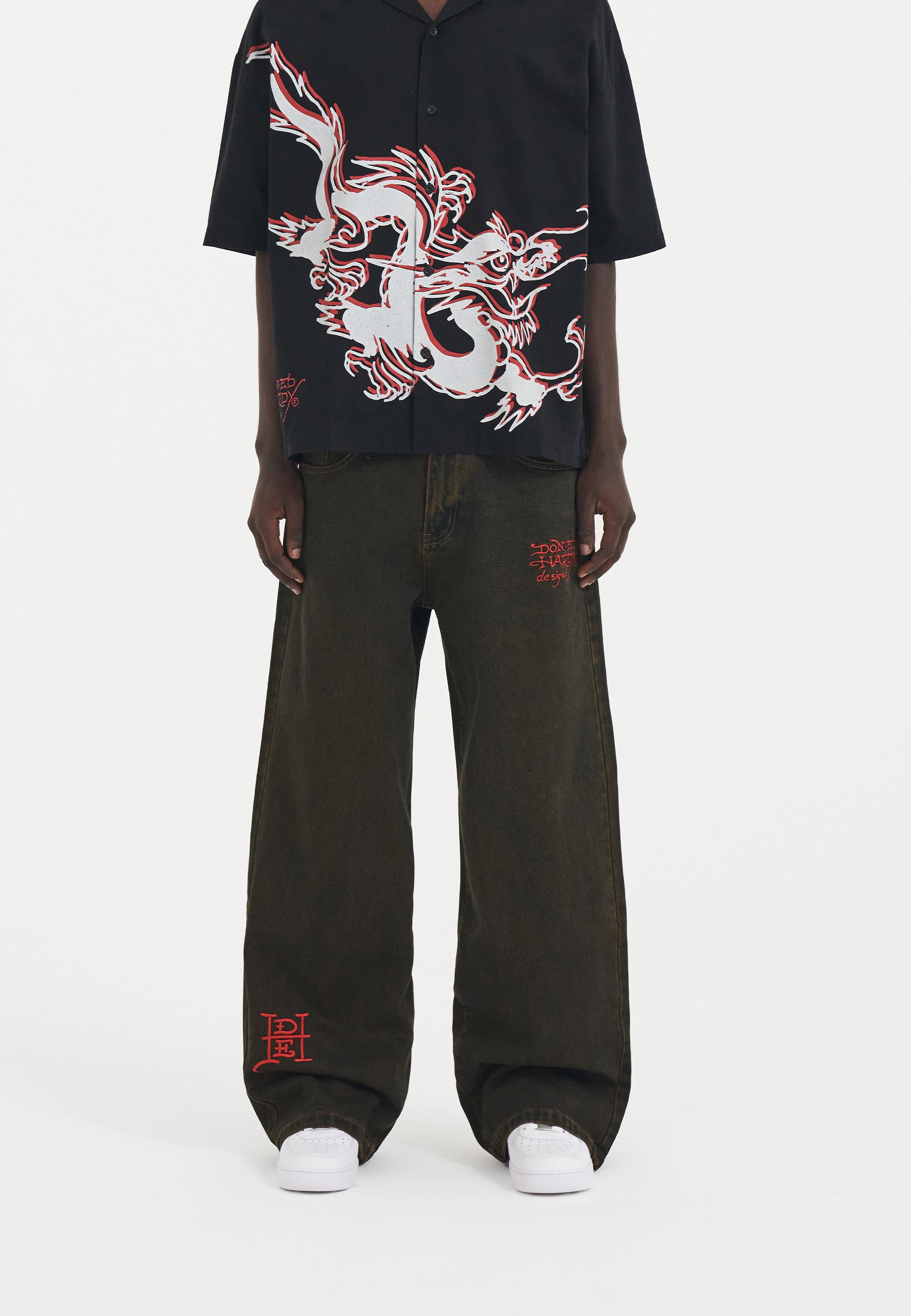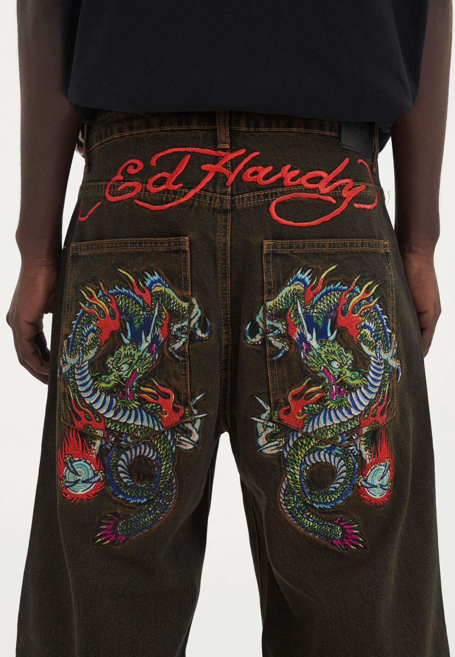 Ed's innovative design showcases a vibrant burst of full-colour intricate embroidery, creating a dynamic contrast against the backdrop of our fresh brown tint bleach wash in the Fireball Dragon Denim Jeans.