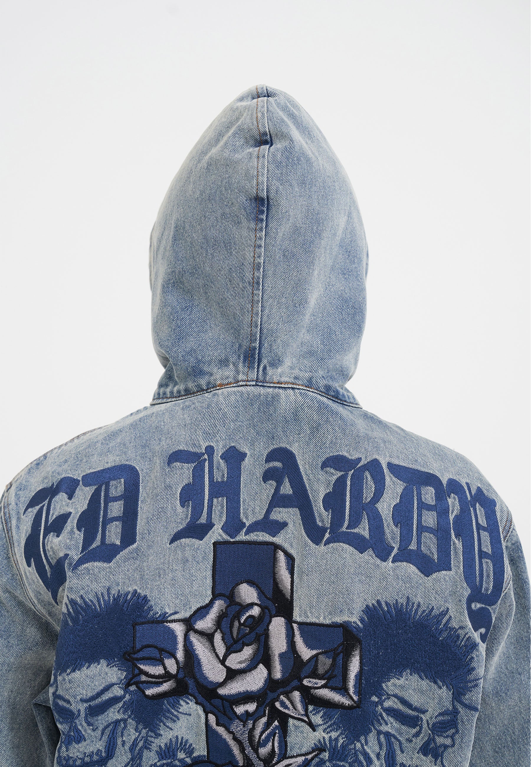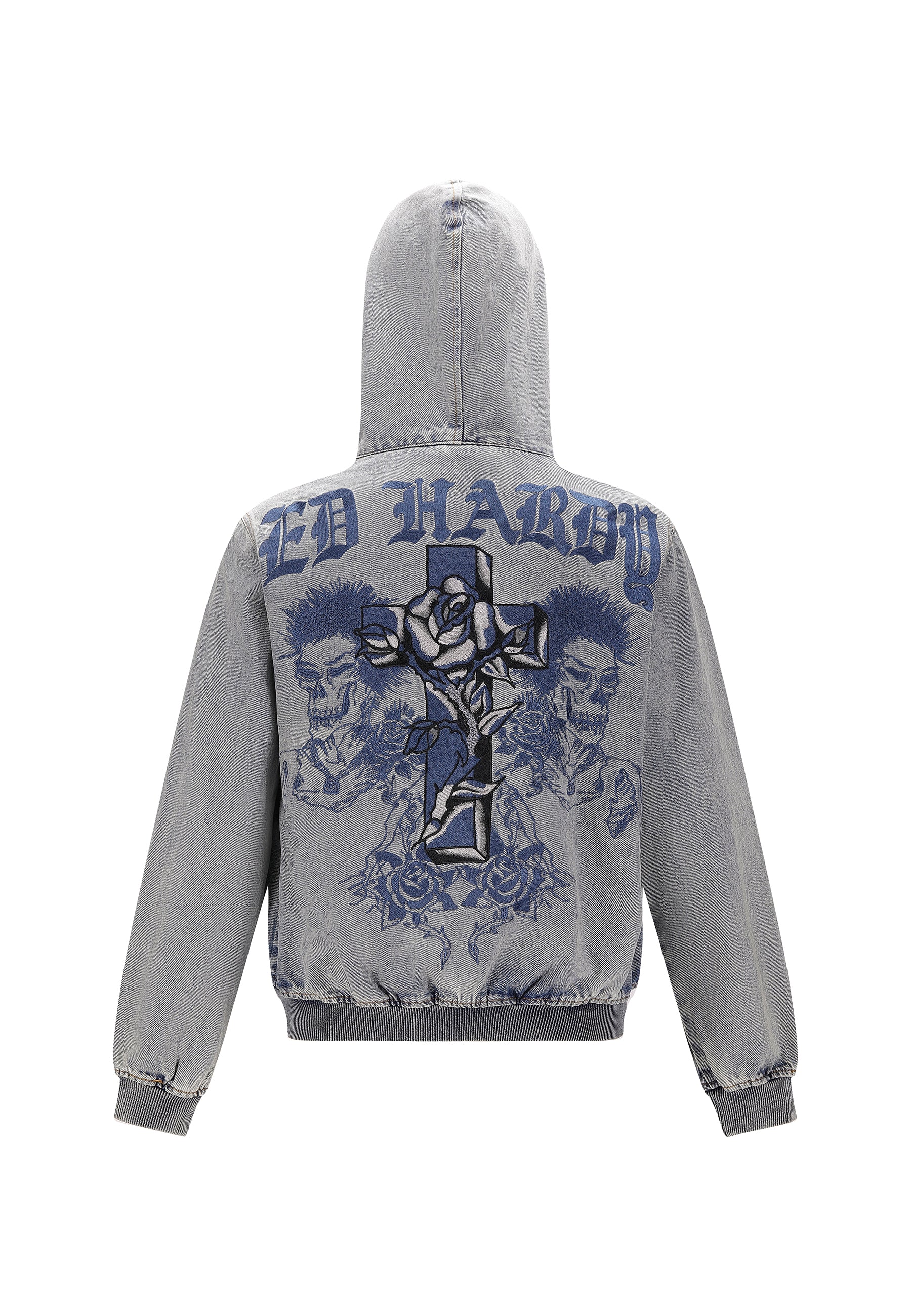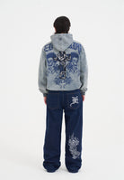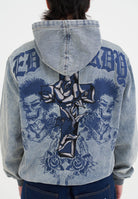 Mens Flaming Cross Denim Zip Thru Hoodie - Bleach