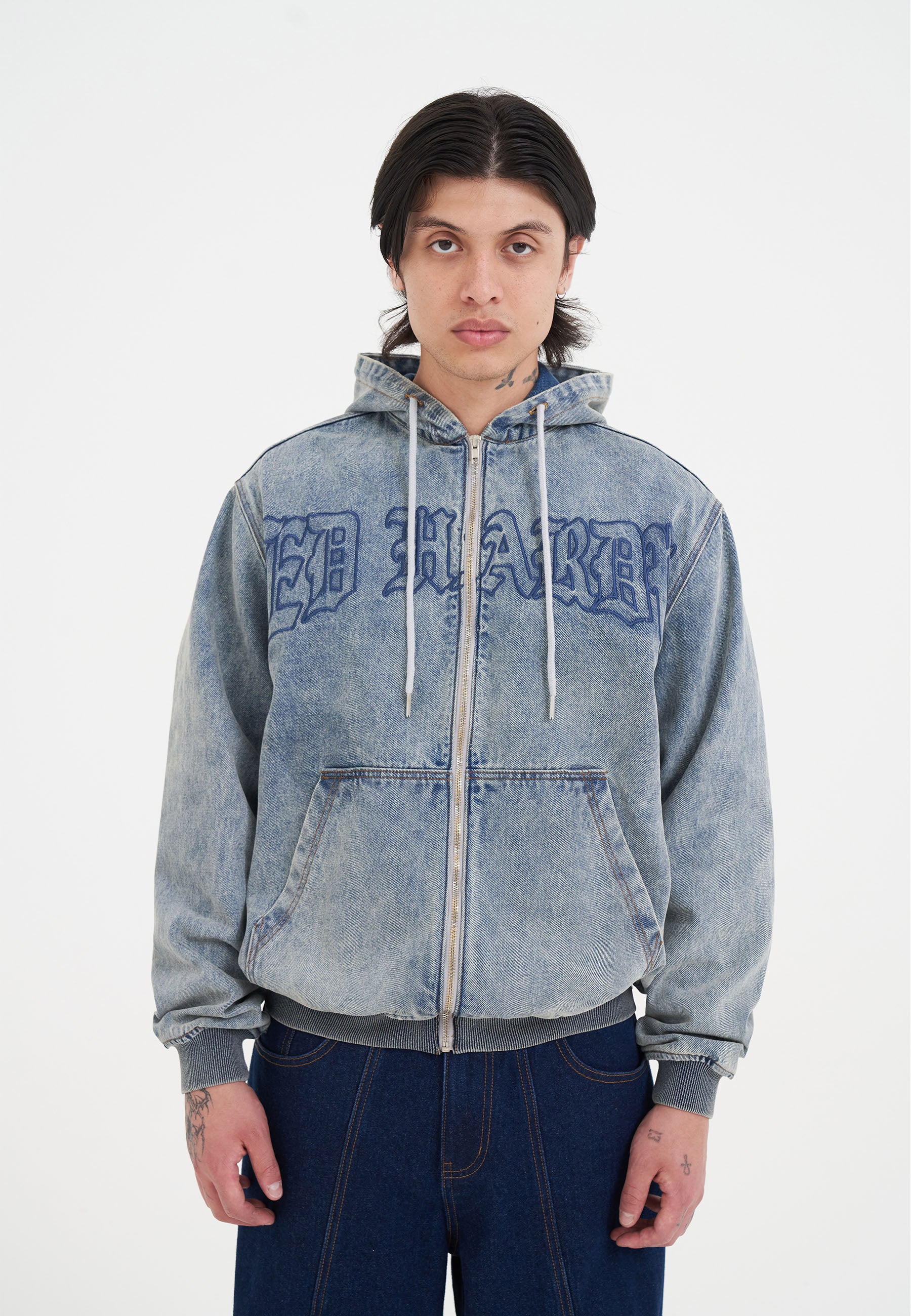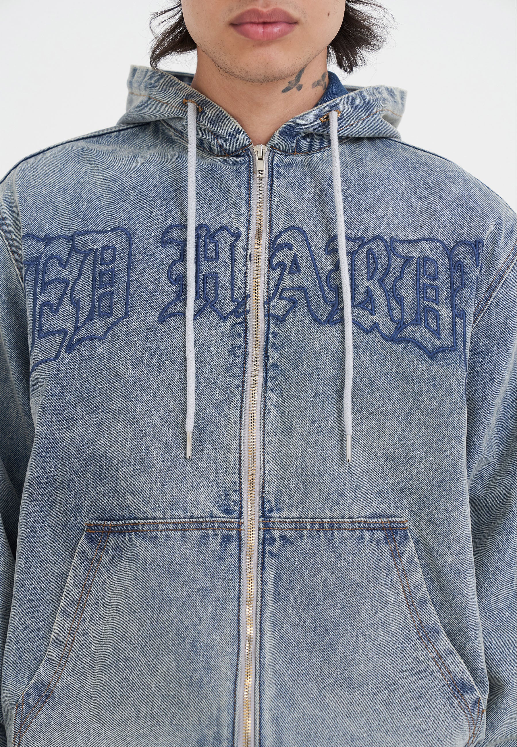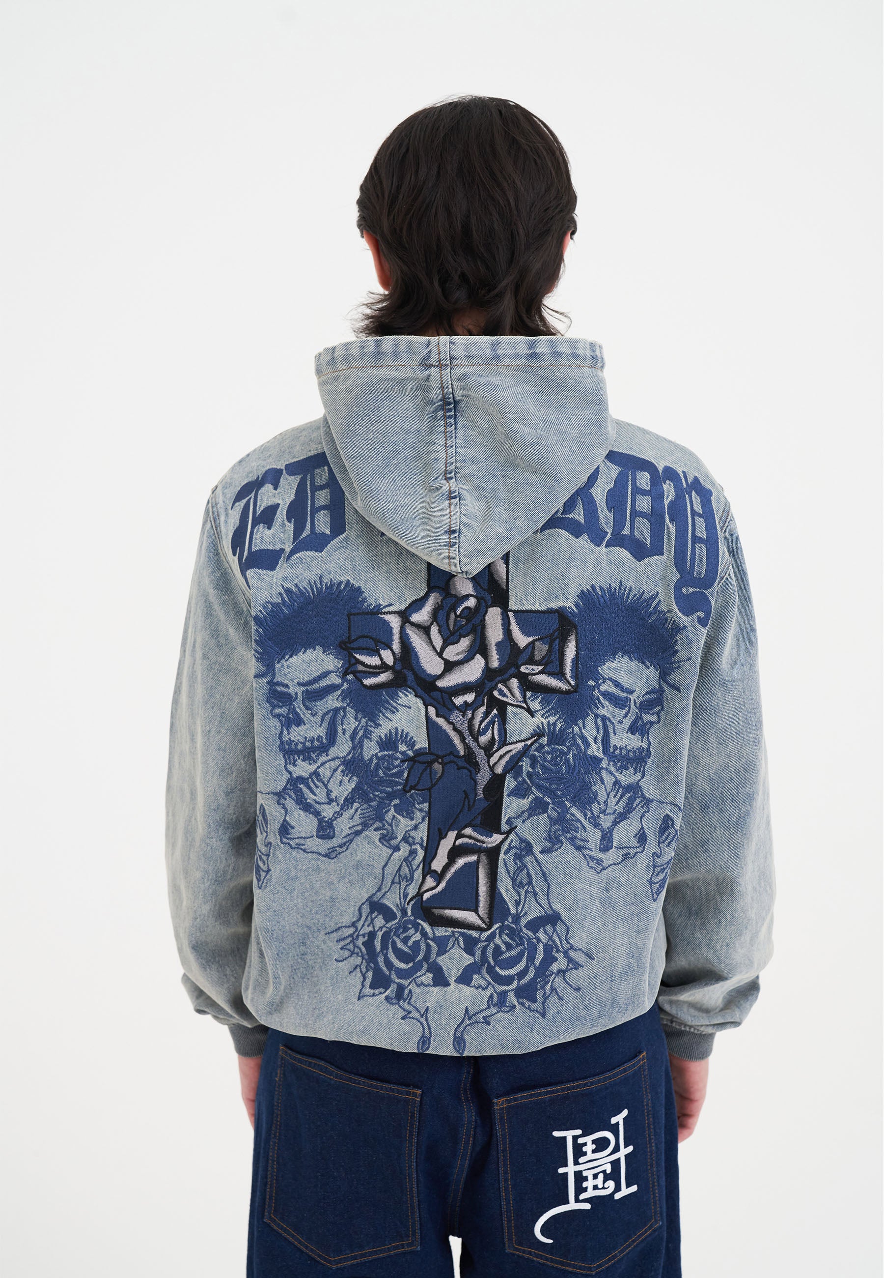 MENS FLAMING CROSS DENIM ZIP THRU HOODIE in Bleach