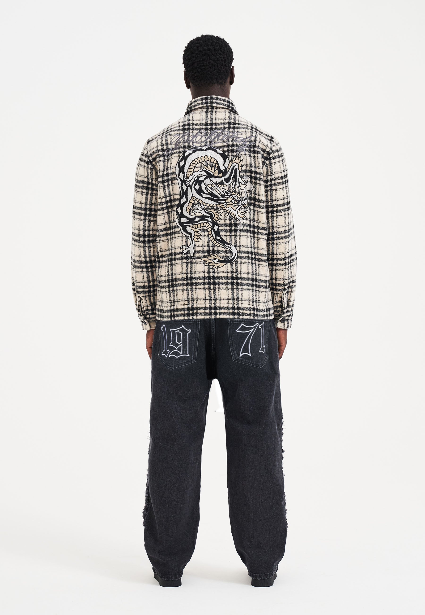 They feature a 3D appliqué patch on the yoke, frayed side seams, and the signature '1971' split across both legs. Redefine statement fashion.