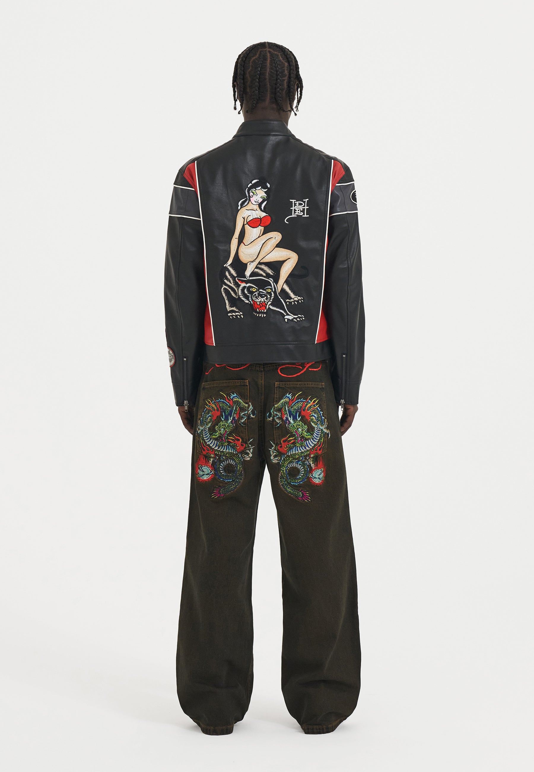 Introducing the Holly Panther Vegan Leather Motocross Jacket, crafted with premium quality and meticulous attention to detail, this jacket is the seasonal hero, paying homage to punk design, rebellion in creativity and enduring craftsmanship.