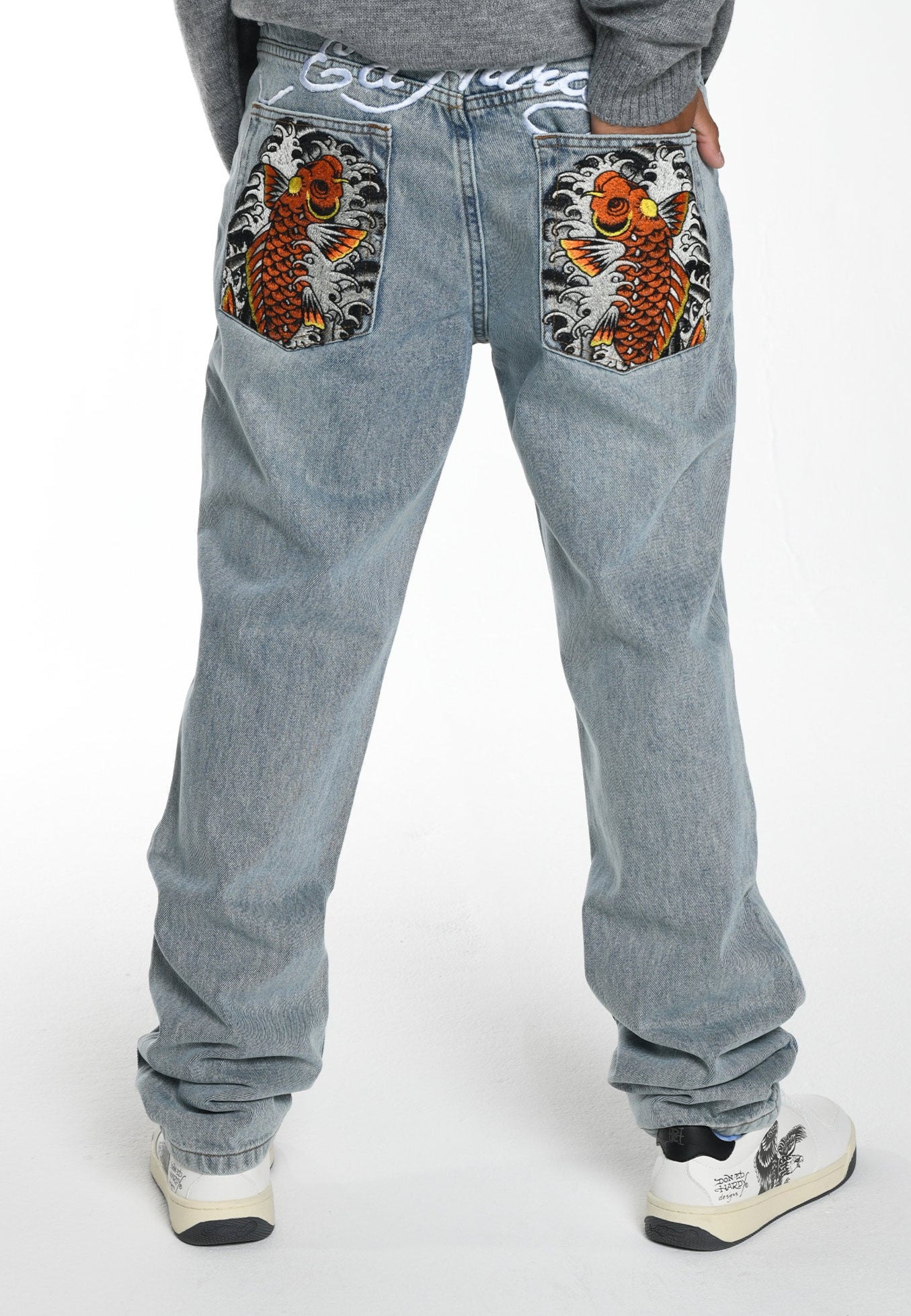Inspired by our vintage brand heritage, the Koi Merge Tattoo Jeans pay tribute to Ed Hardy's past, reimagined with intricate full-colour embroidery to set a new era in Ed Hardy fashion.