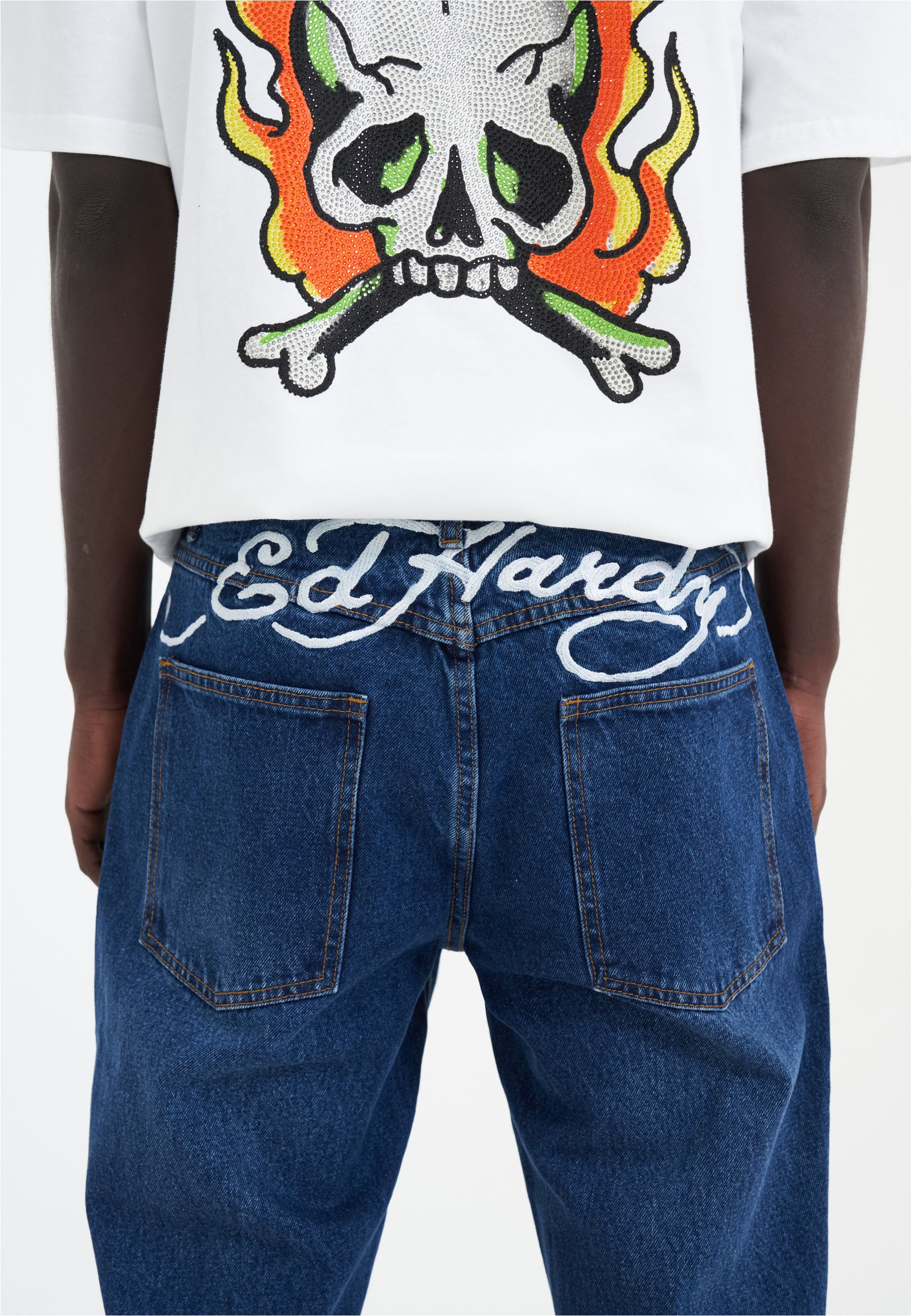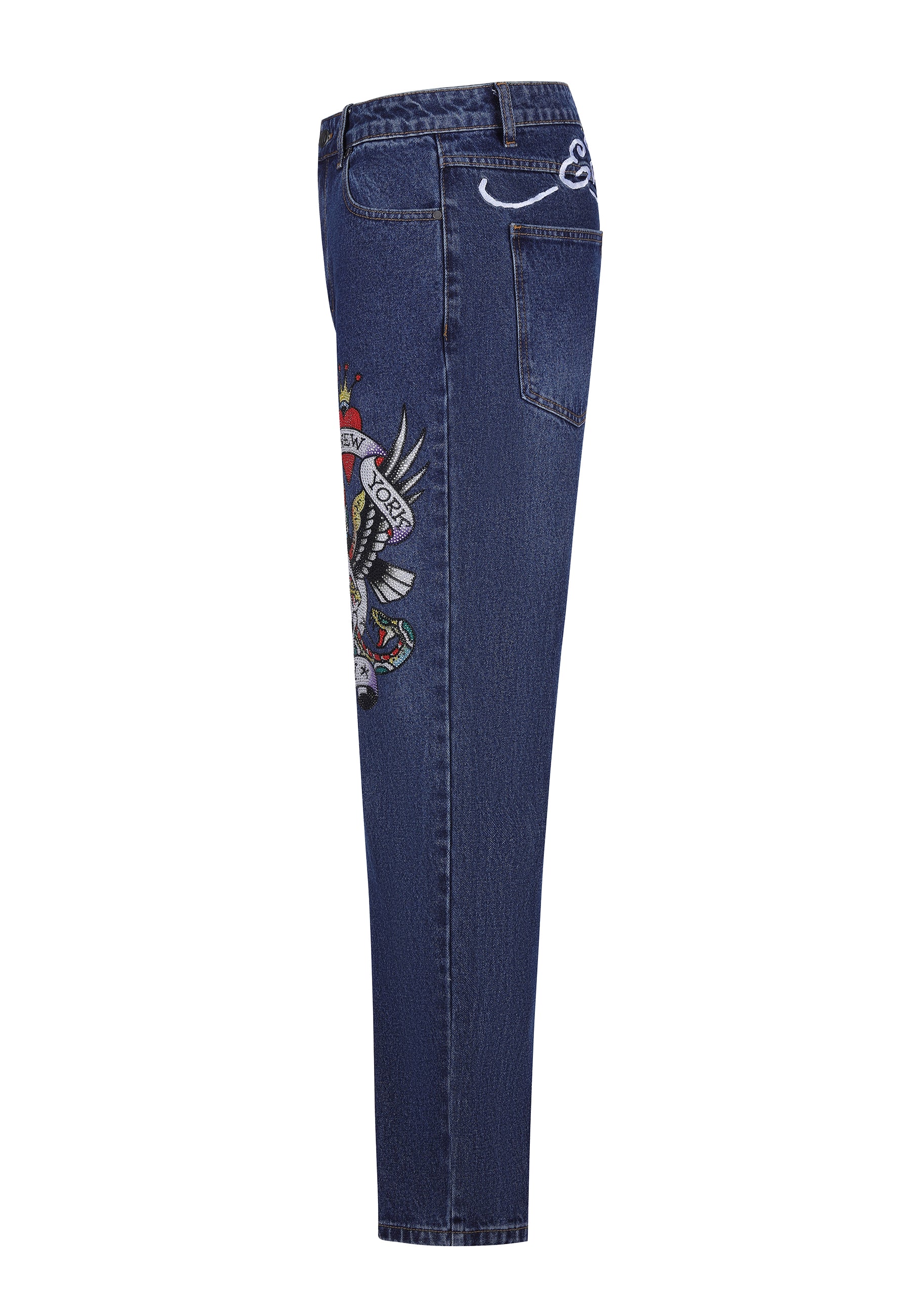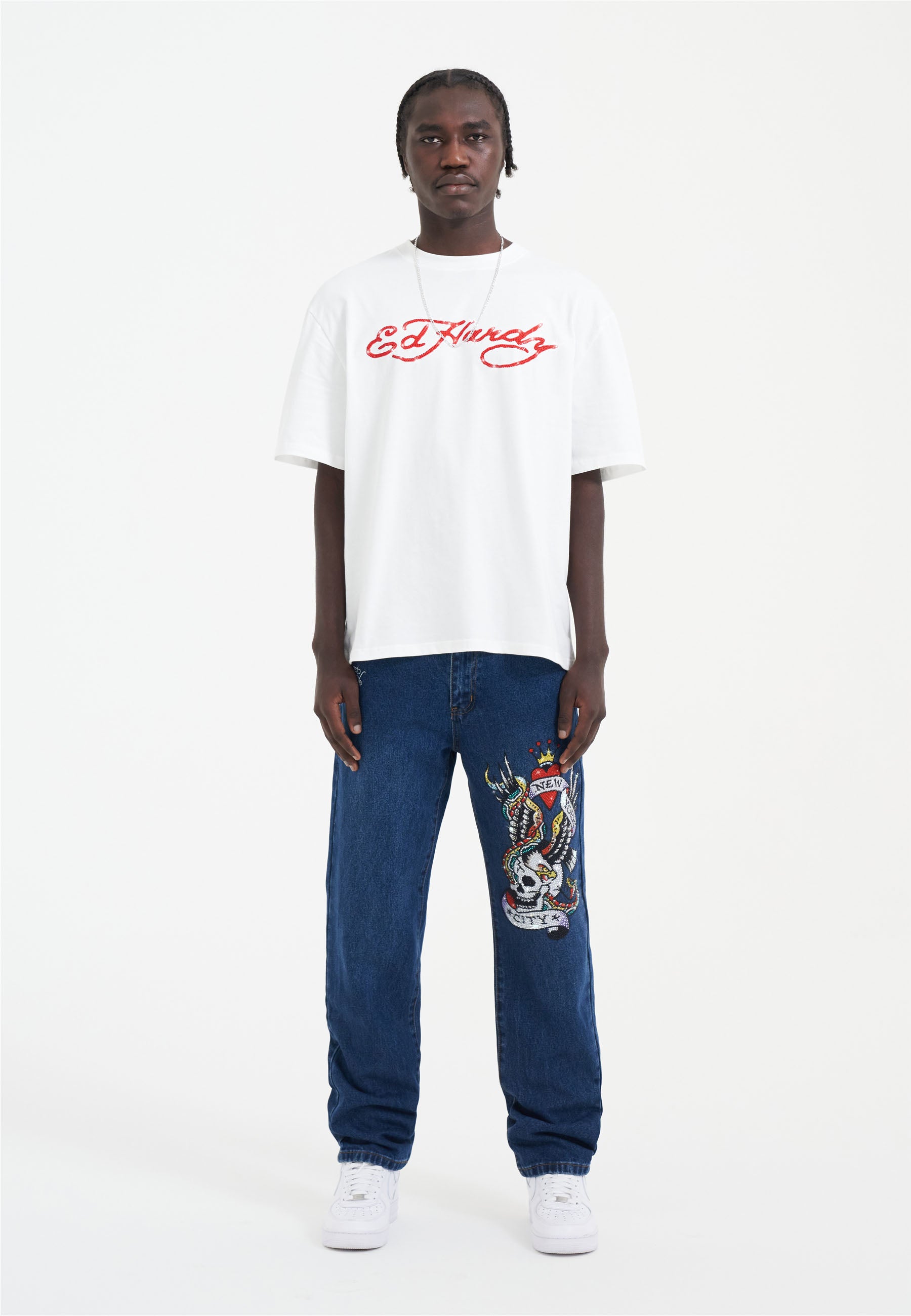 The Men's NYC Skull Jeans are adorned with a striking full-colour diamante graphic of the NYC Skull on the front leg and back logo placement.