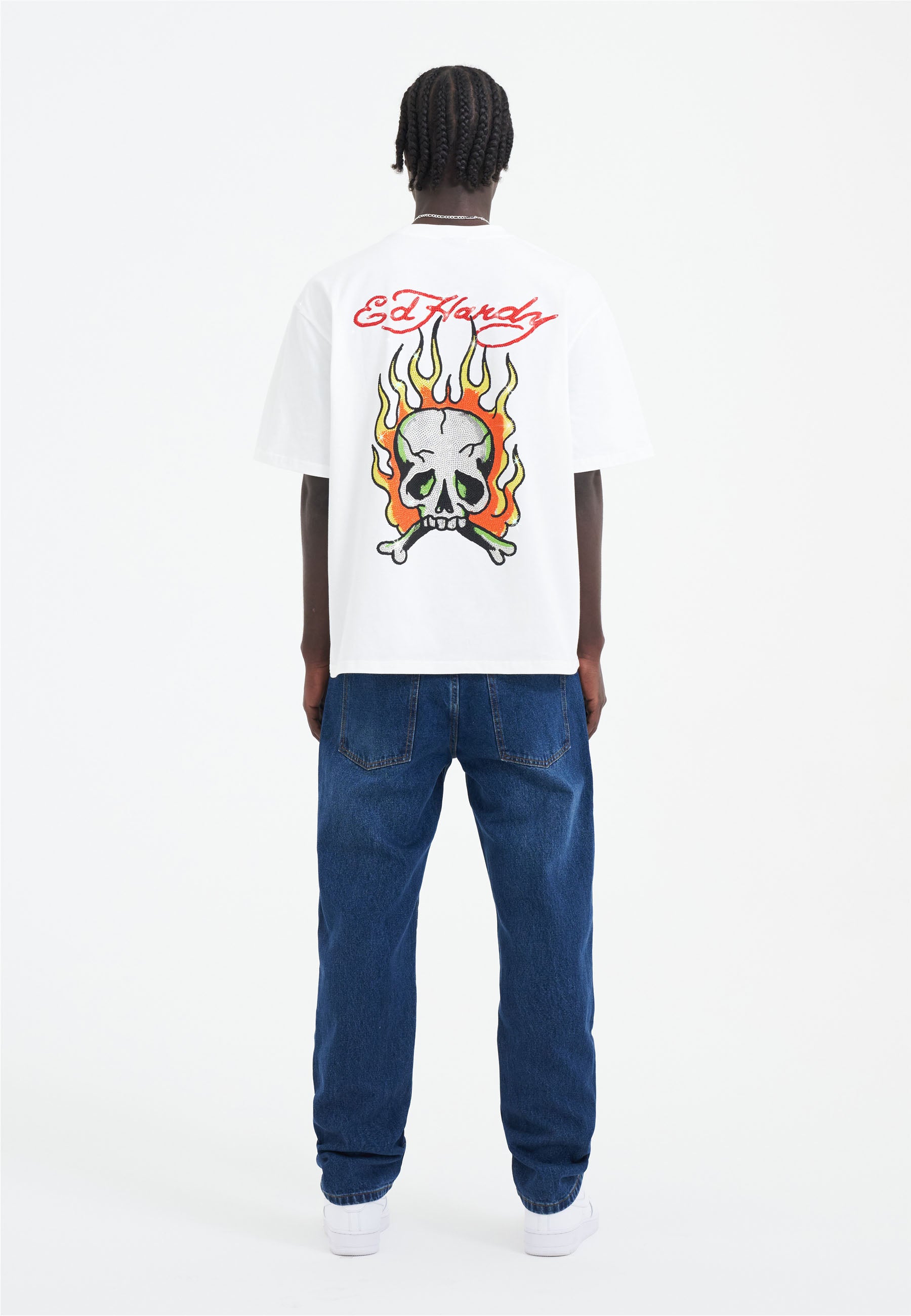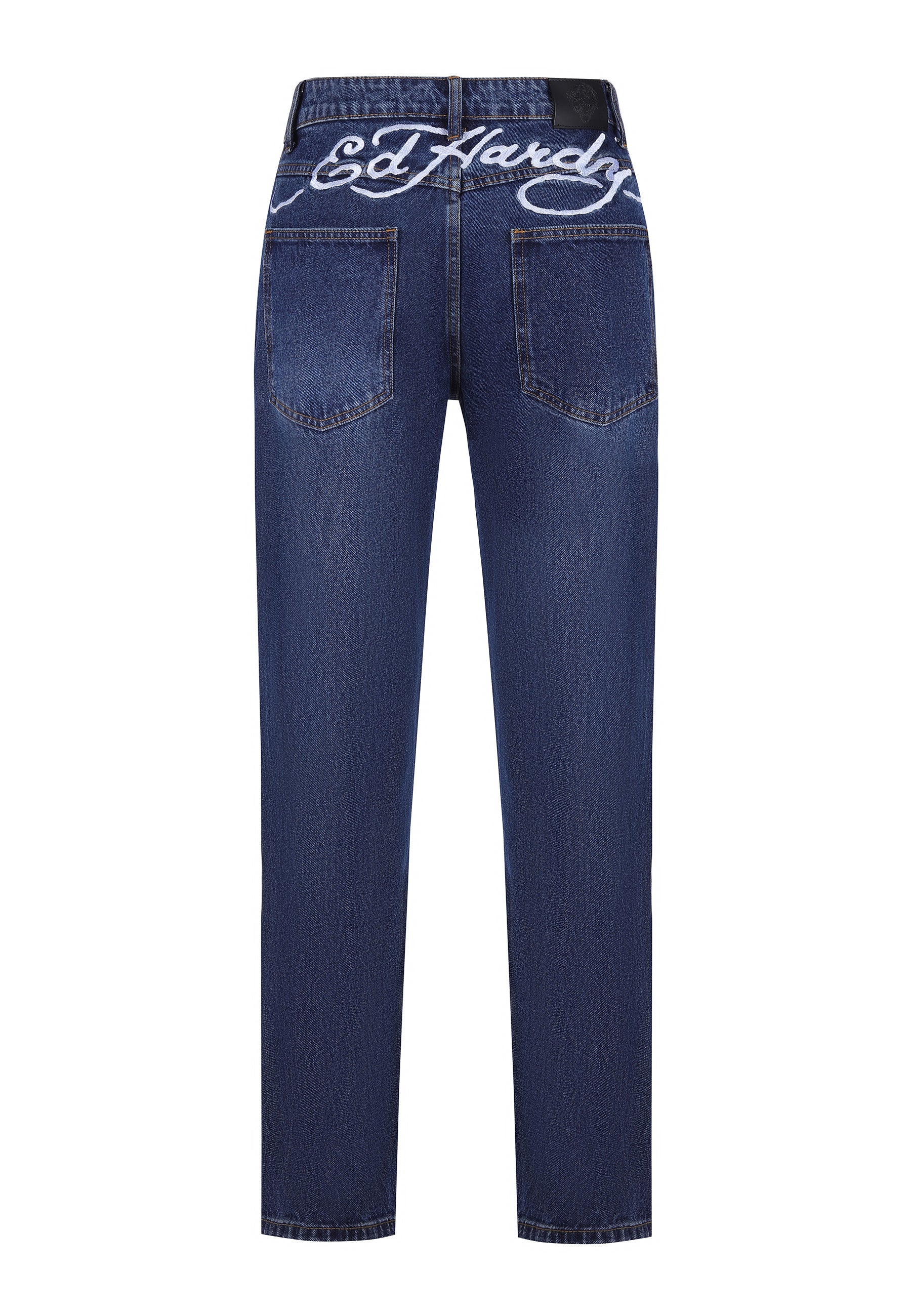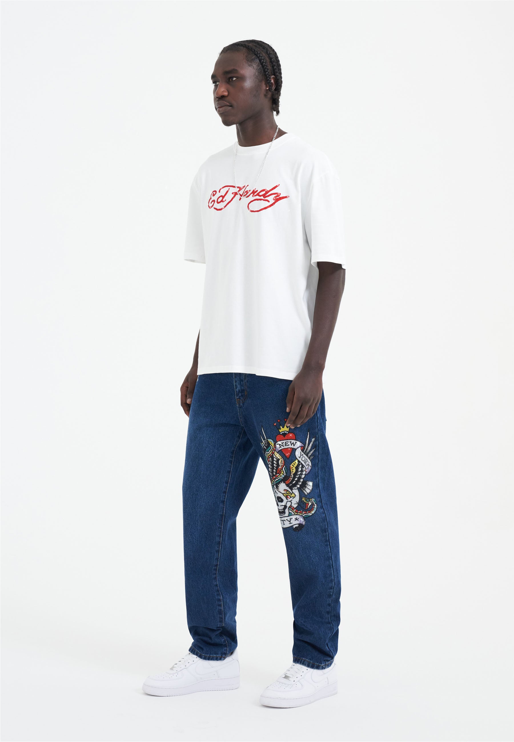 The Men's NYC Skull Jeans are adorned with a striking full-colour diamante graphic of the NYC Skull on the front leg and back logo placement.