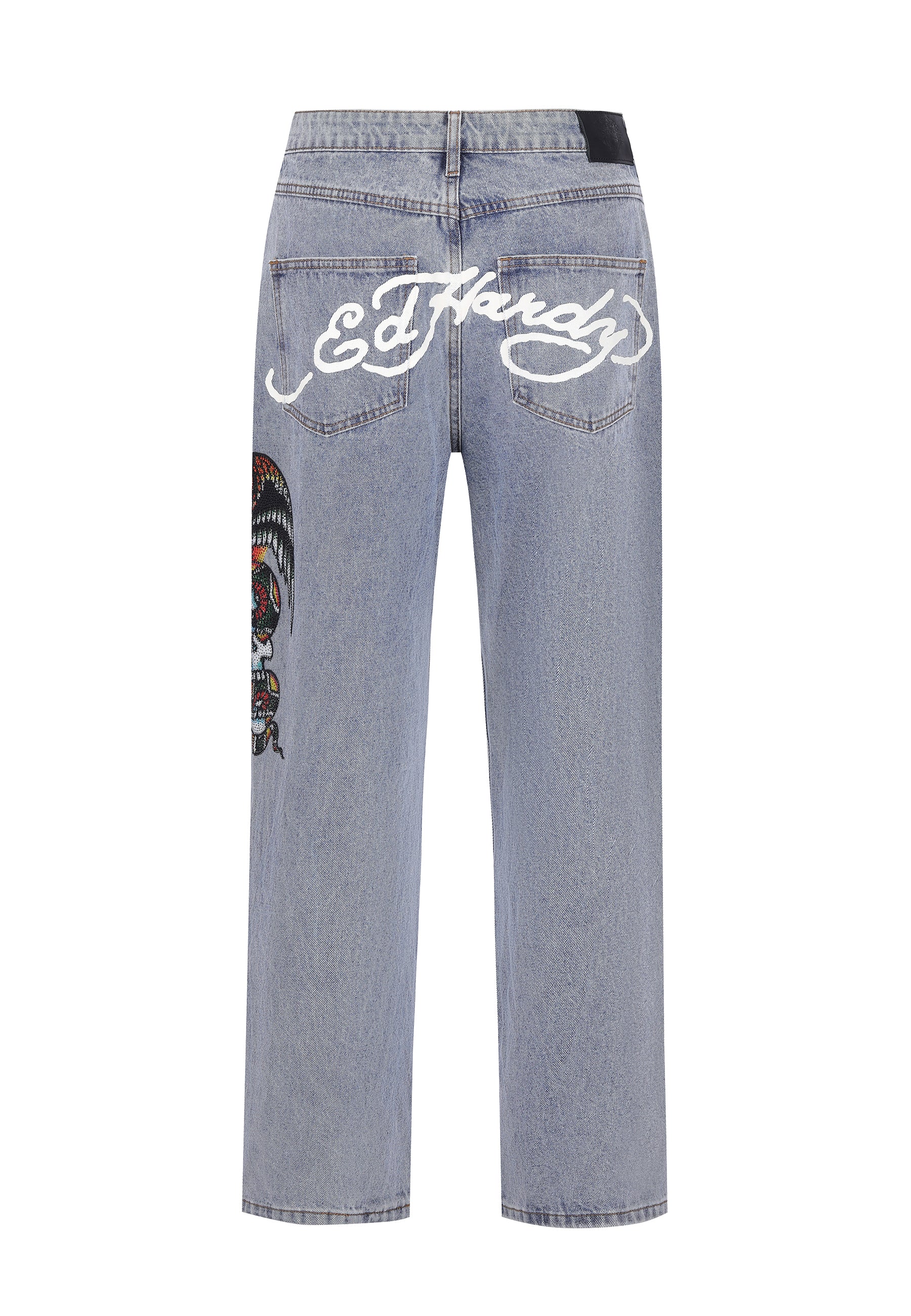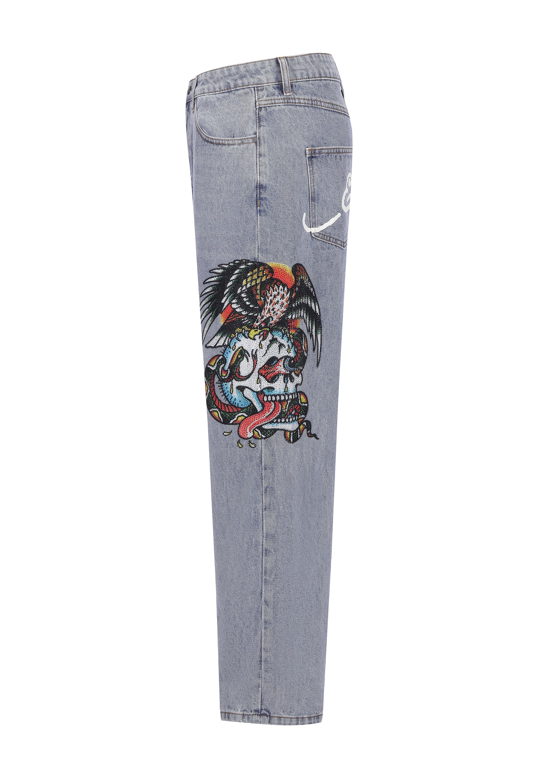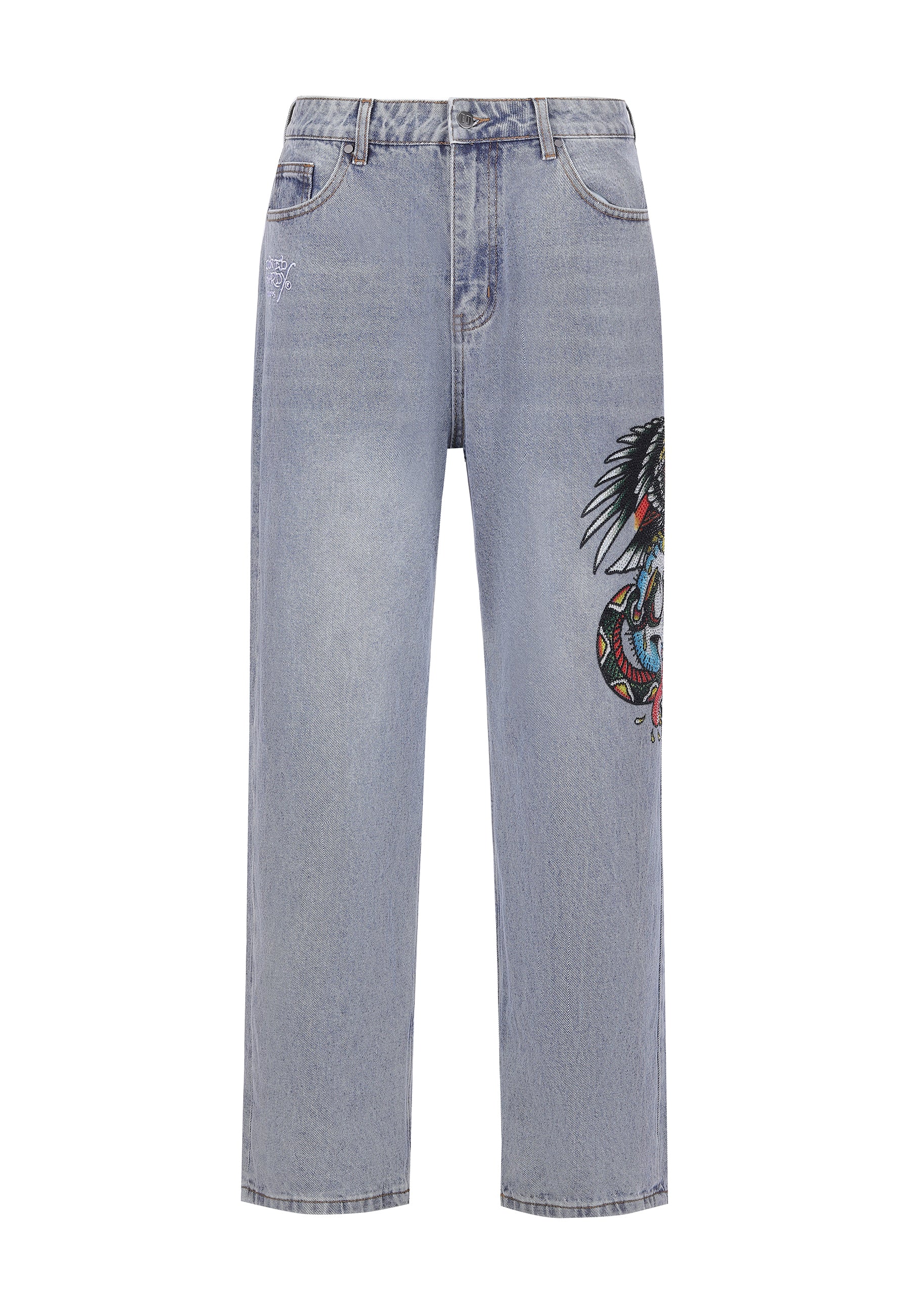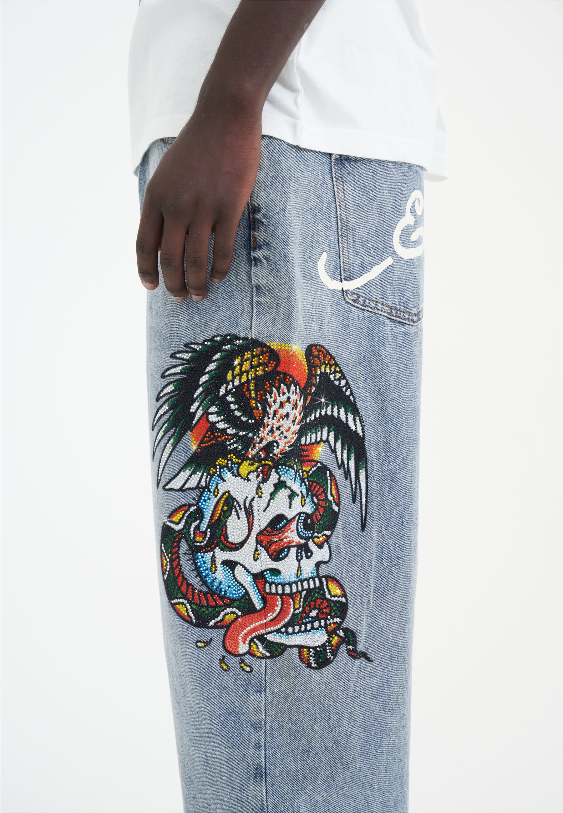 The Skull, Snake and Eagle Jean showcase Ed's legendary graphics reimagined in vibrant full-colour diamante patches on the leg and back logo placement.