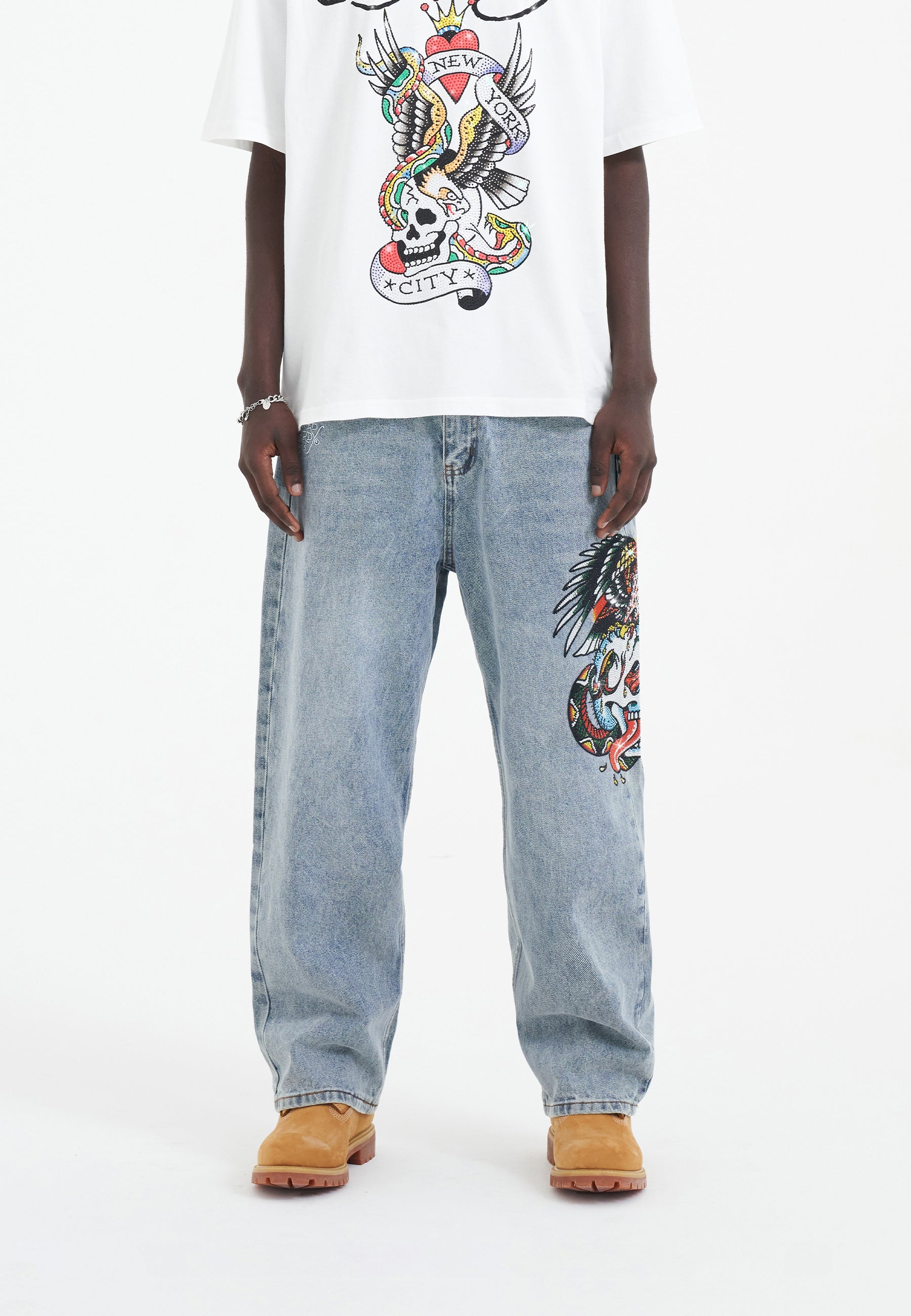 Mens Skull-Snake-Eagle Diamante Denim Trousers Jeans - Bleach
