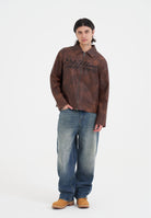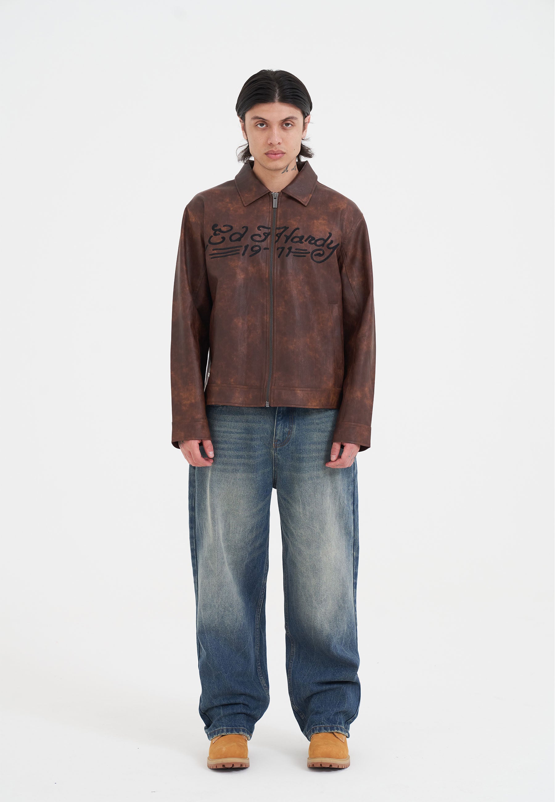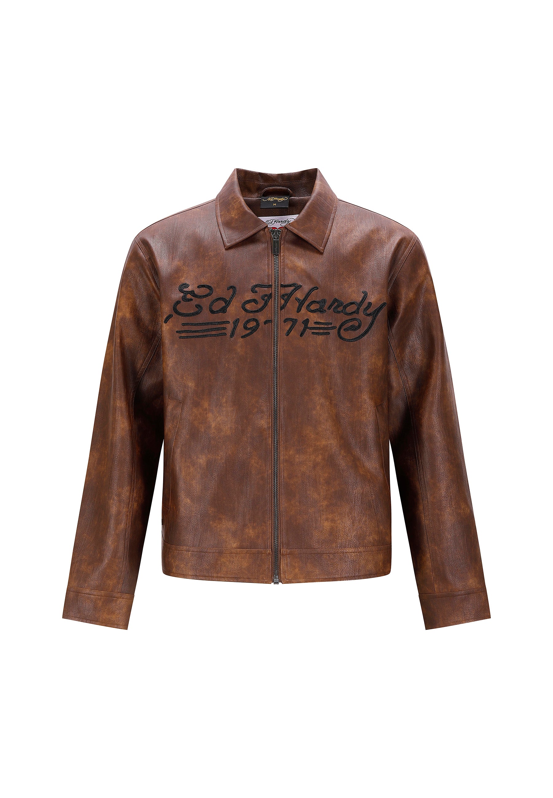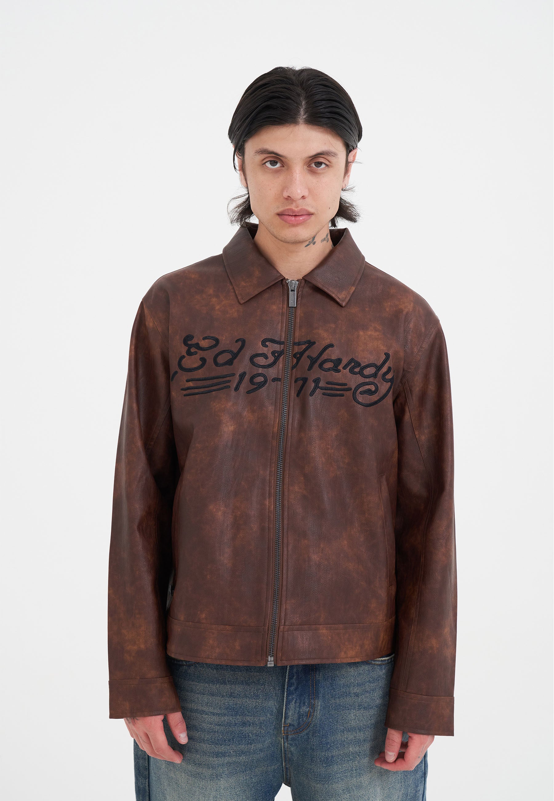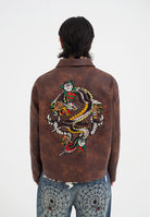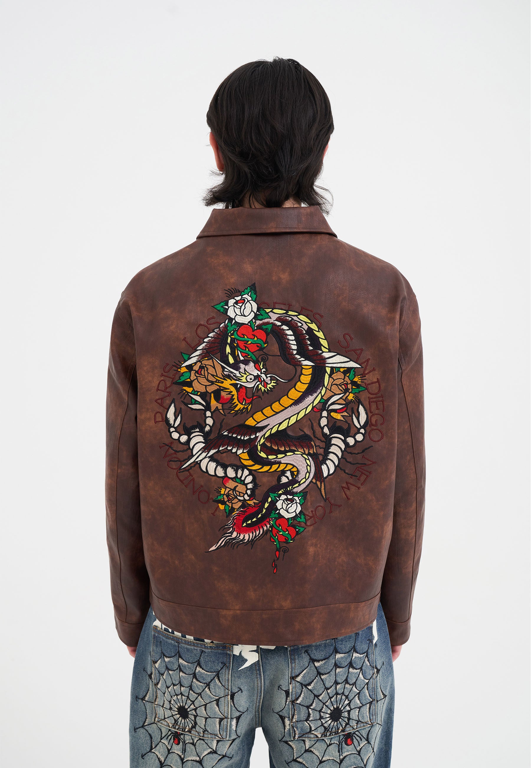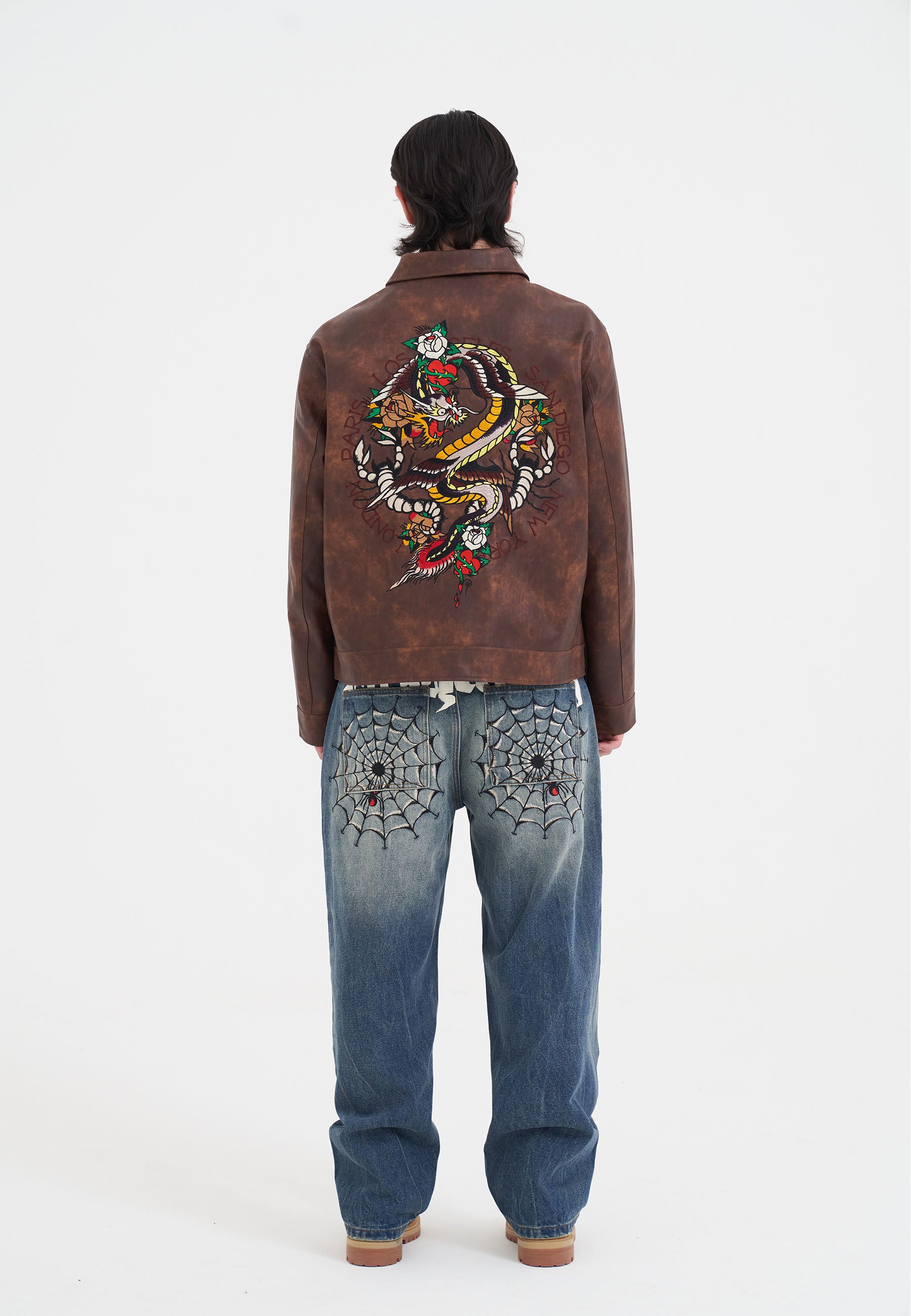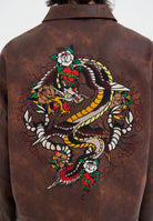 MENS SOARING SNAKE CIRCLE ZIP THRU VEGAN LEATHER JACKET in Brown