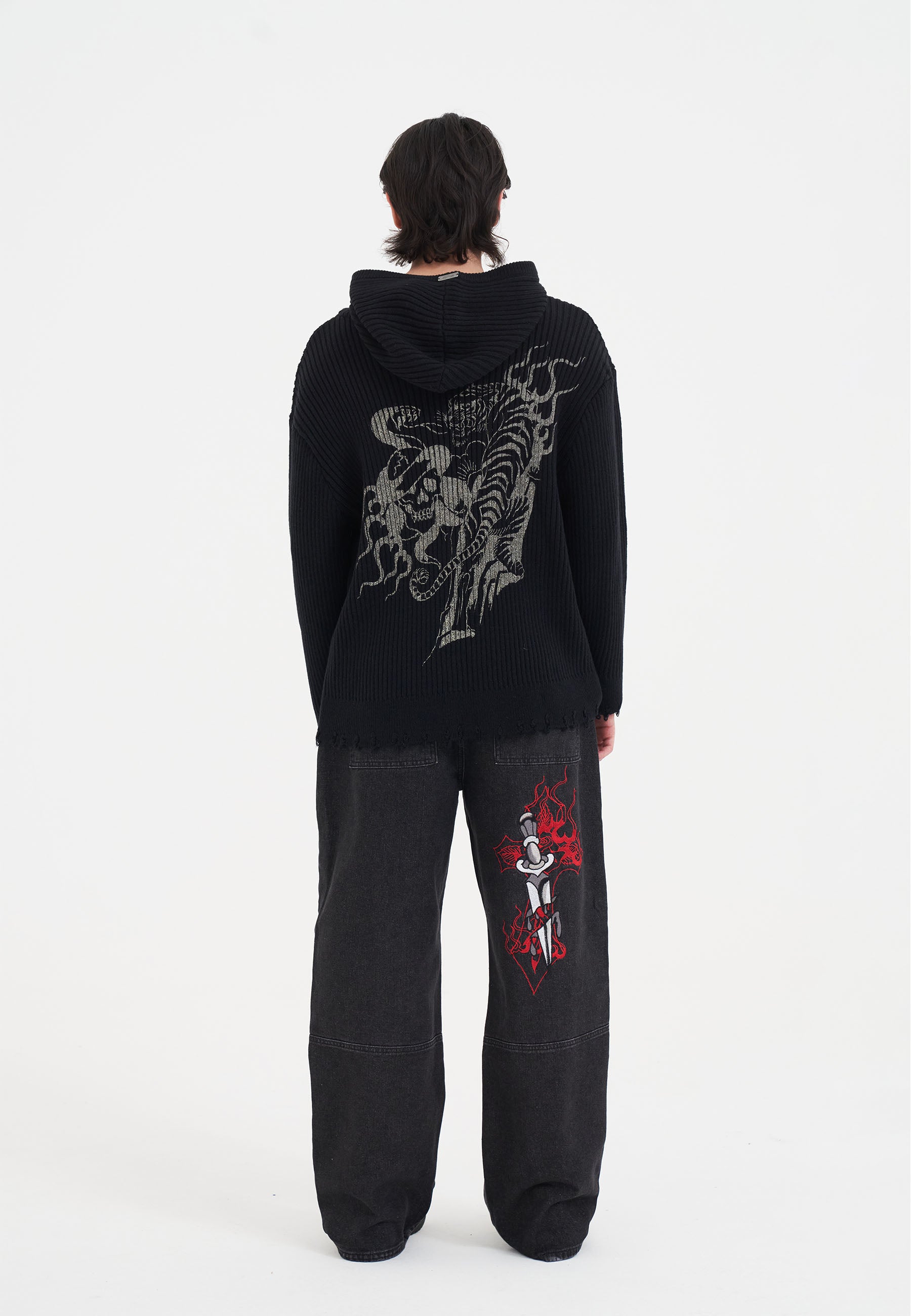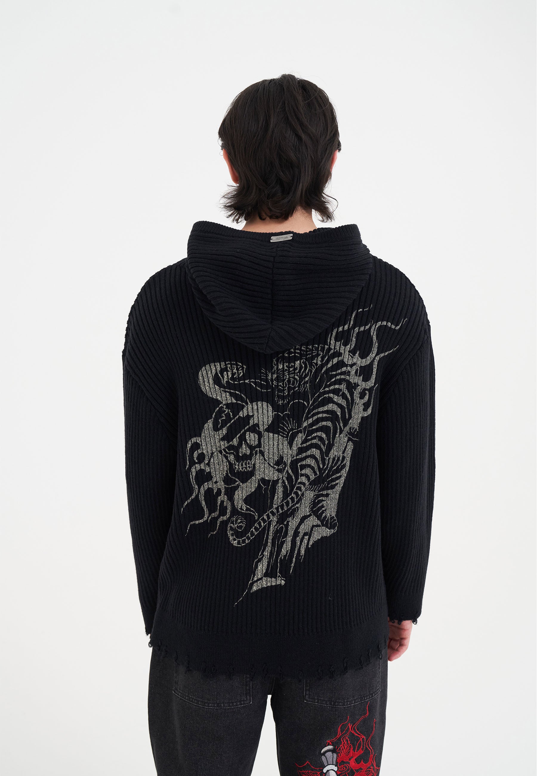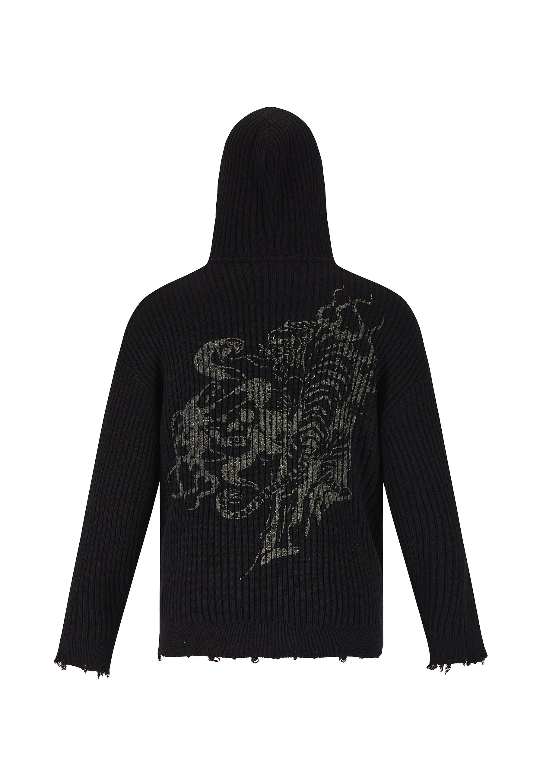 MENS TIGER AND SNAKE IN FLAMES KNITTED HOODIE in Black