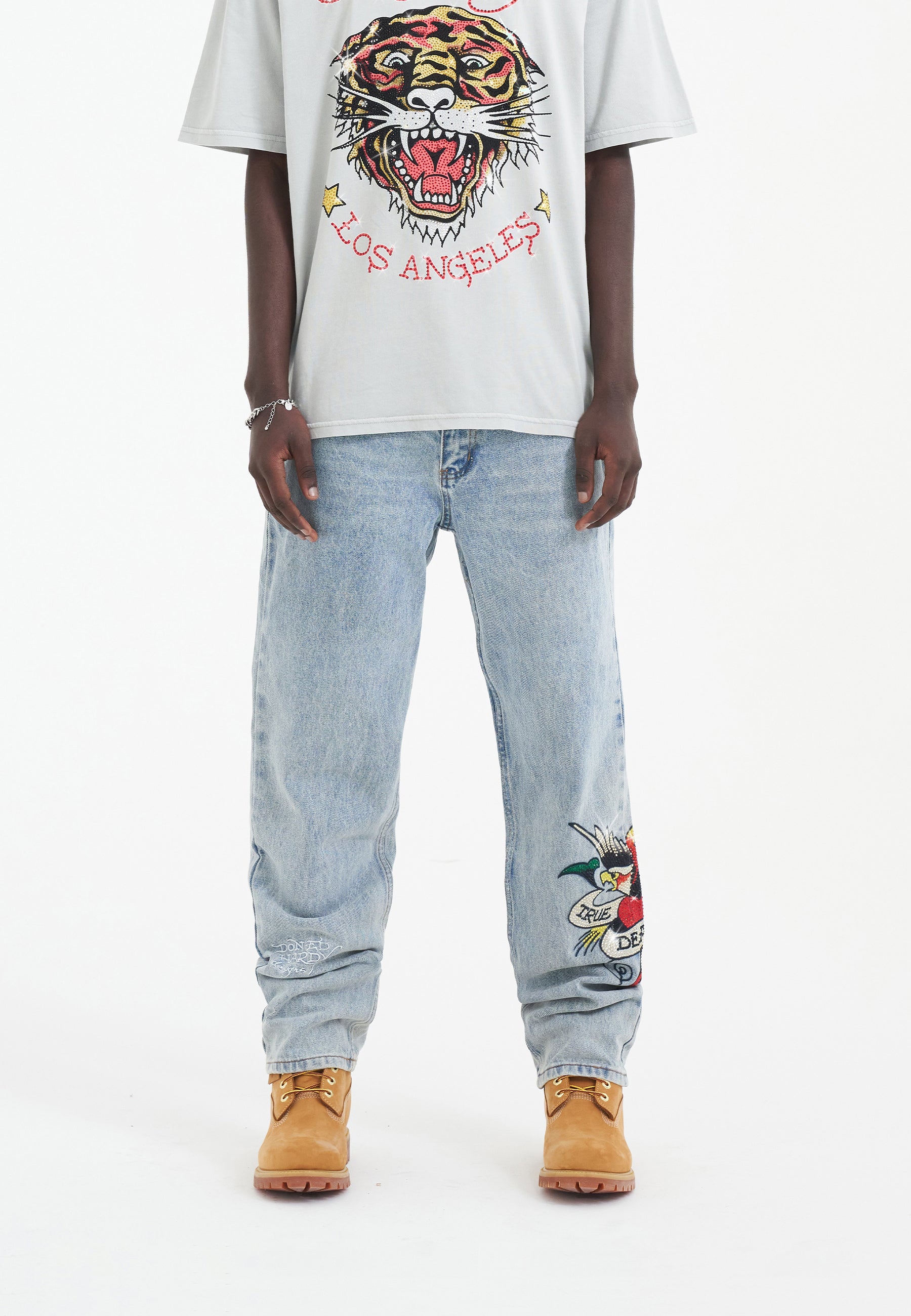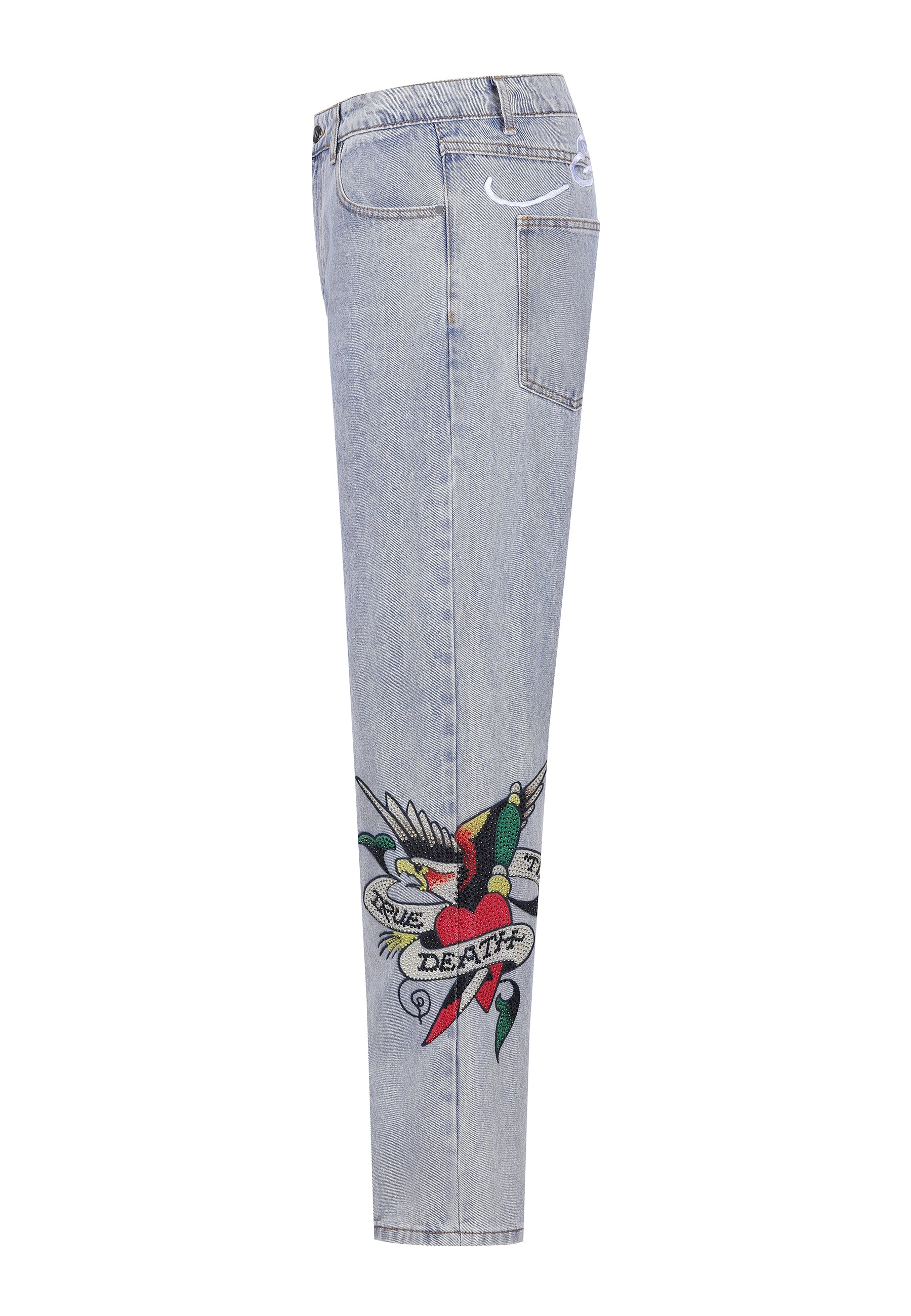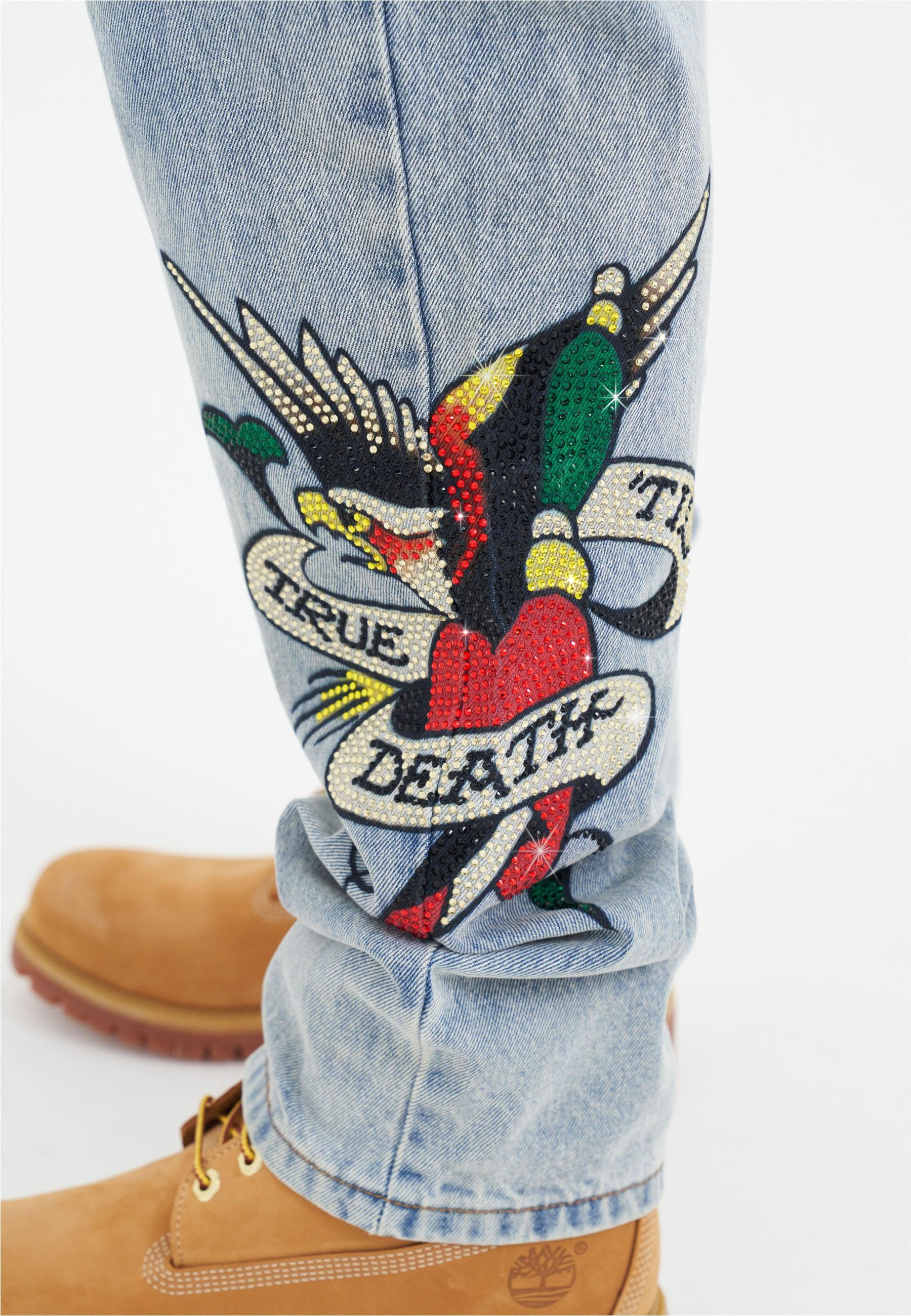 Mens True-Till-Death Diamante Denim Trousers Jeans - Bleach