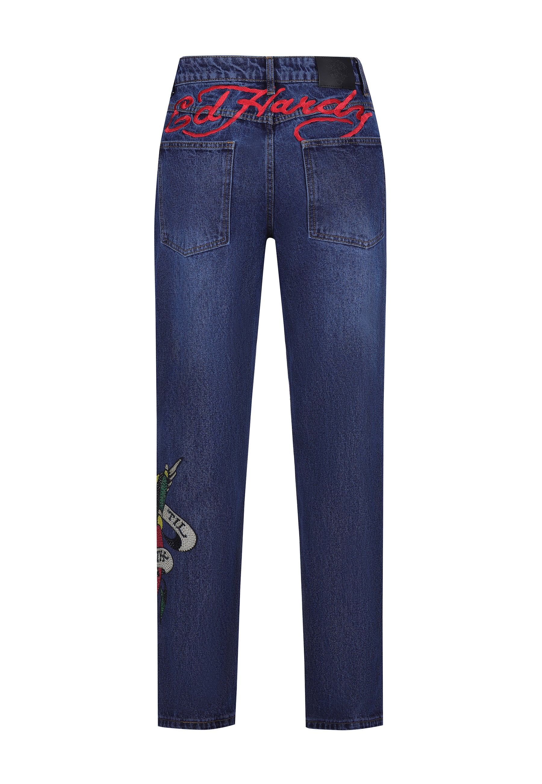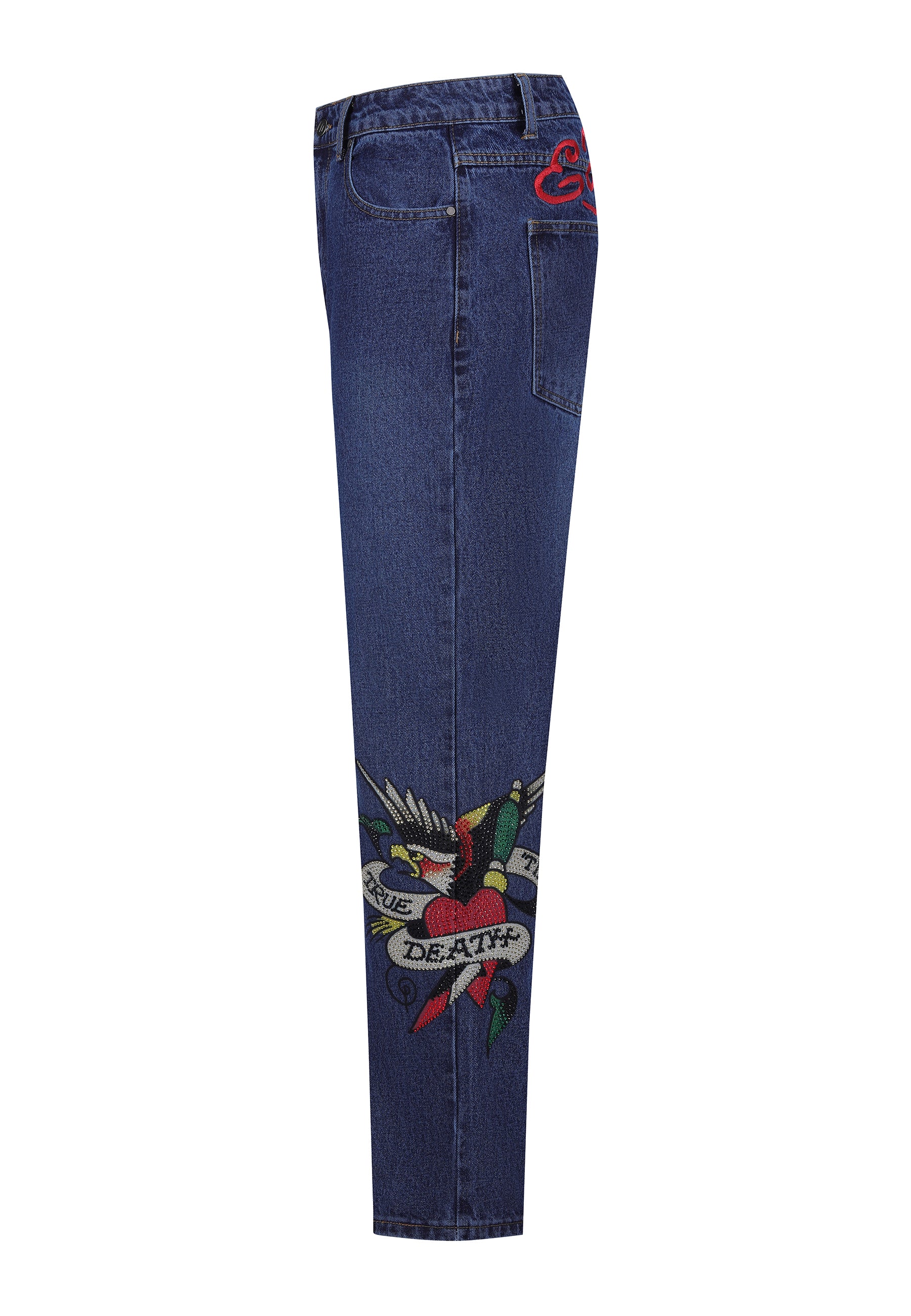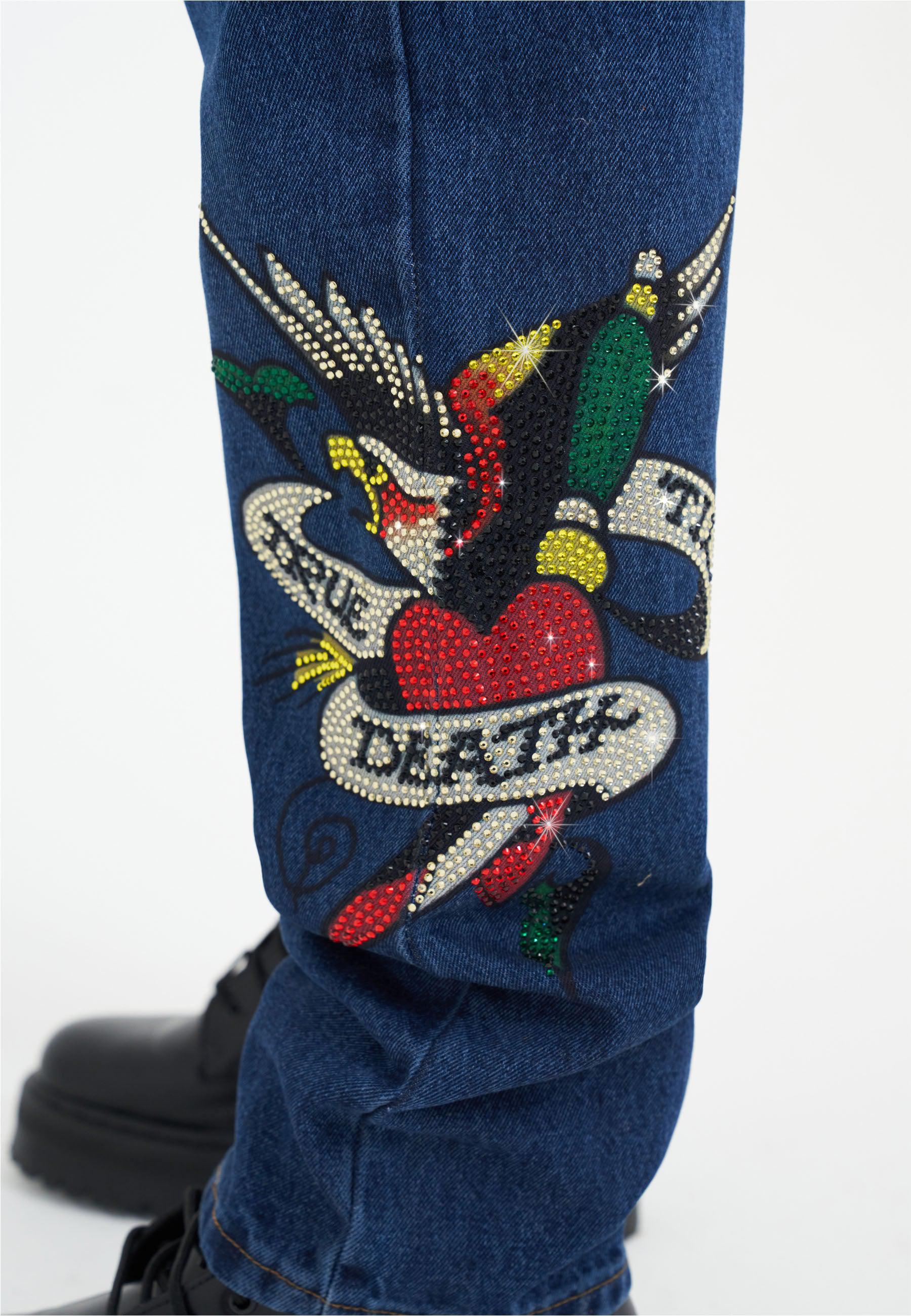 The True Til Death Jean features a full-colour diamante graphic along the front leg and the iconic Ed Hardy signature logo across the reverse.