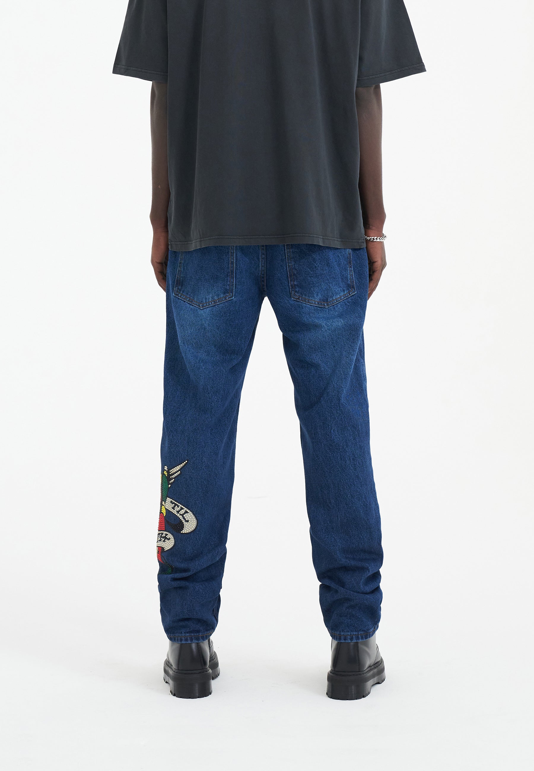 Mens True-Till-Death Diamante Denim Trousers Jeans - Indigo
