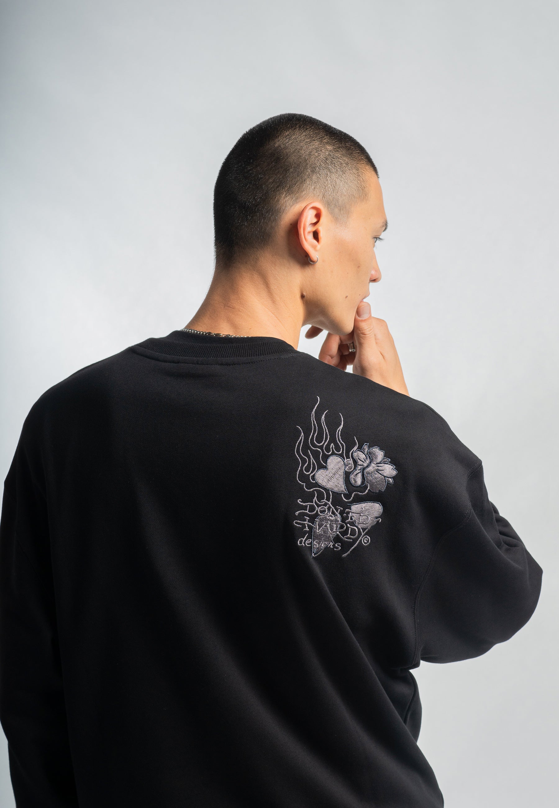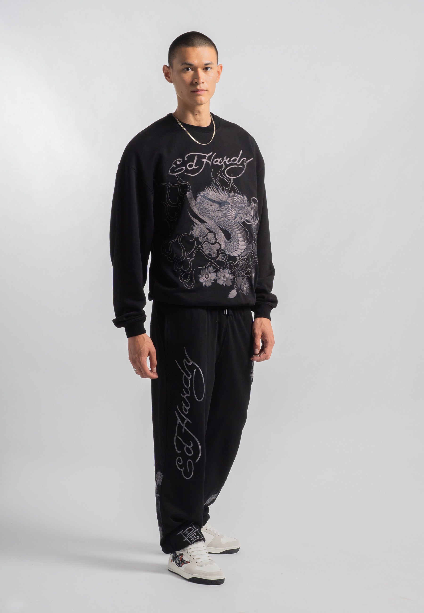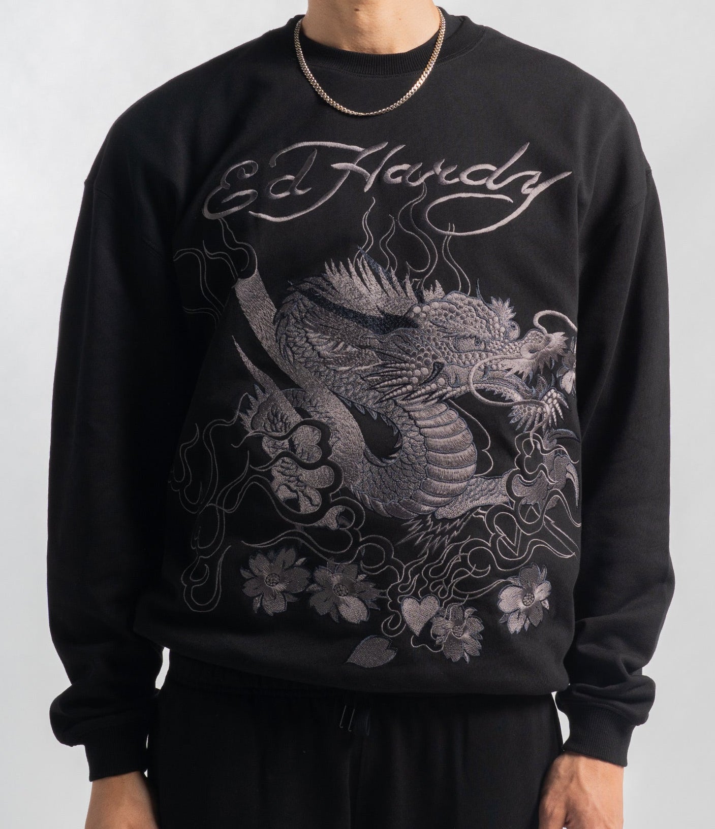 This jumper, featuring vintage-inspired tonal embroidery, pays homage to Ed Hardy's iconic designs.