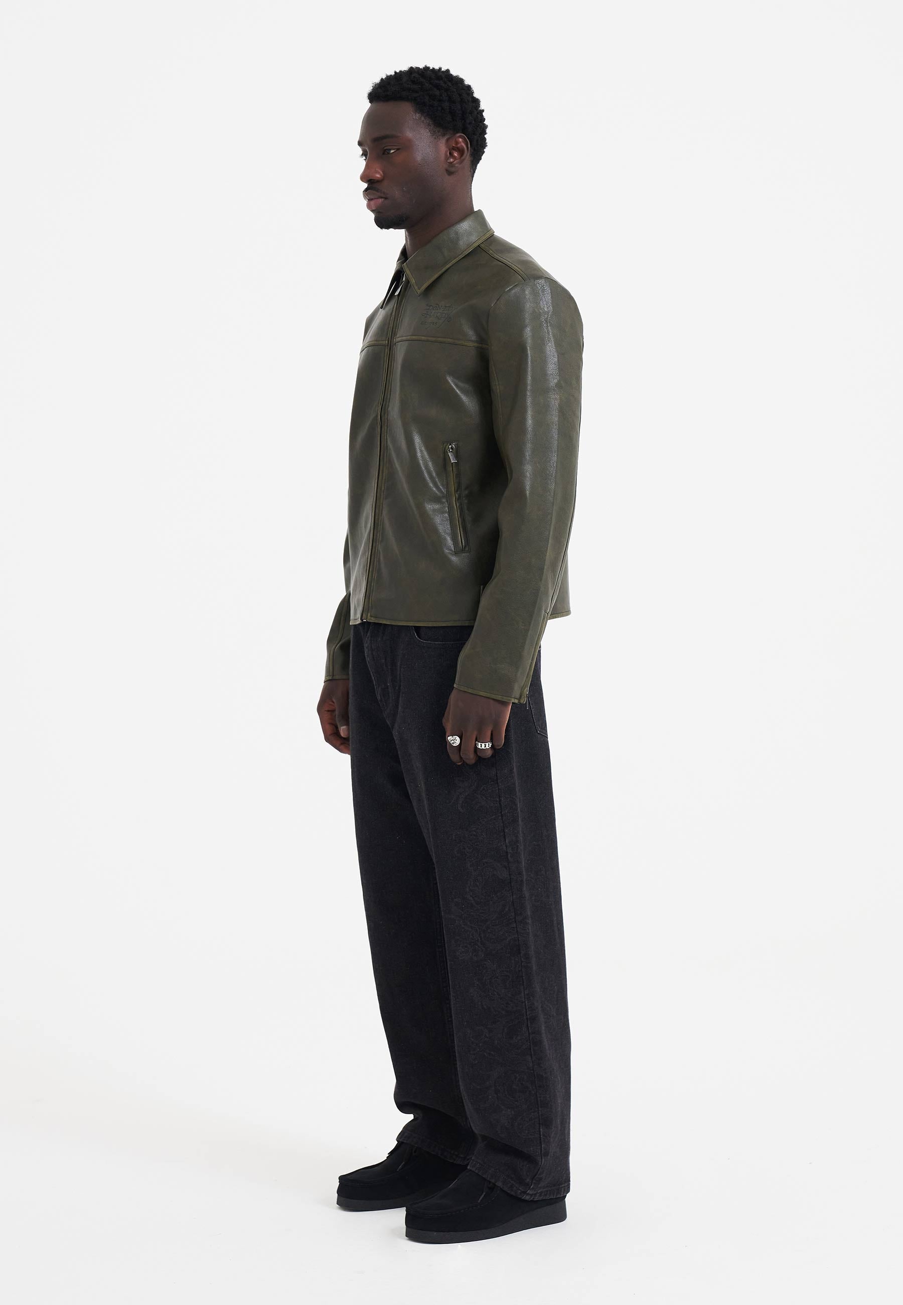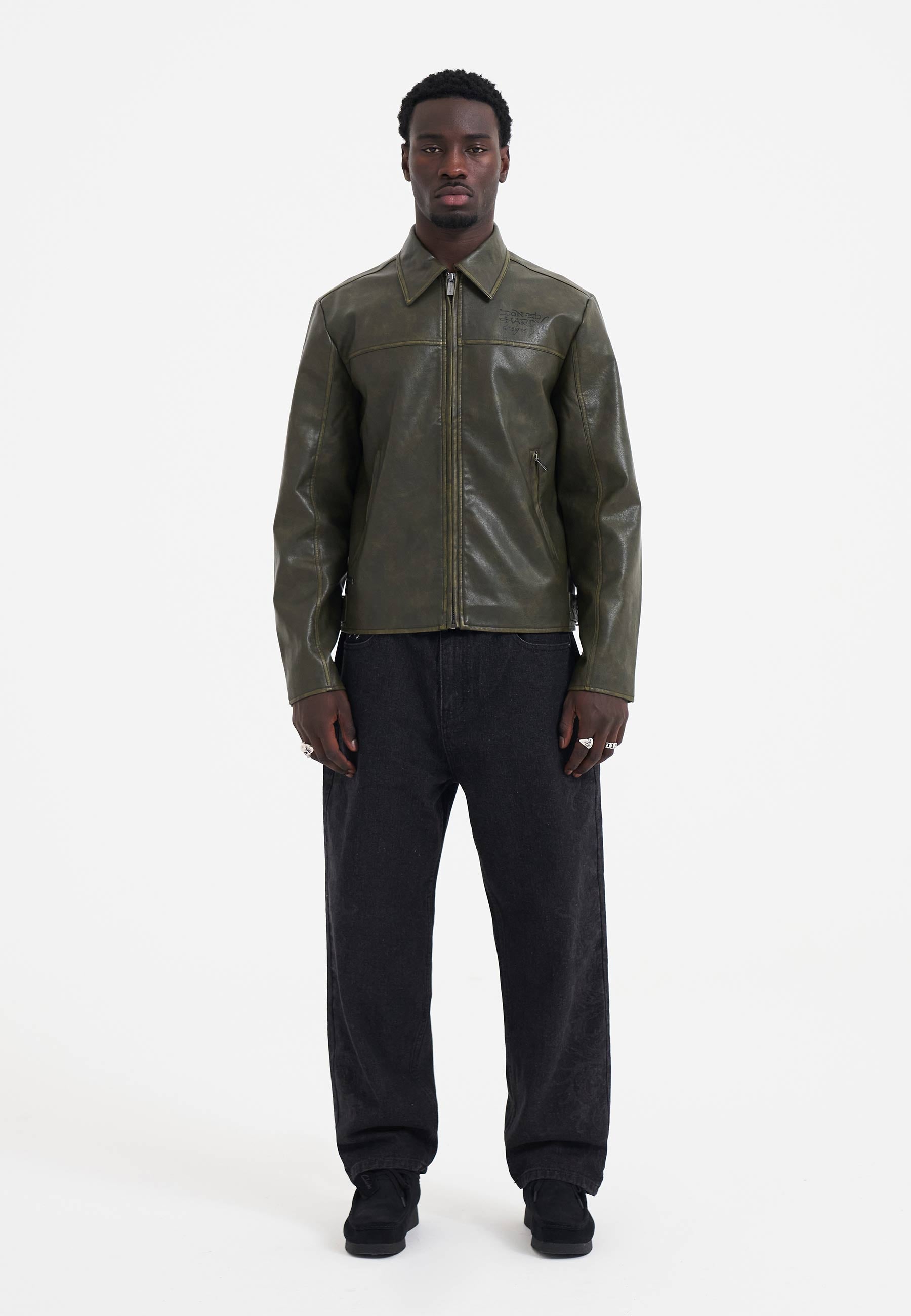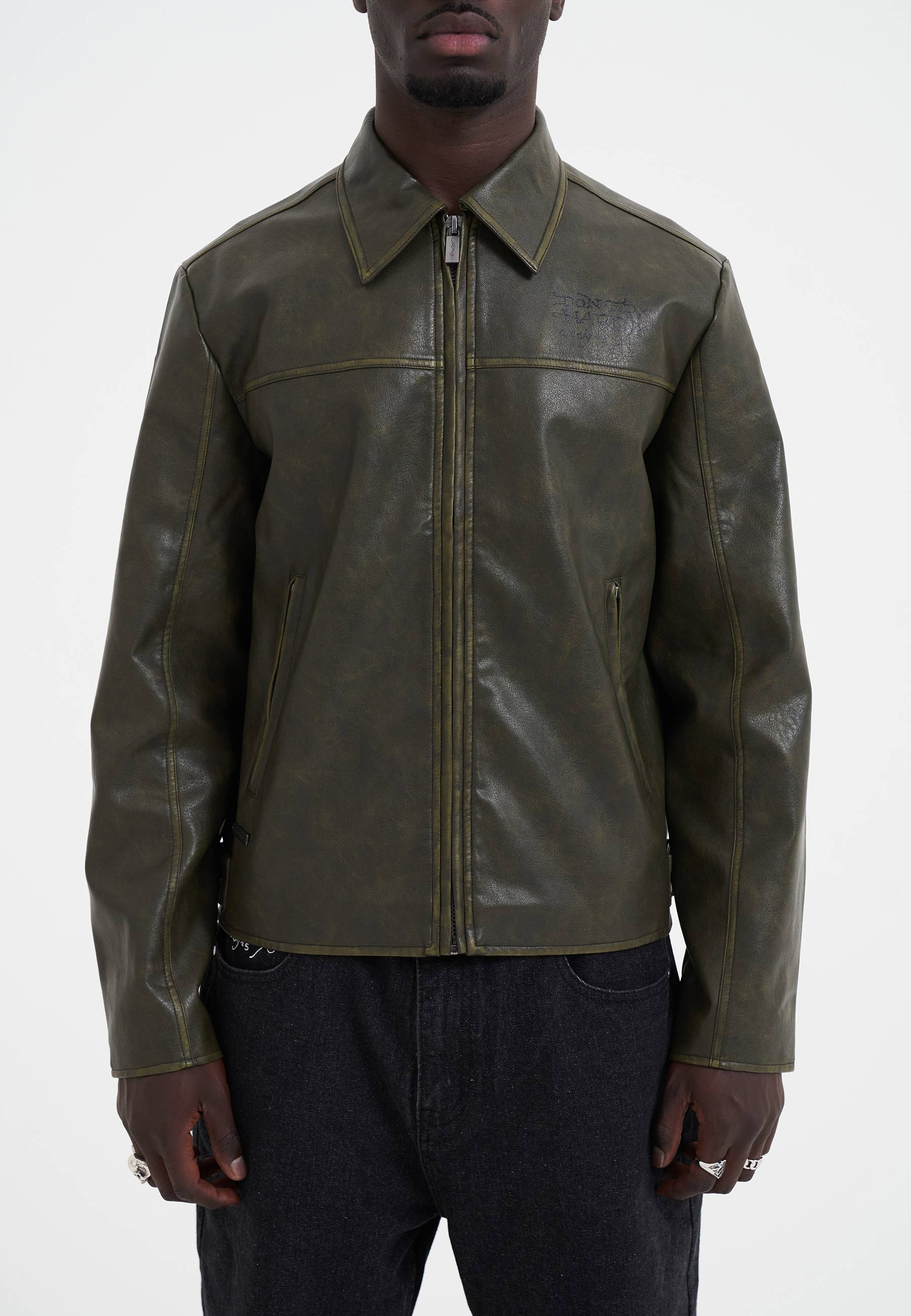 Mens Vintage Washed Vegan Leather Motocross Jacket - Green