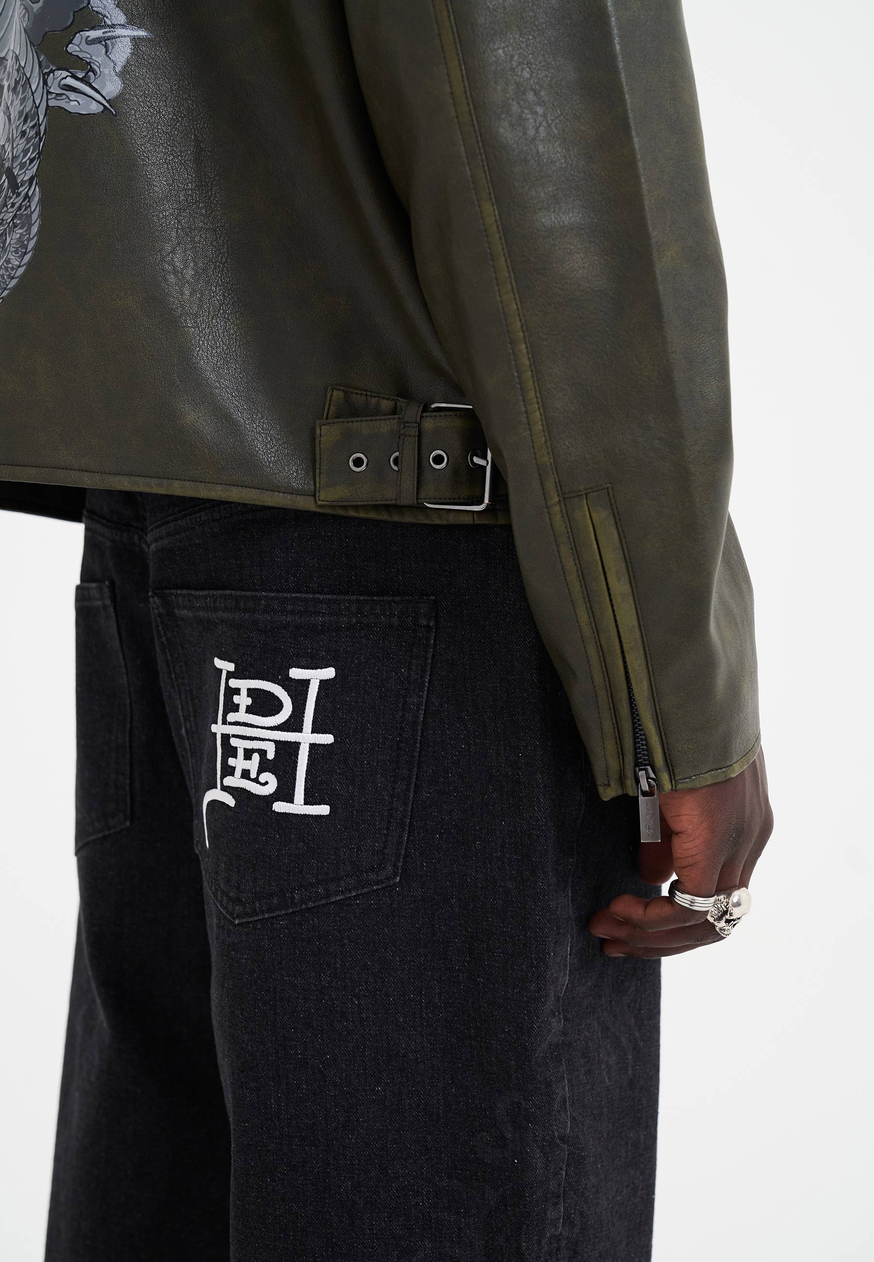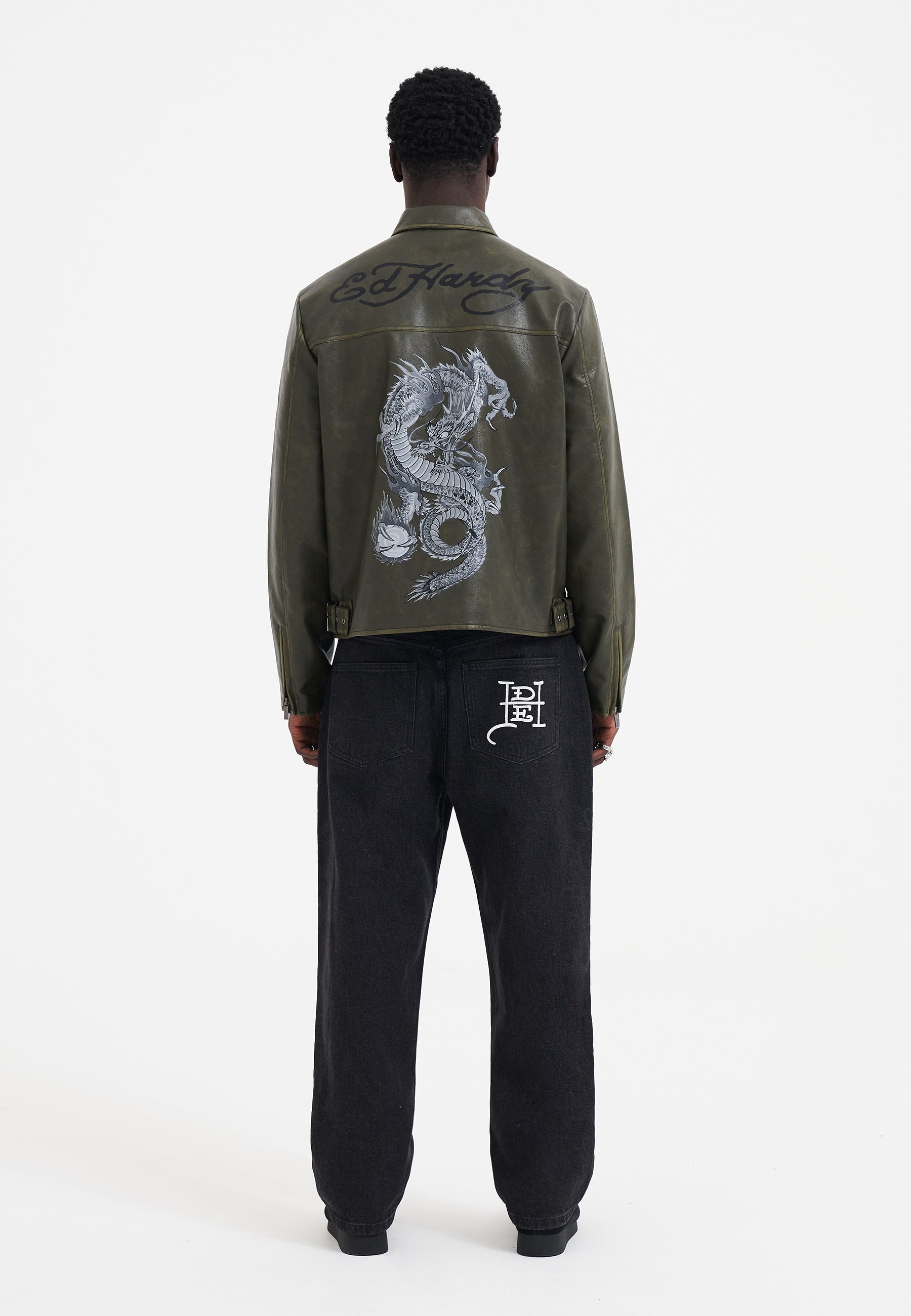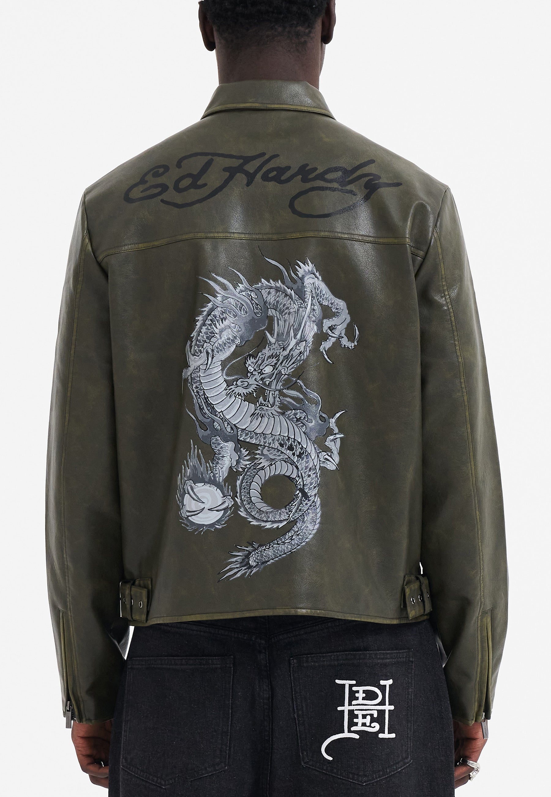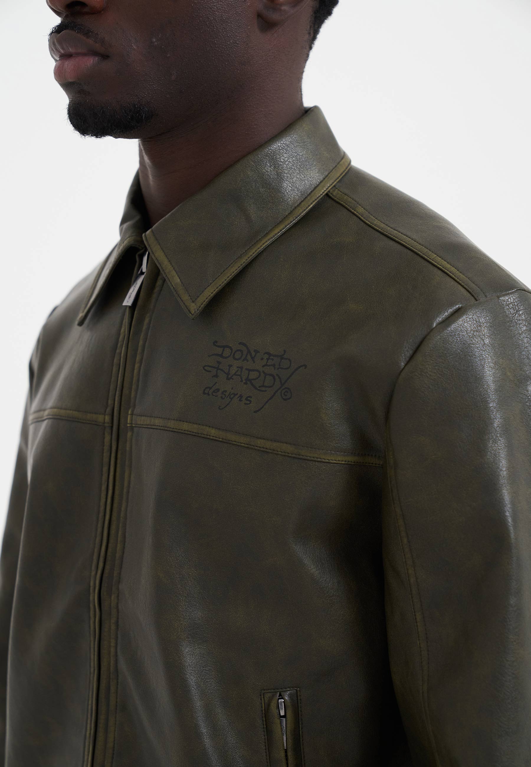 Mens Vintage Washed Vegan Leather Motocross Jacket - Green