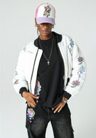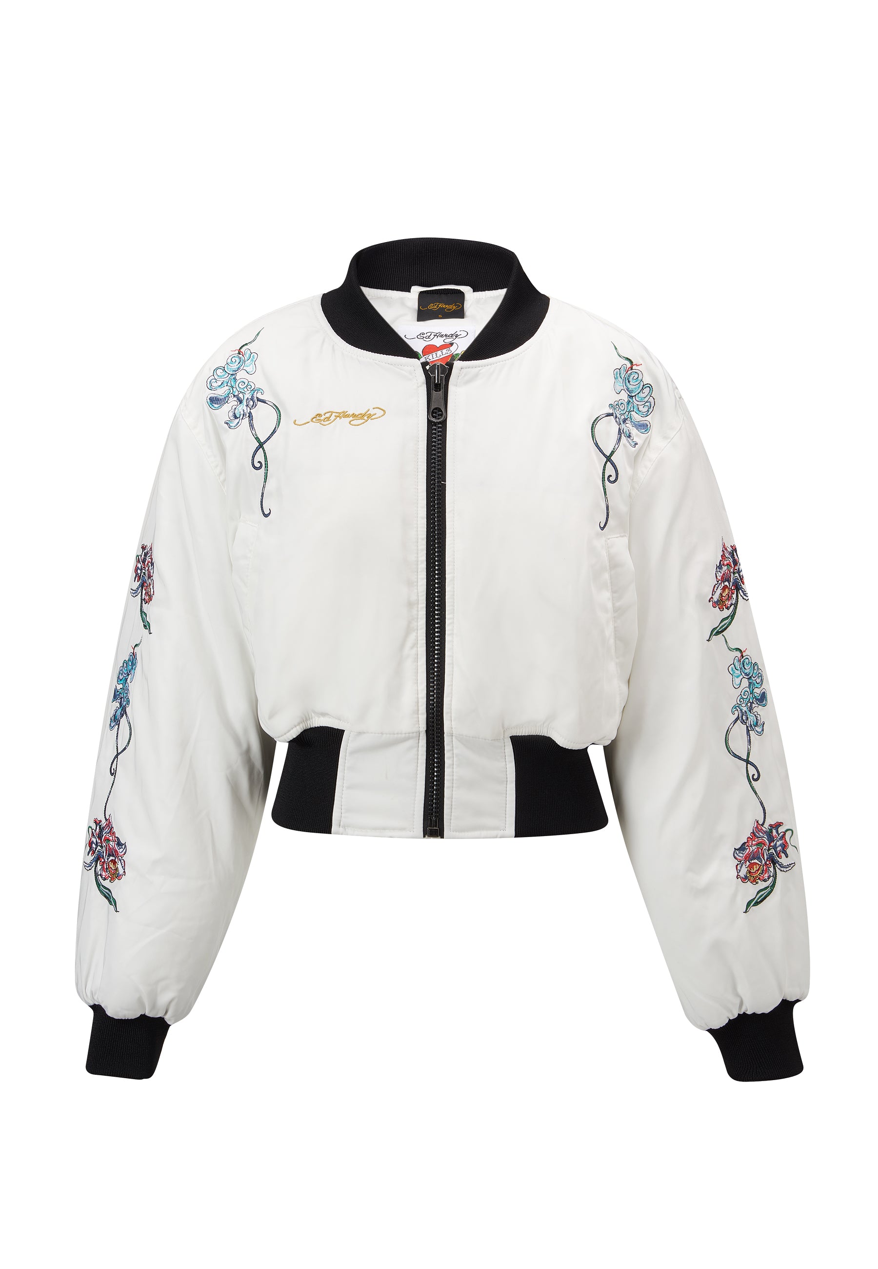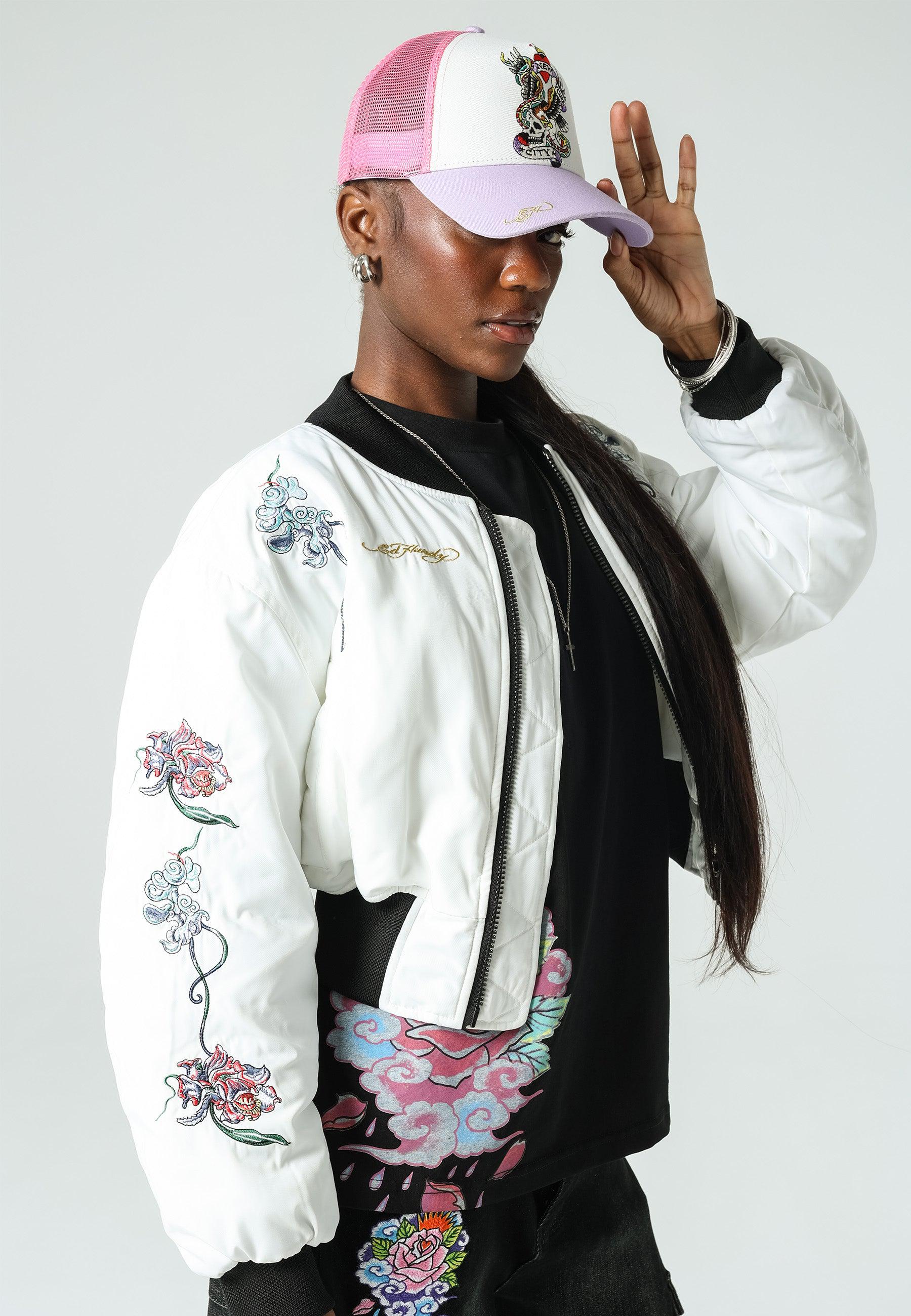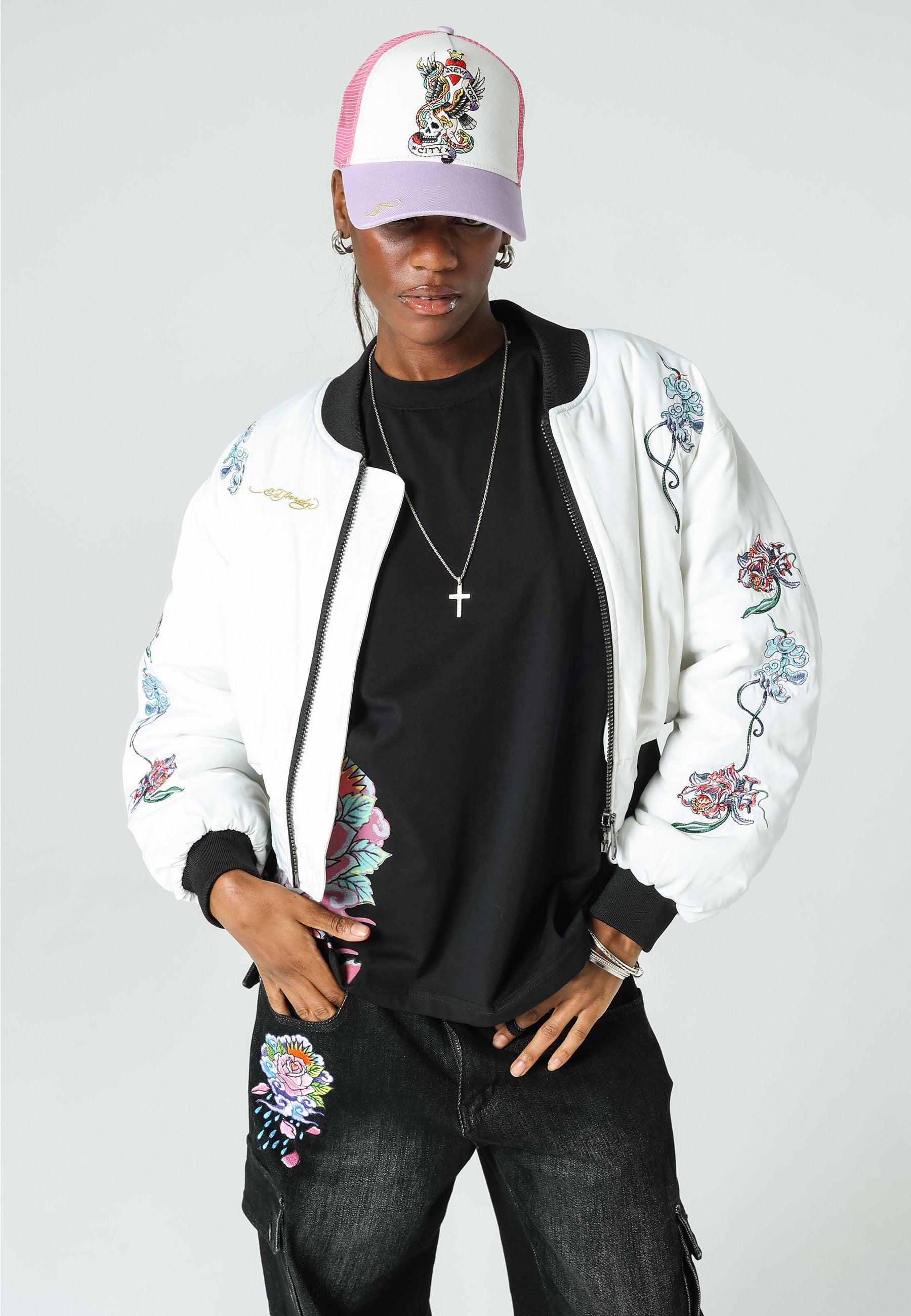 Make a scene in white. This quilter bomber jacket features a subtle yet eye-catching mystic panther embroidery across the back and delicate floral details on the sleeve and lapels. Black cuffs and neckline give it monochromatic appeal. 100%POLYESTER QUILTED.
