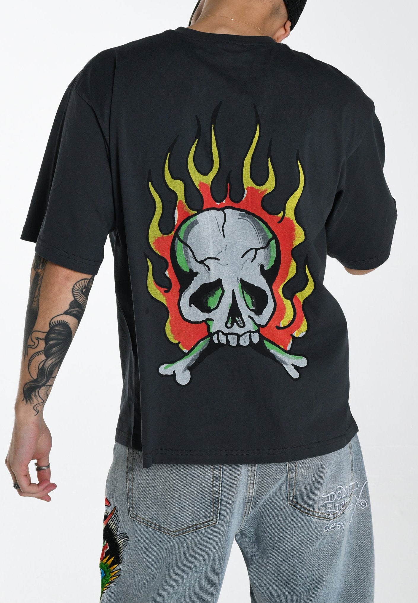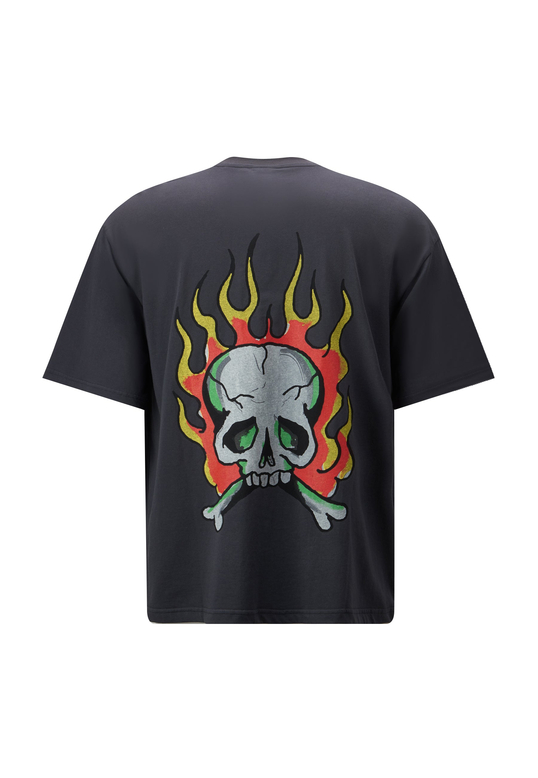 The large, flaming skull and crossbones design on the back centre of this black T-shirt is printed with vivid colours and a simplistic design.