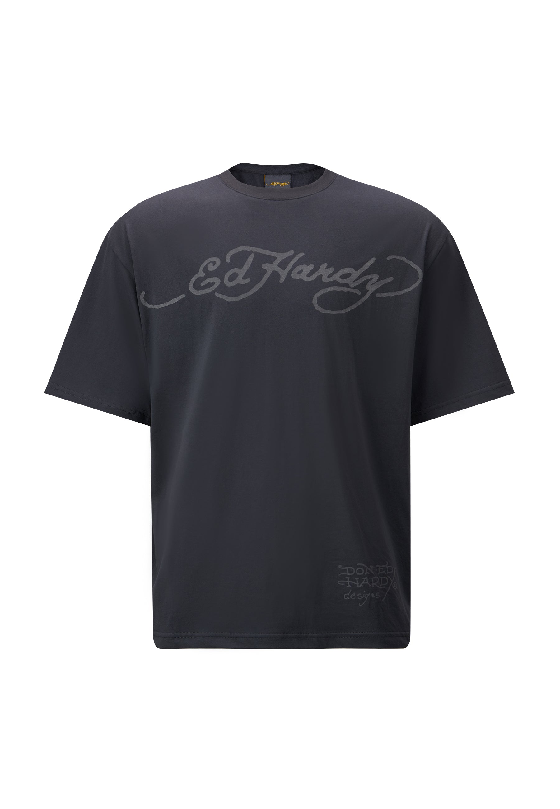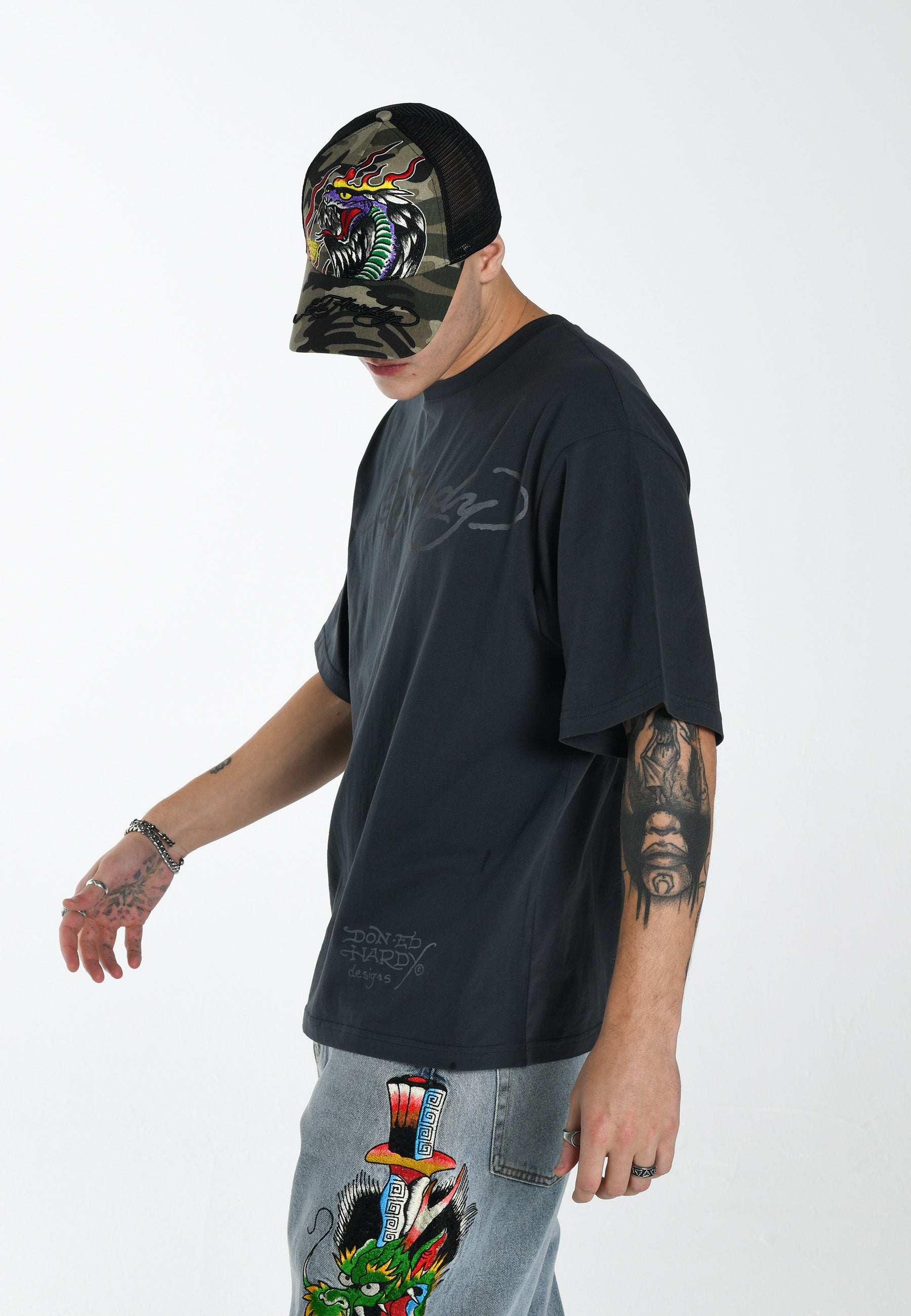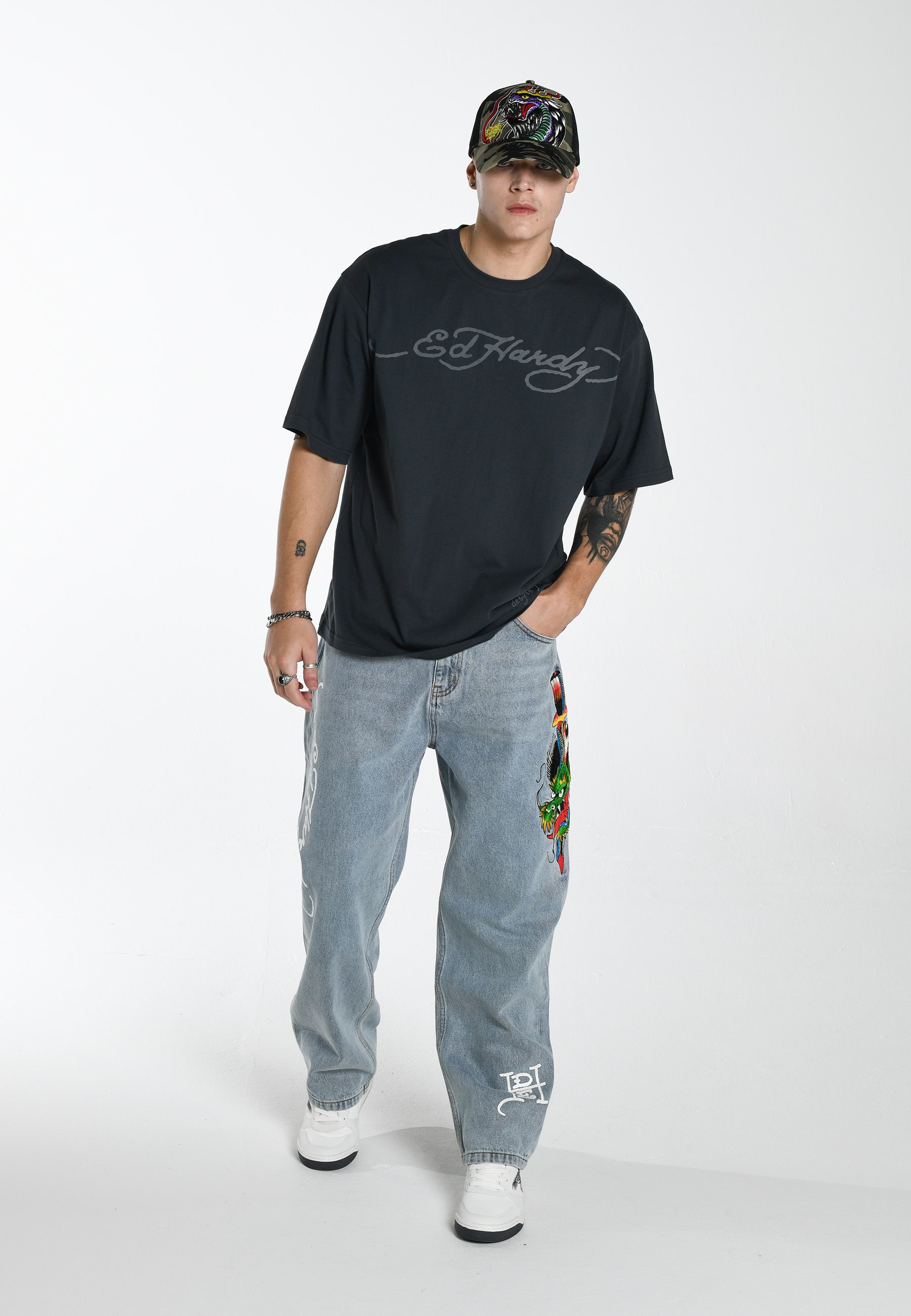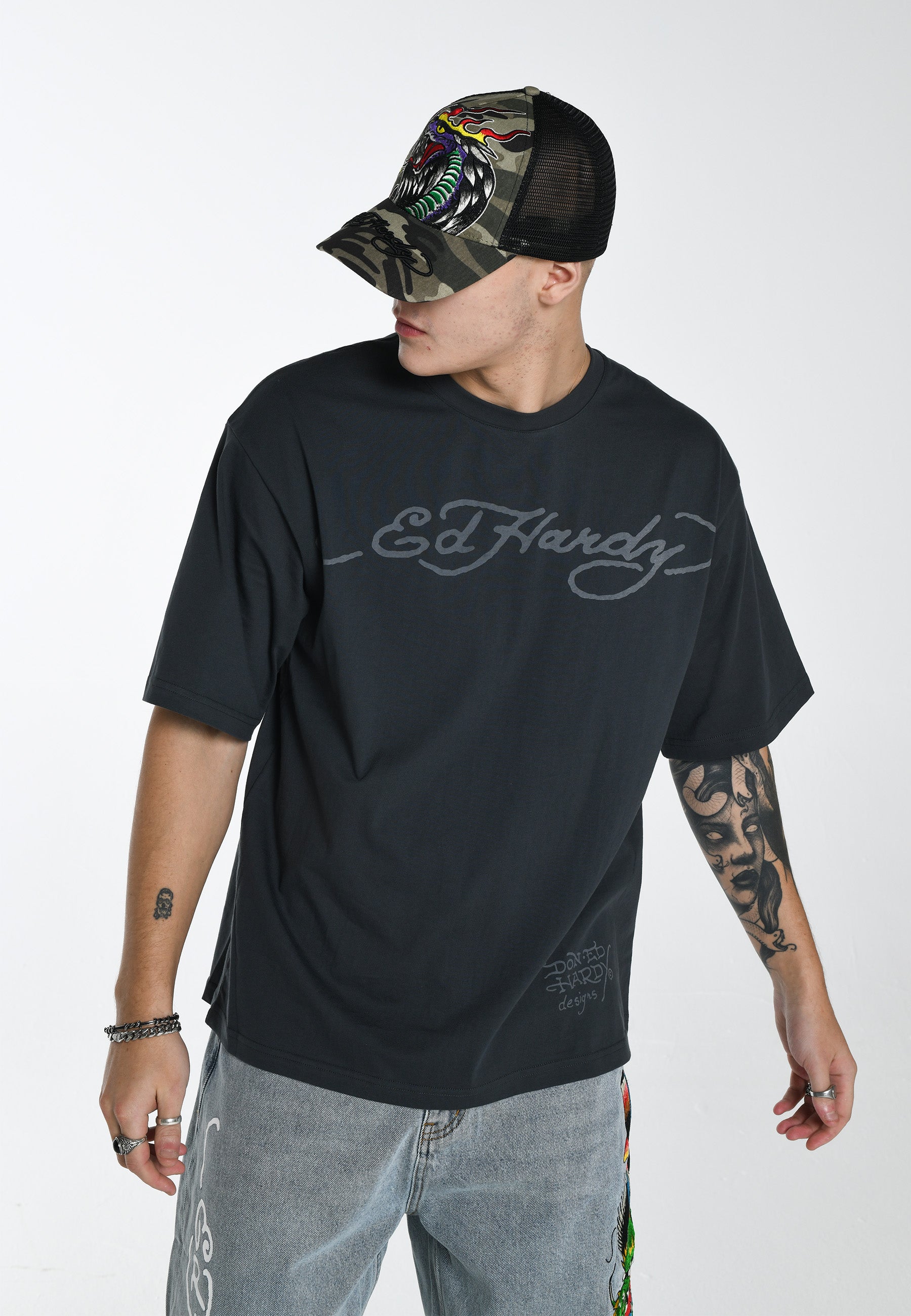The iconic black Ed Hardy logo on this T-shirt’s chest is an understated addition to the bold skull tattoo graphic, and its oversized fit ensures comfort as well as style.