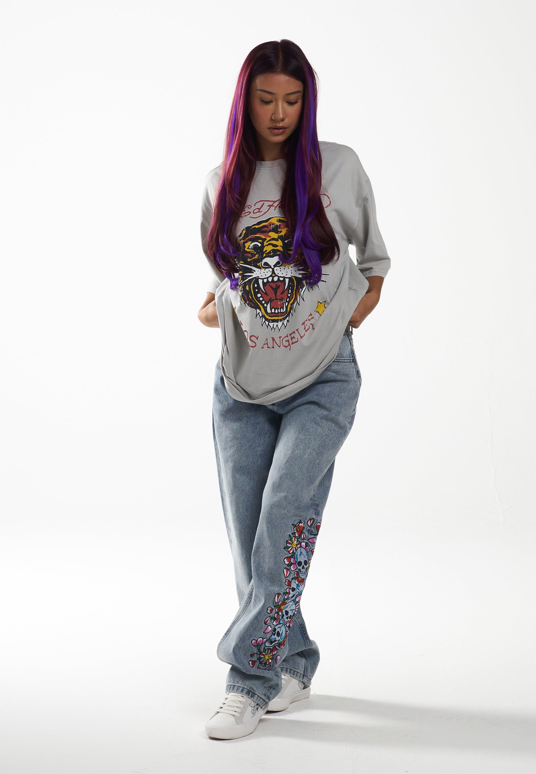 Womens Skull-Flower-Baggy Jeans - Bleach