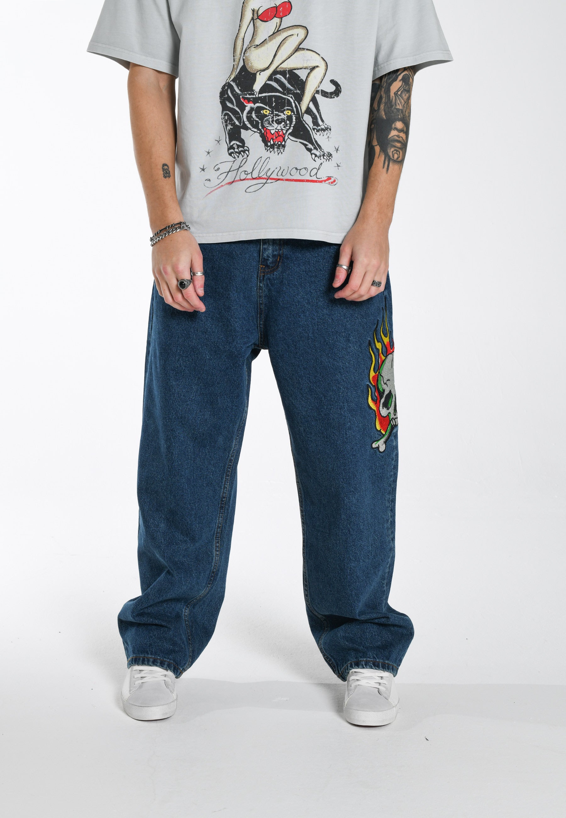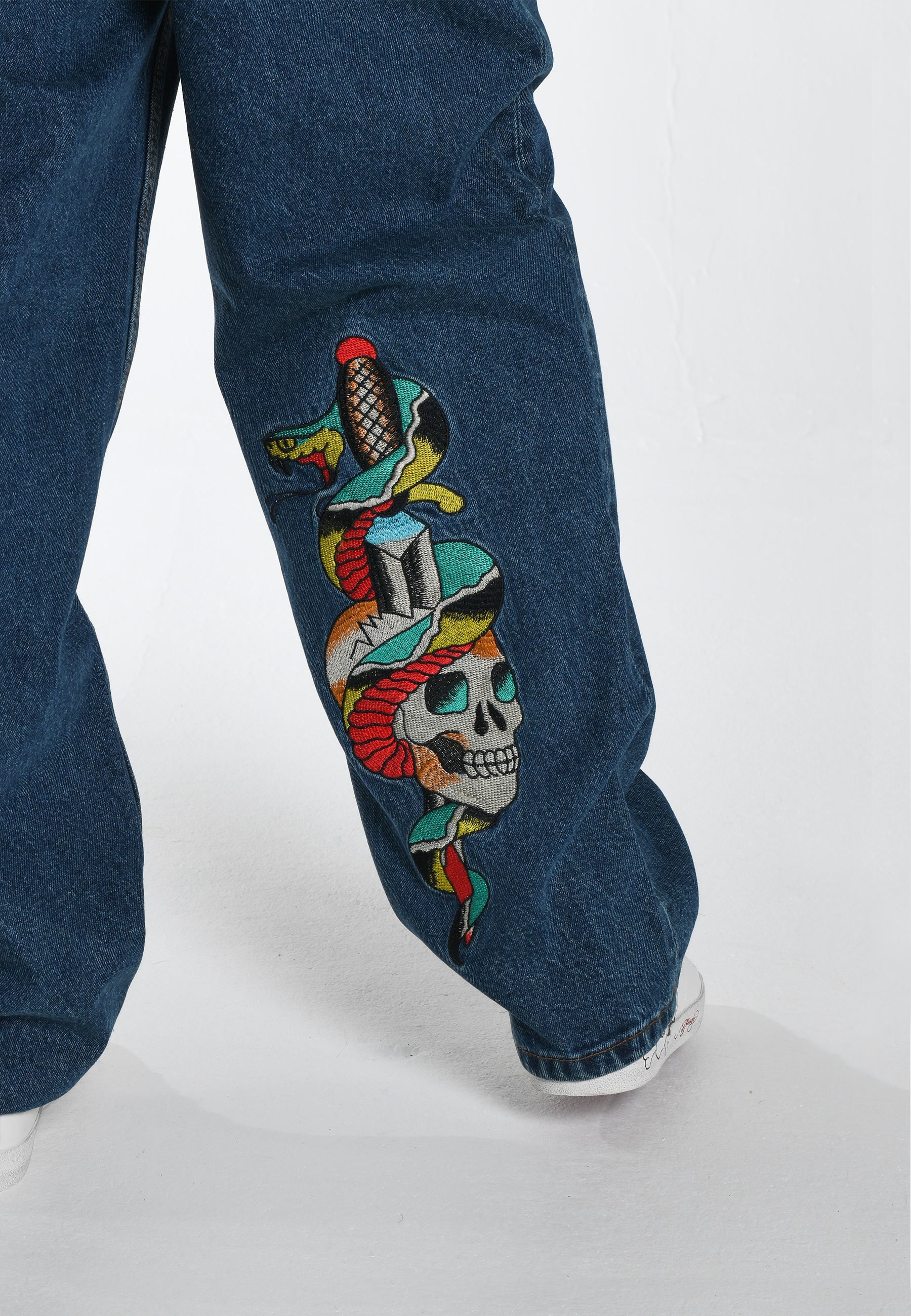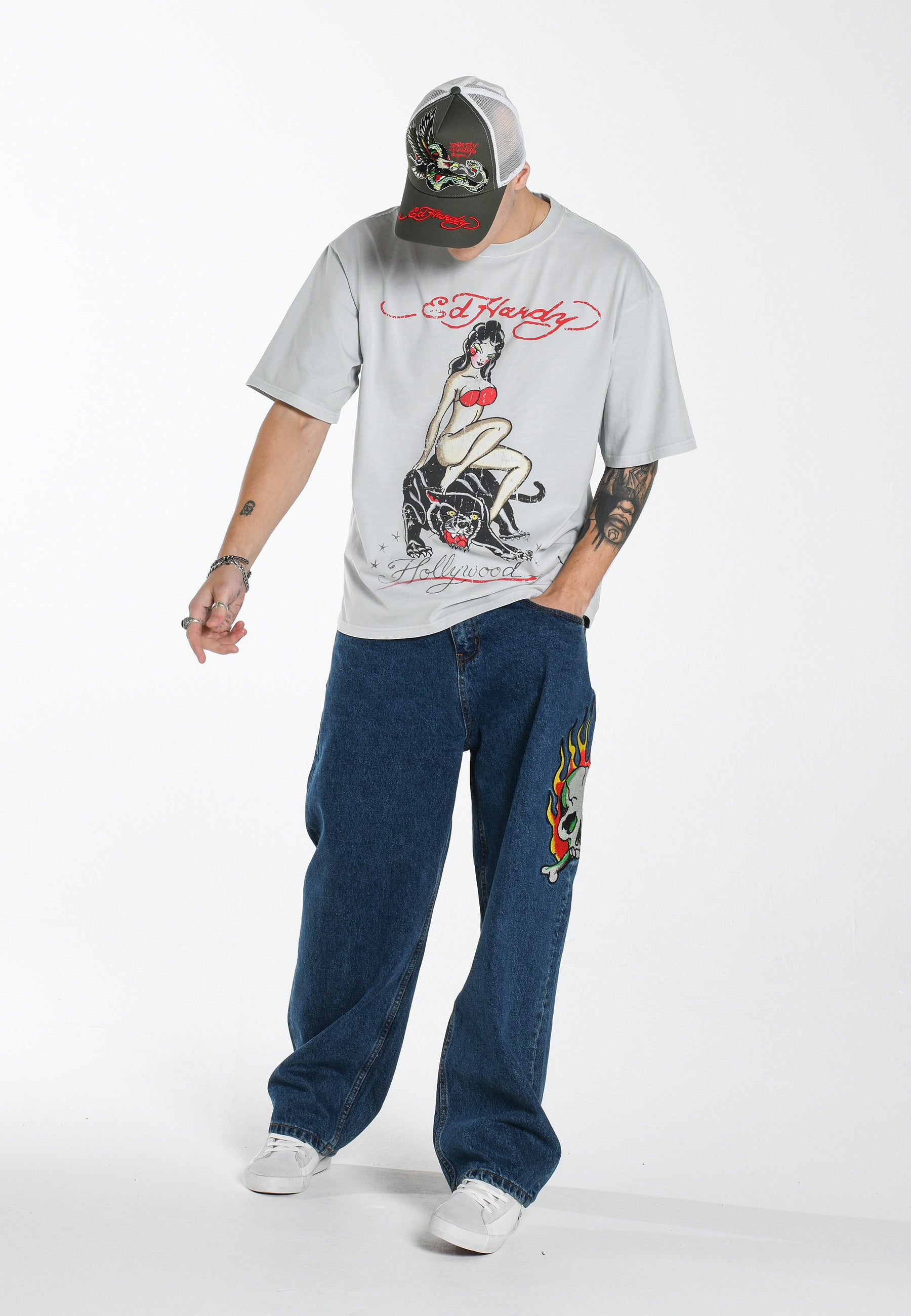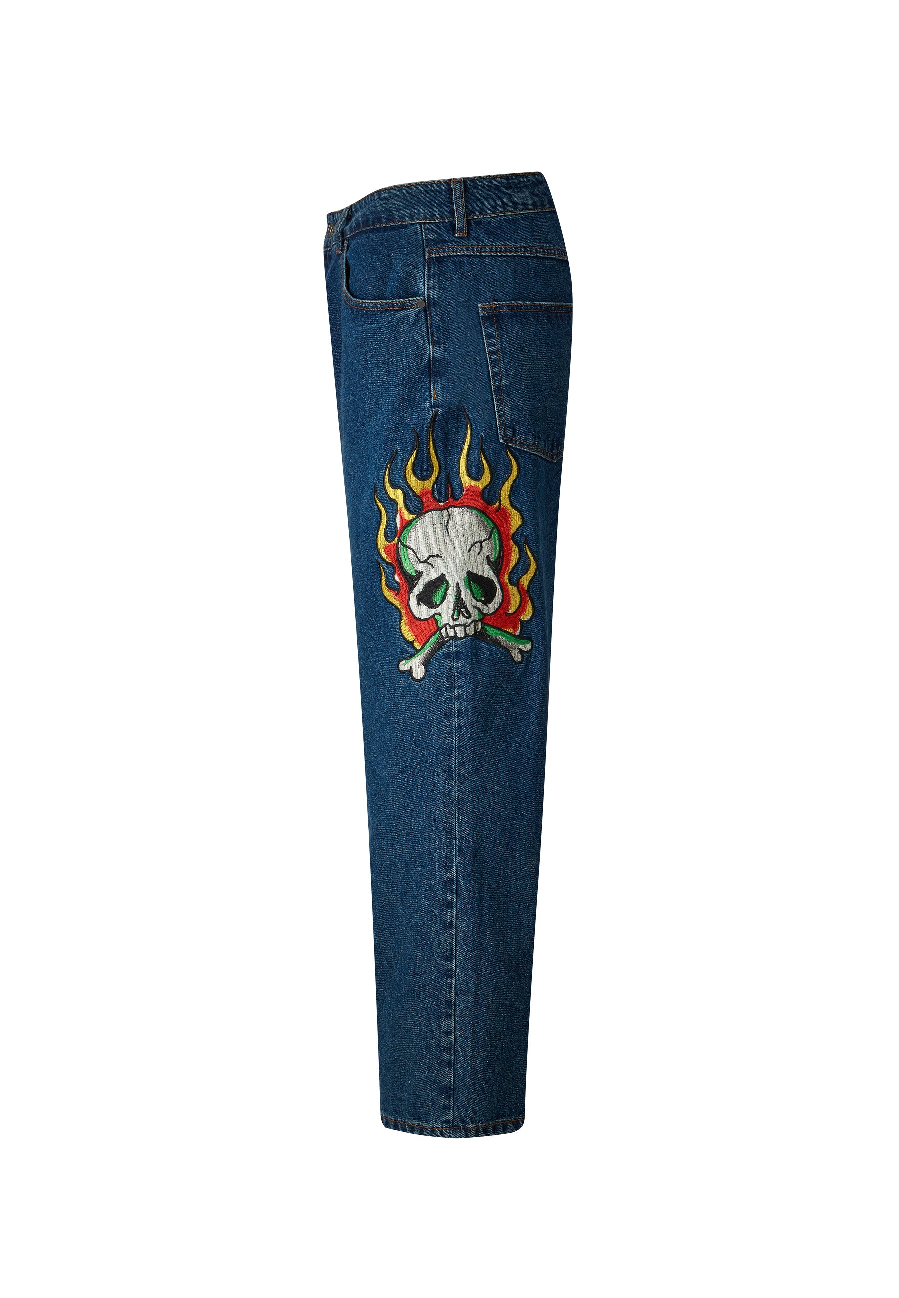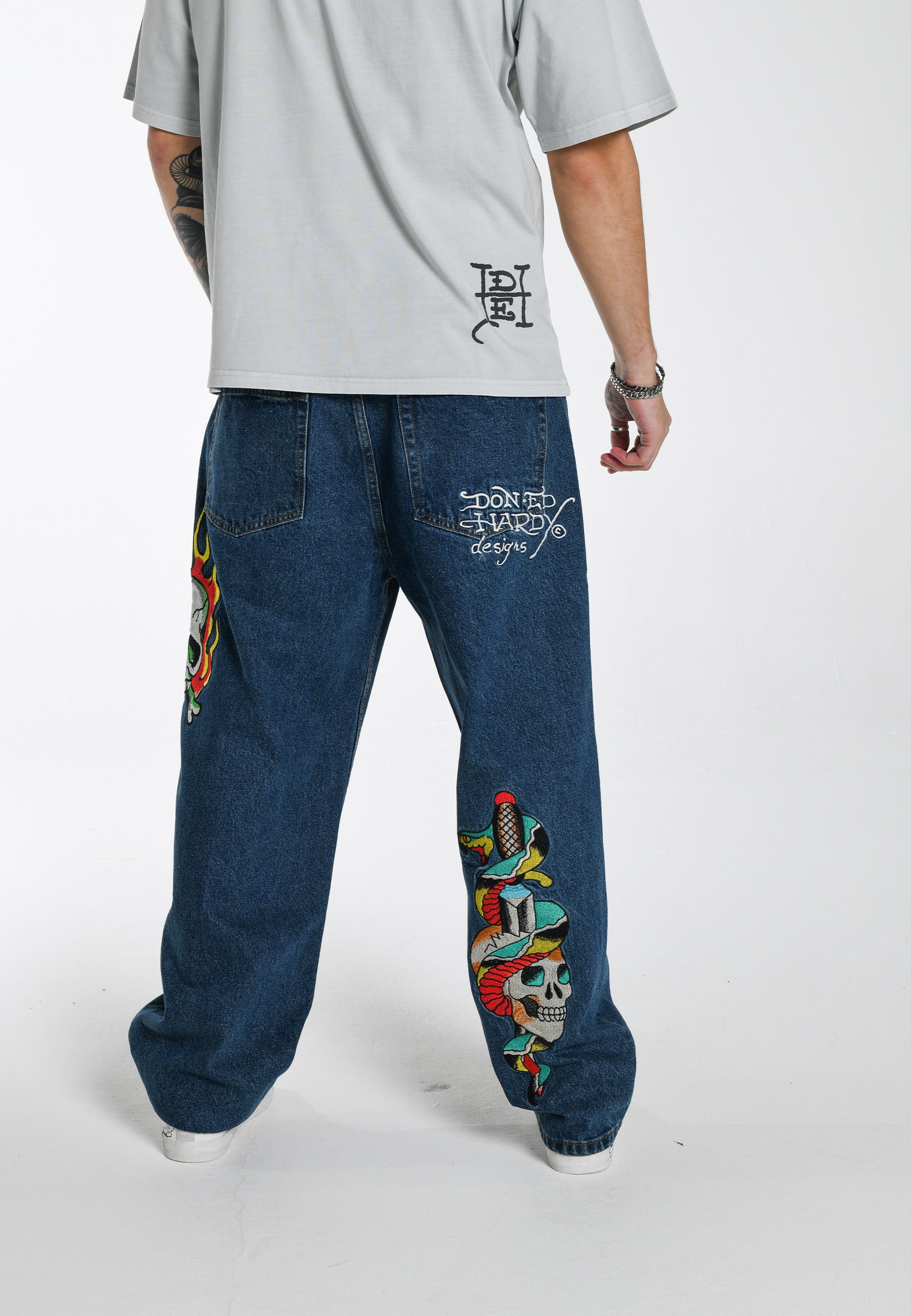 Featuring an intricate serpent design coiled around the skull-dagger tattoo graphic to the lower-right leg, and a bold flaming skull design on the upper left leg, these jeans are an absolute urban essential. Their indigo colouration, relaxed fit, and white Ed Hardy logo on the upper right leg make them cool, comfortable, and unmistakable Ed Hardy. 100%COTTON DENIM.