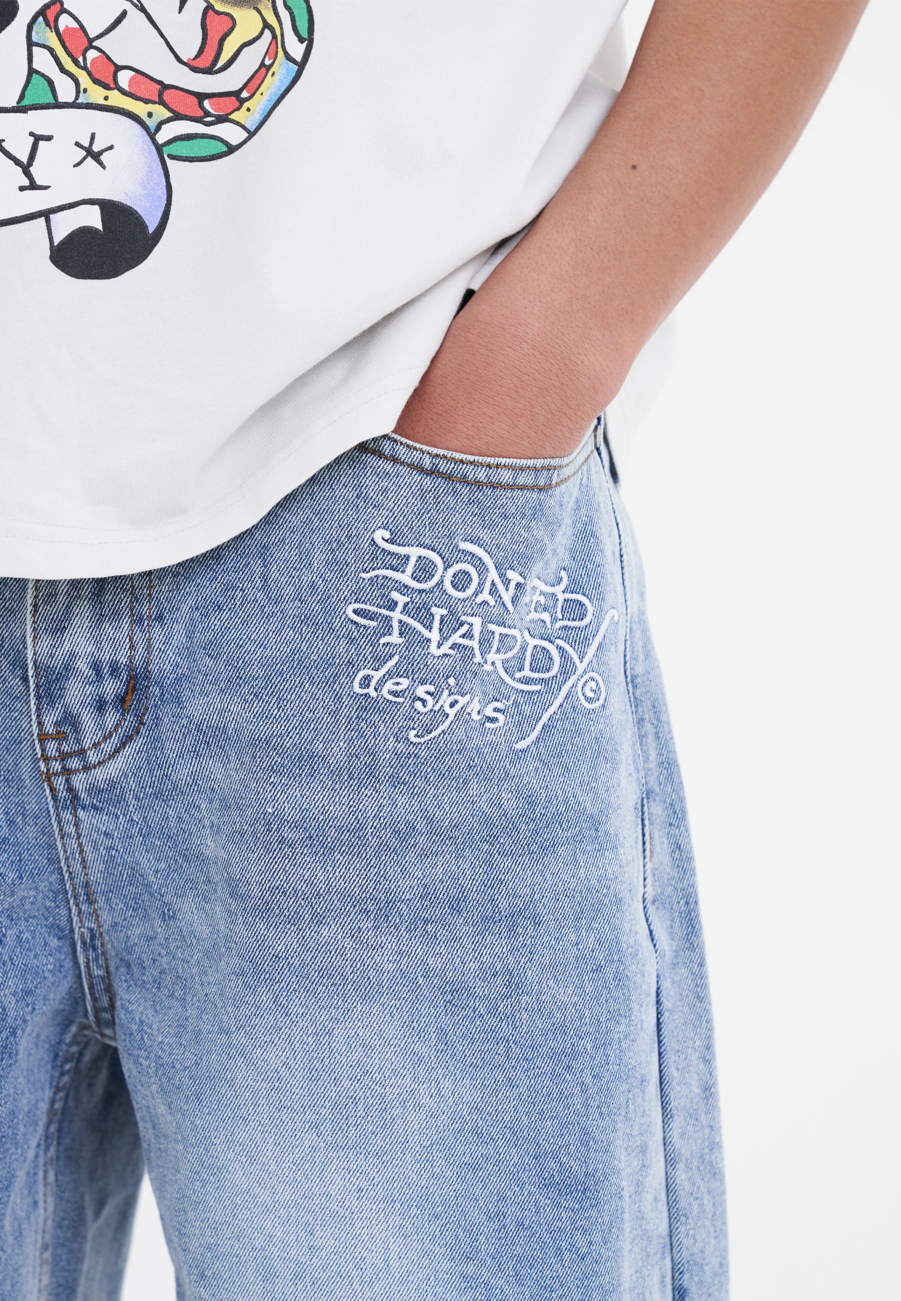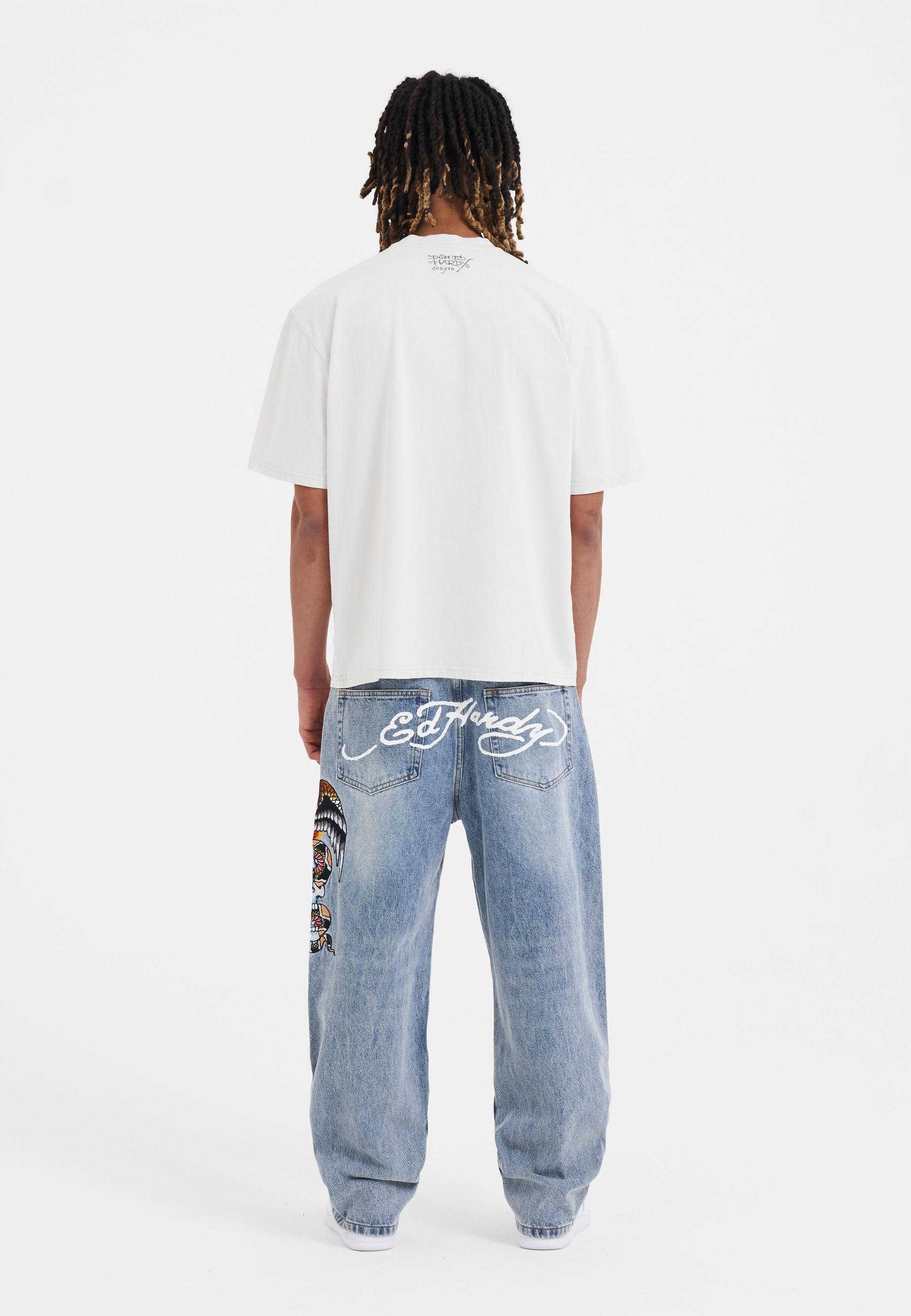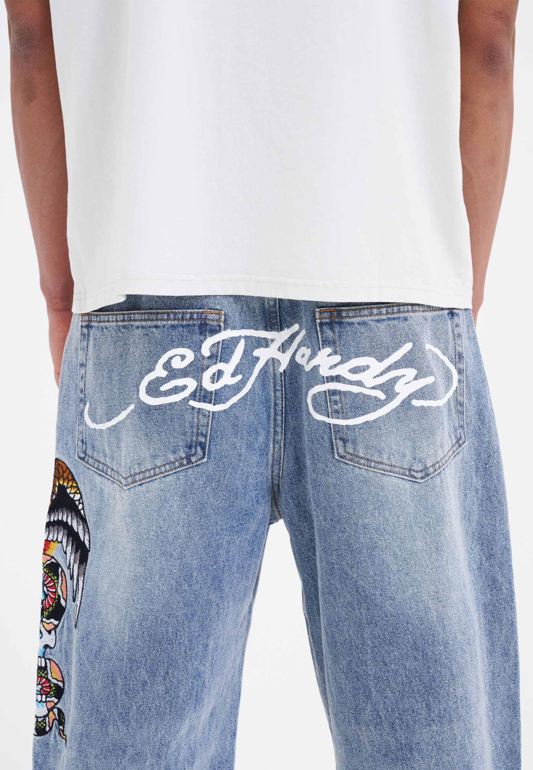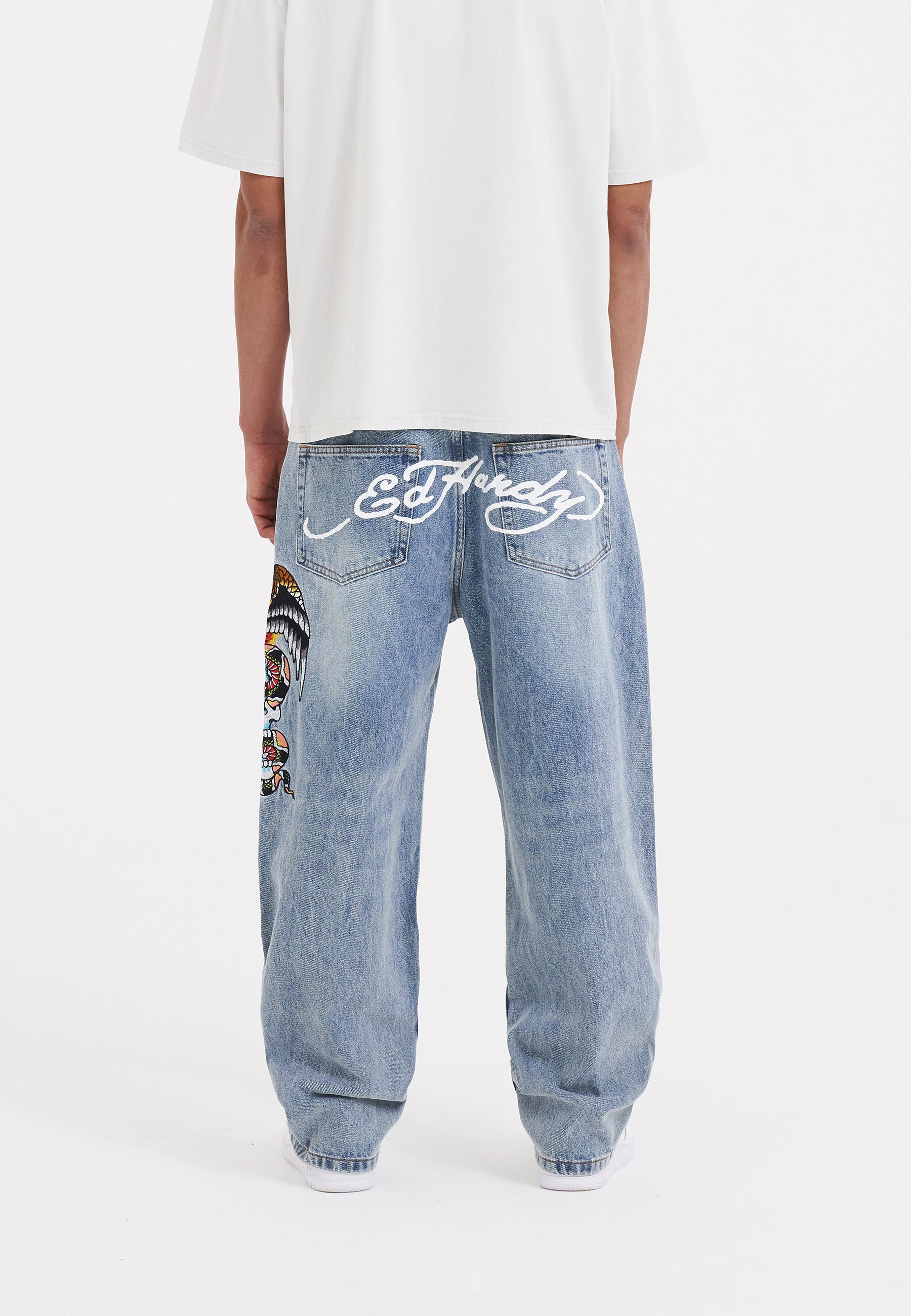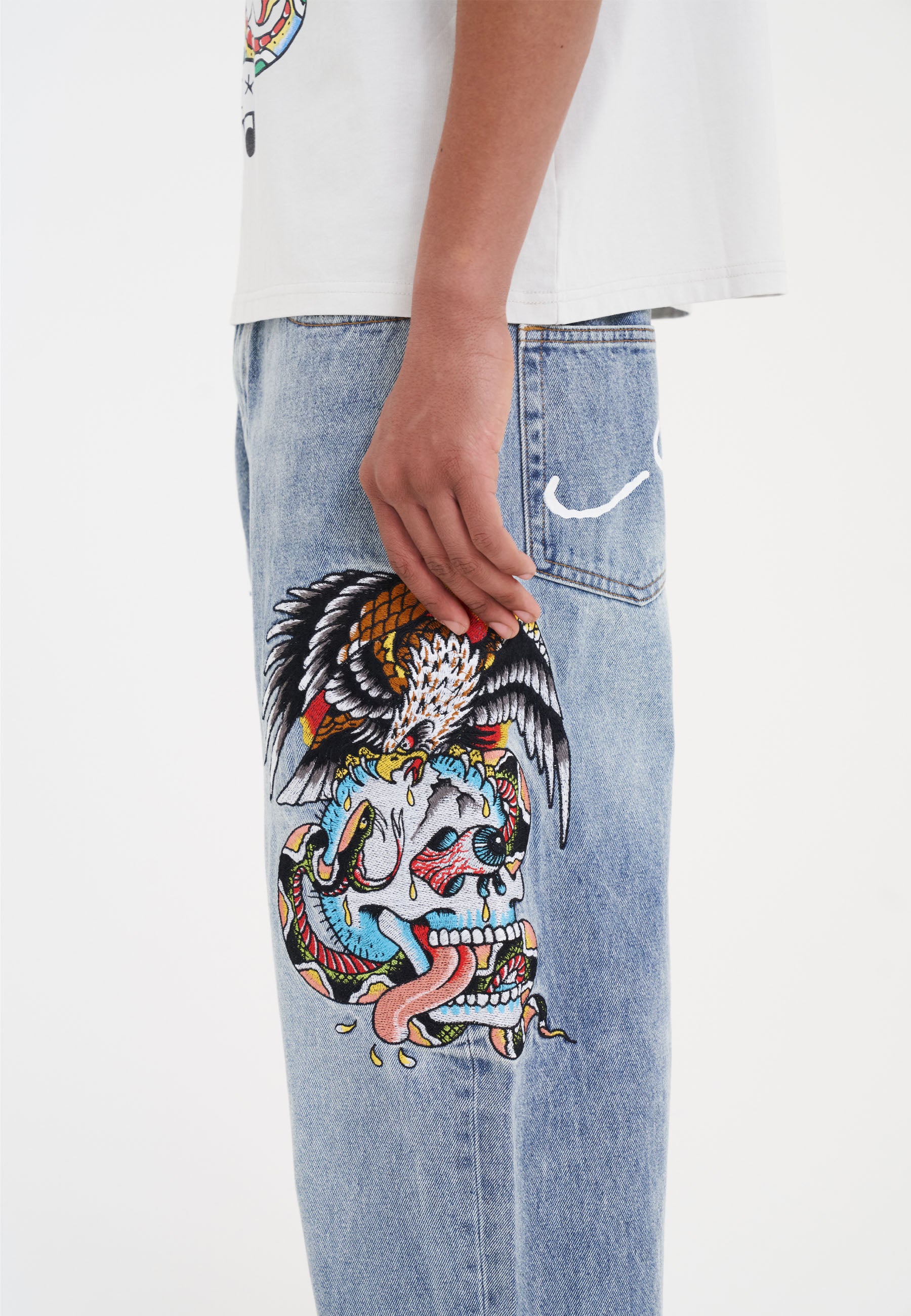 These vintage-style, bleach wash jeans feature a bold, unique skull eagle embroidered graphic on their upper left leg and Ed Hardy’s iconic logo in white lain across the rear.