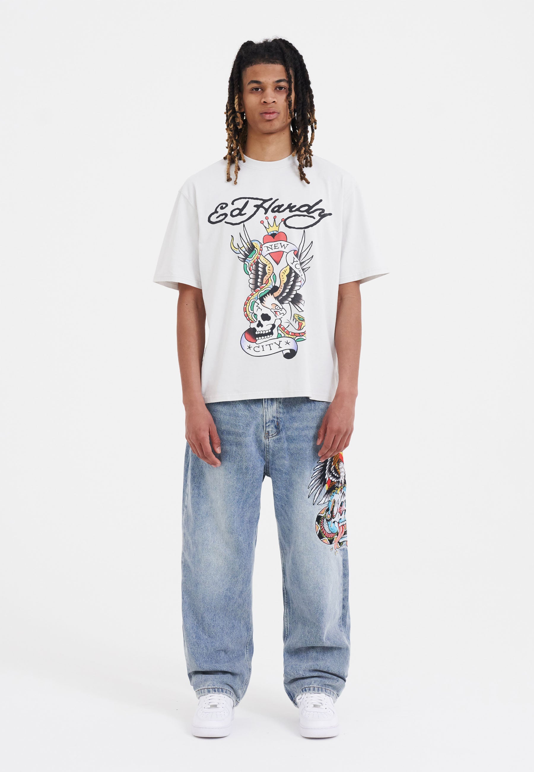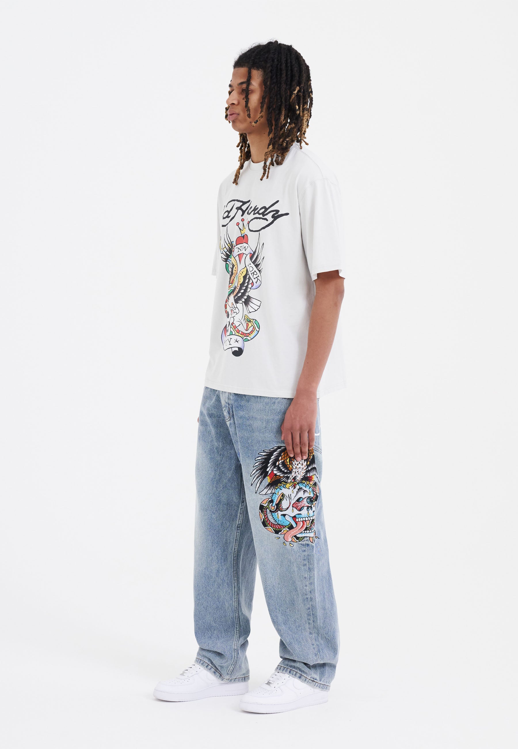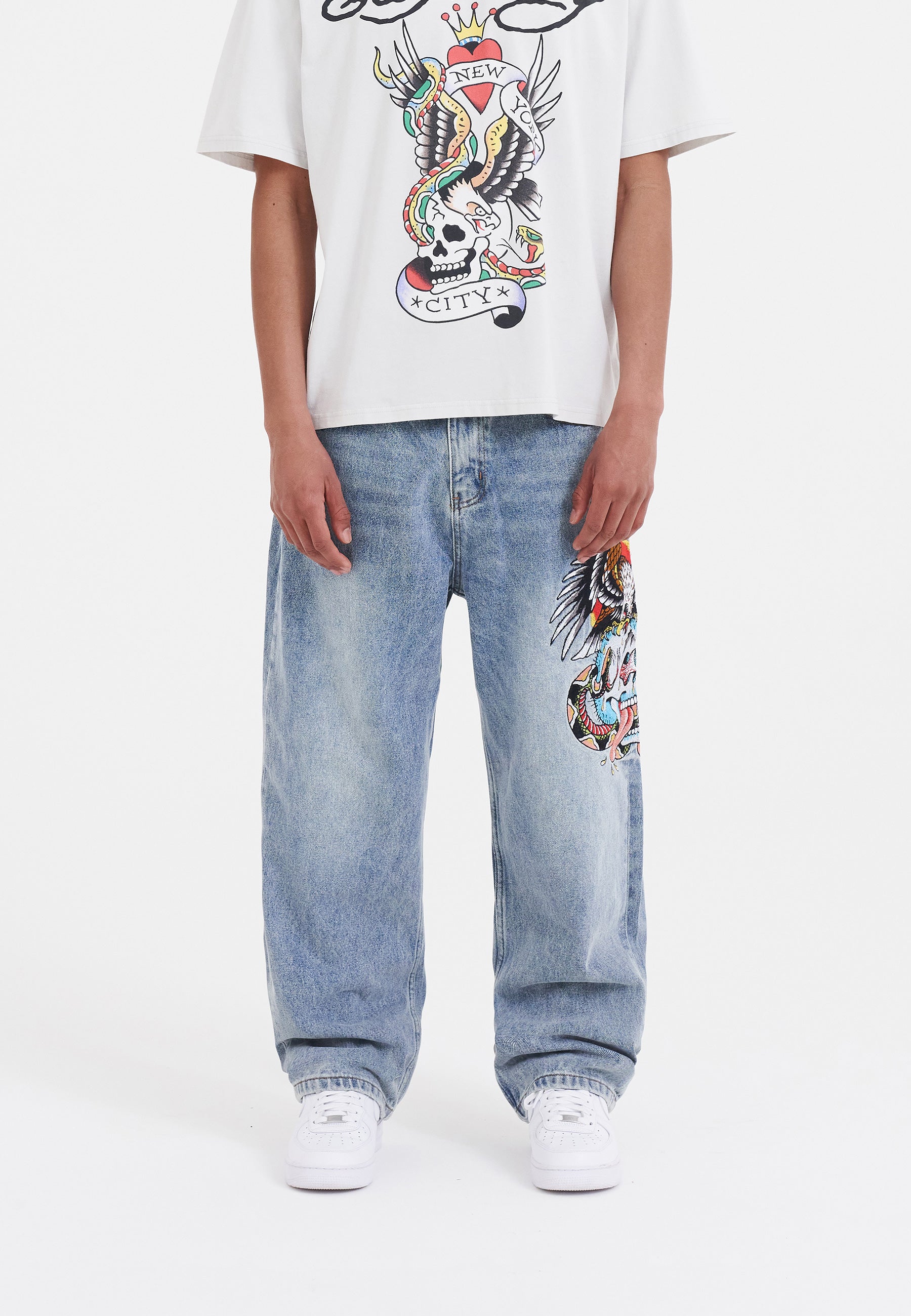 Mens Skull-Snake-Eagle Tattoo Graphic Denim Trousers Baggy Jeans - Bleach