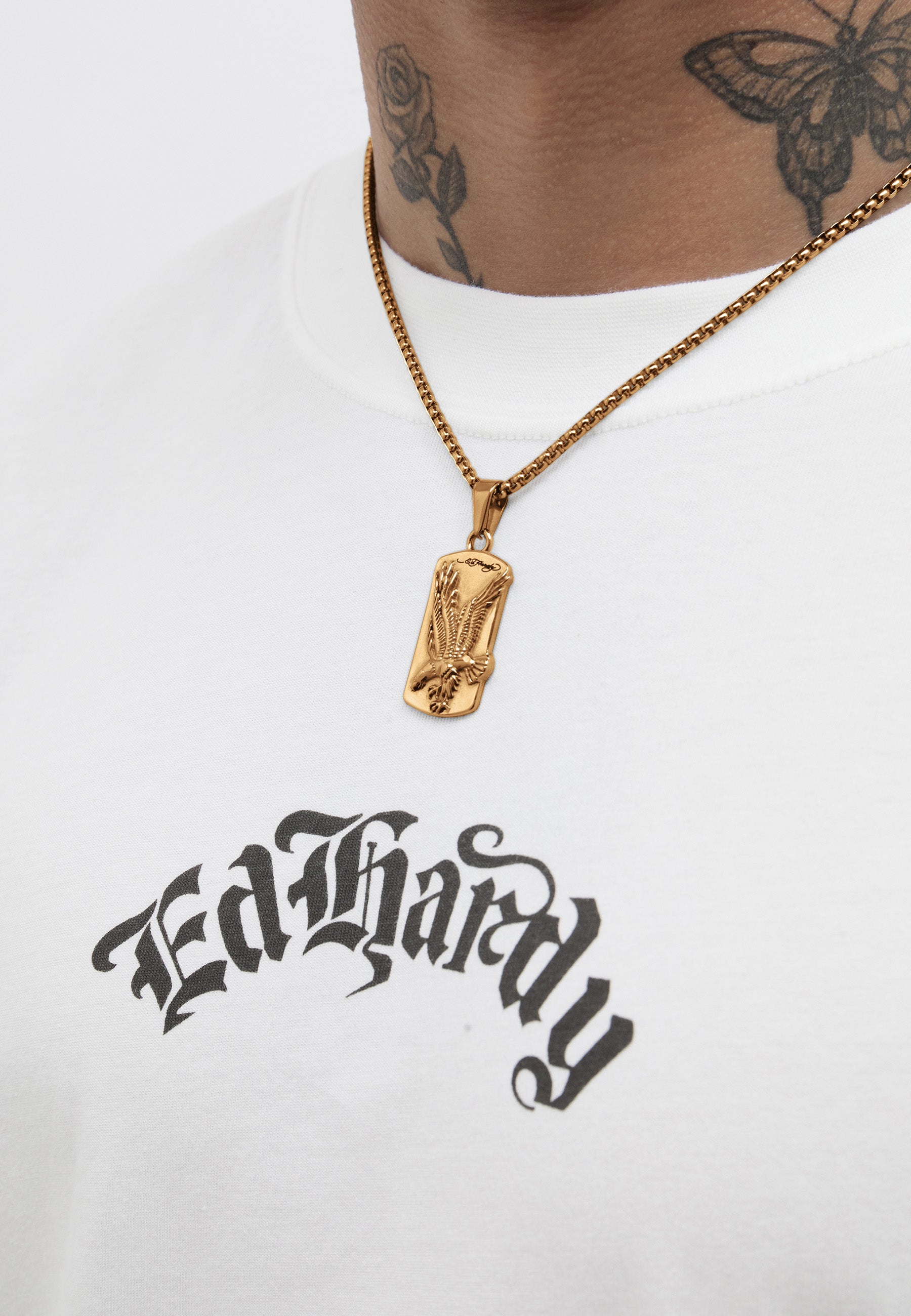 Stainless Steel Rounded box chain necklace with custom cast Ed Hardy Eagle in a gold finish.