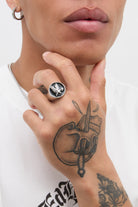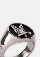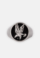 Stainless Steel custom cast Ed Hardy debossed Eagle rond signet ring in a silver finish.