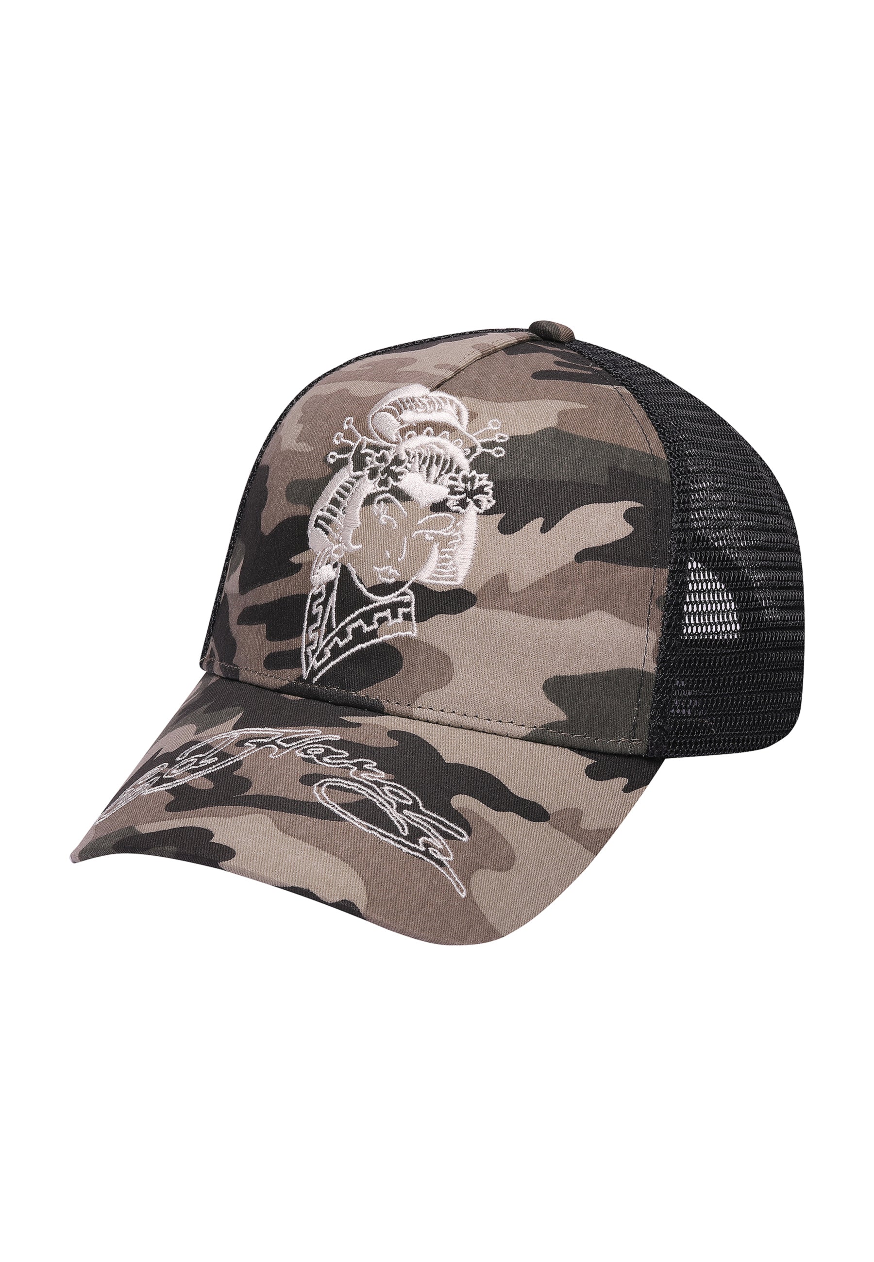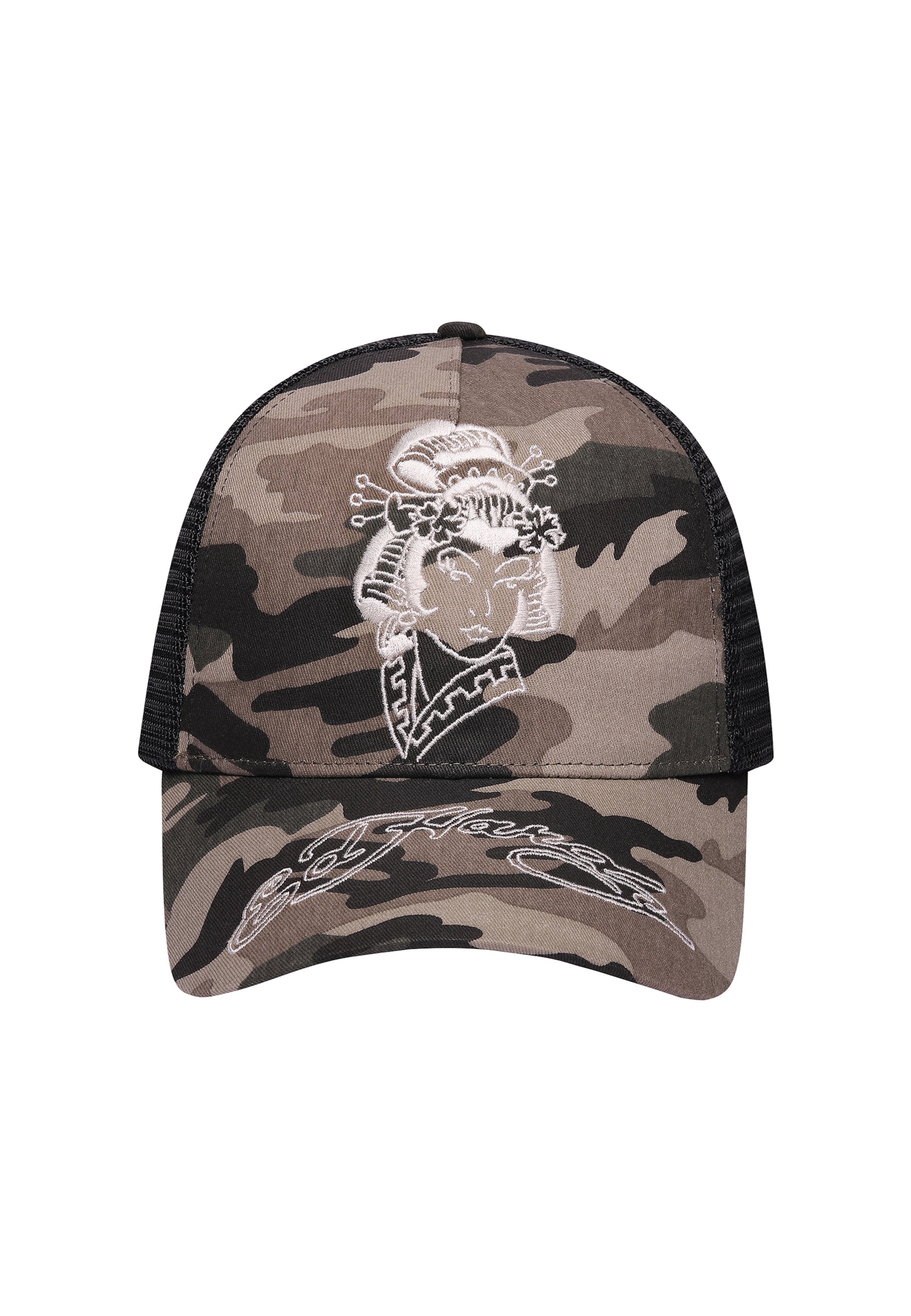 The camo print contrasts with intricate embroidery of the tonal graphic and Ed Hardy’s signature logo on the peak.
