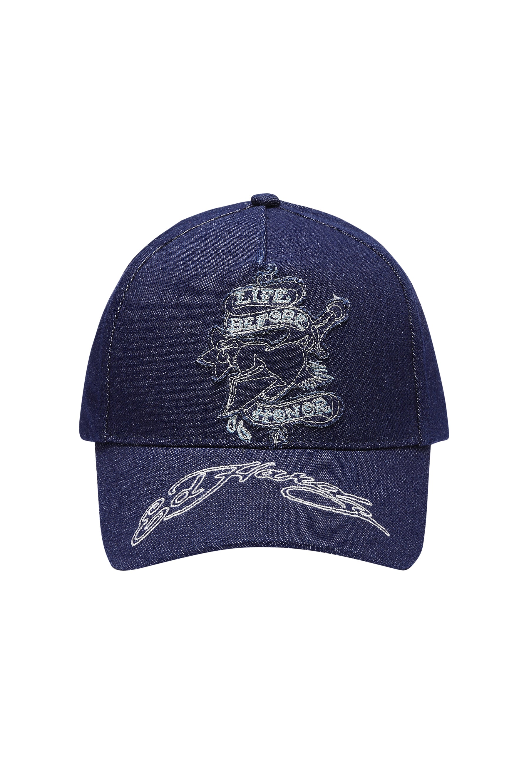Complete with a raw edge graphic and the signature, embroidered outline Ed Hardy logo on the peak.