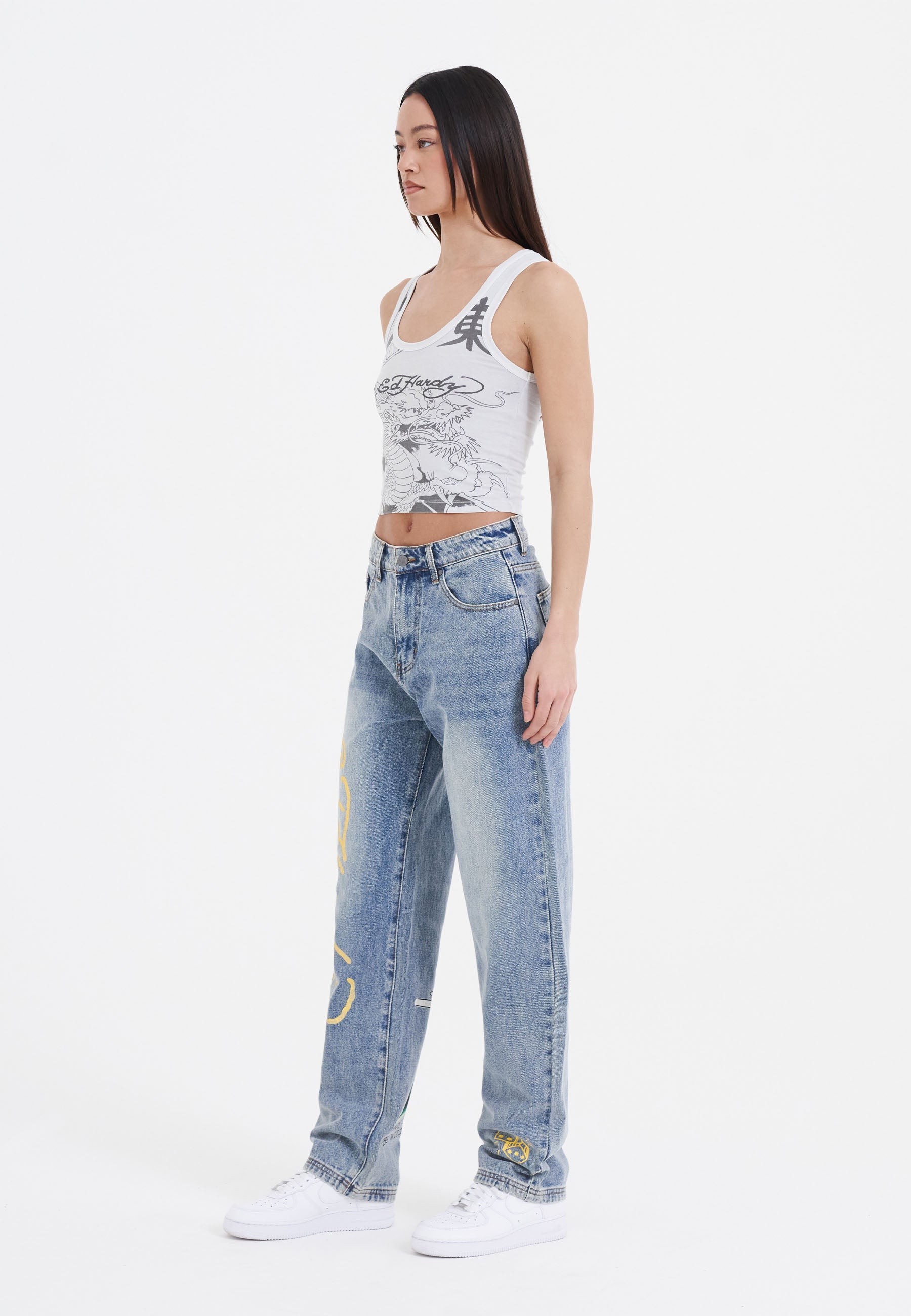 Sleeveless and cropped at the waist in a subtle “Barely Blue” colourway, this Vibrant Dragon vest is a spring/summer staple. A vintage tonal dragon graphic and Ed Hardy signature emblazoned on the front ensures this classic silouhette is anything but basic.
