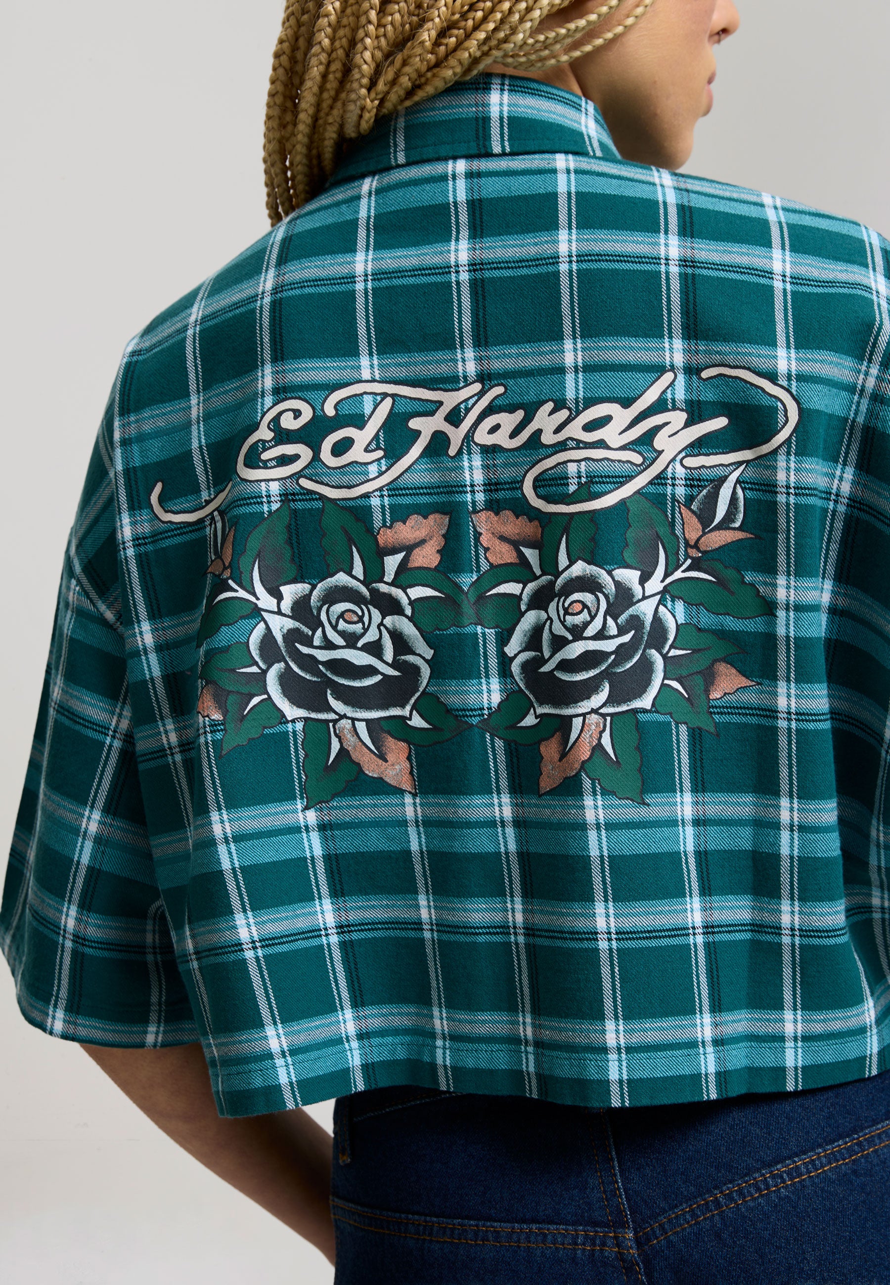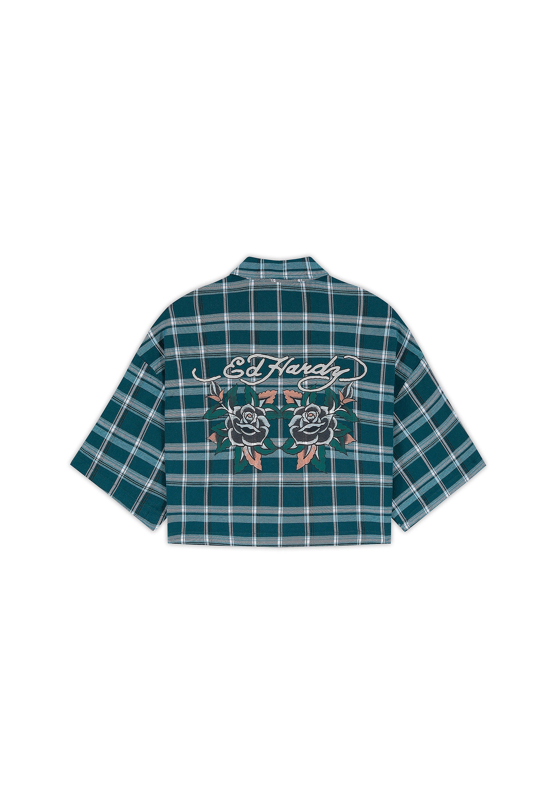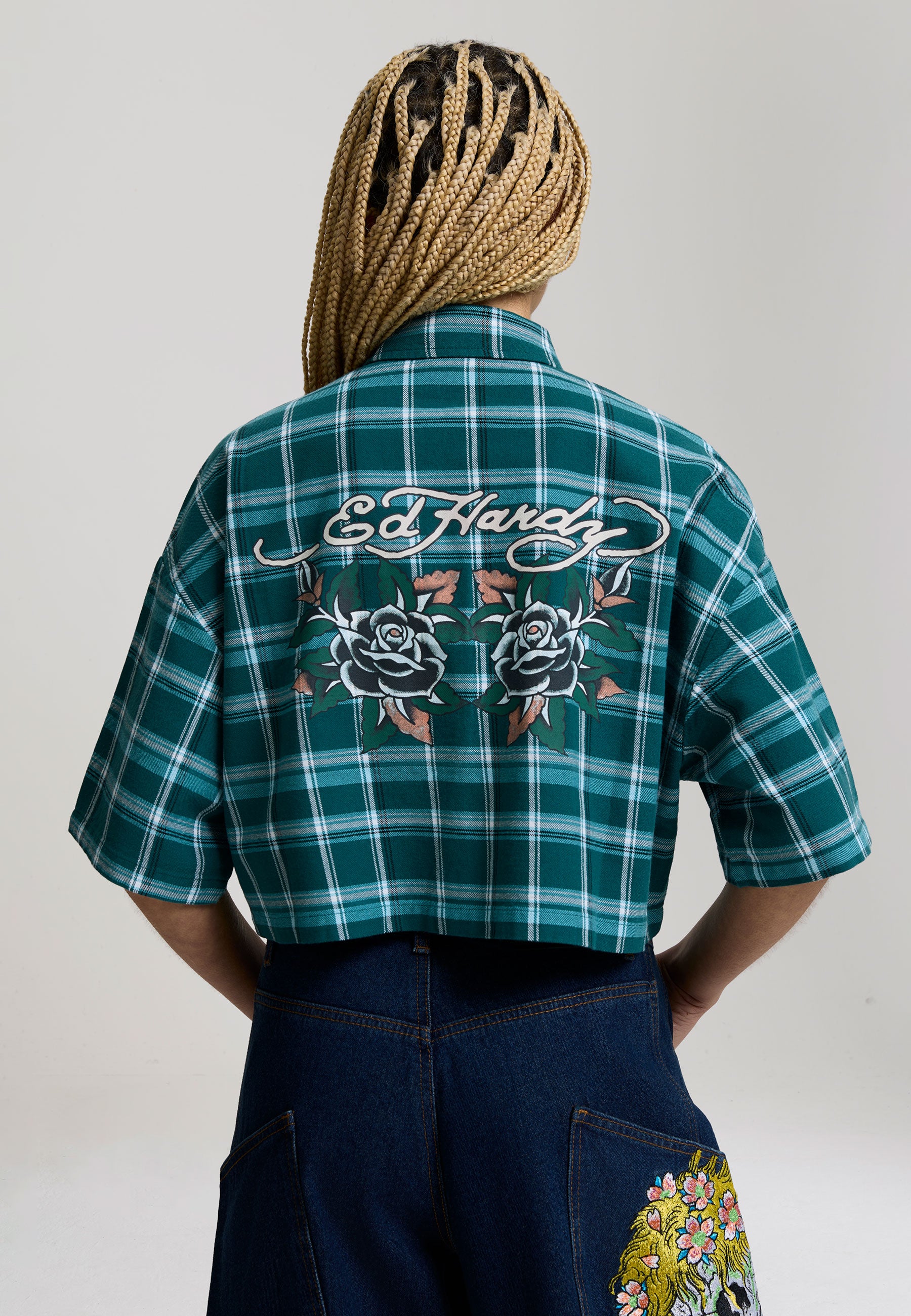 Womens Black Roses Cropped Relaxed Check Shirt - Teal