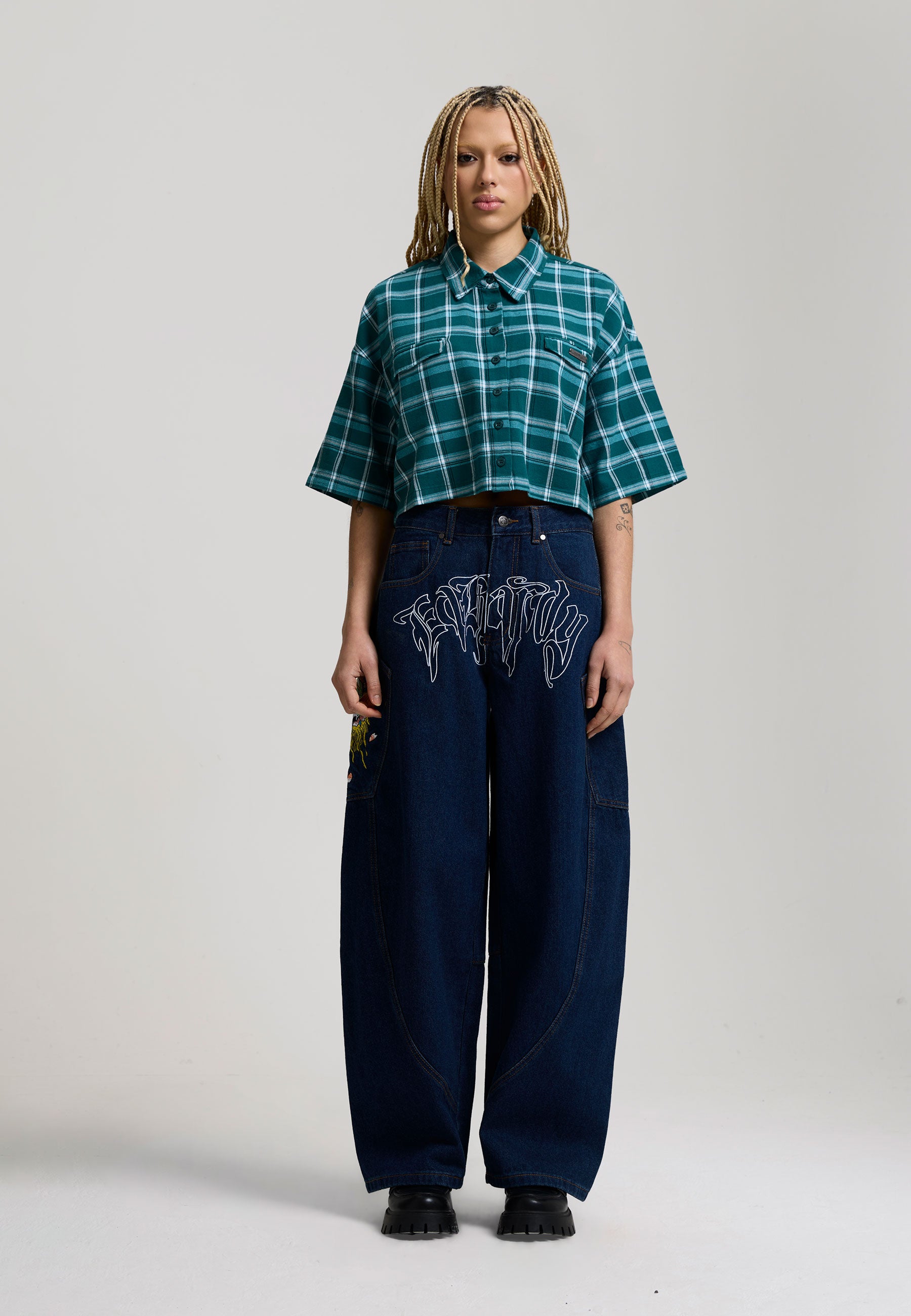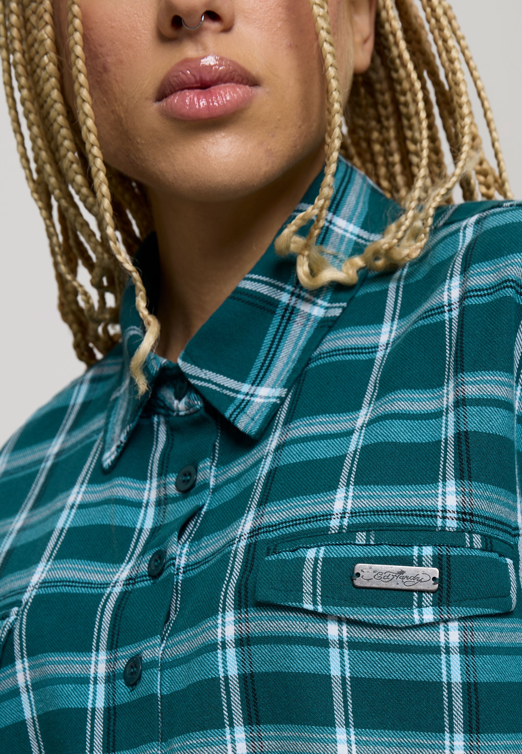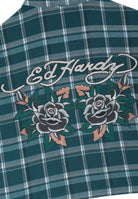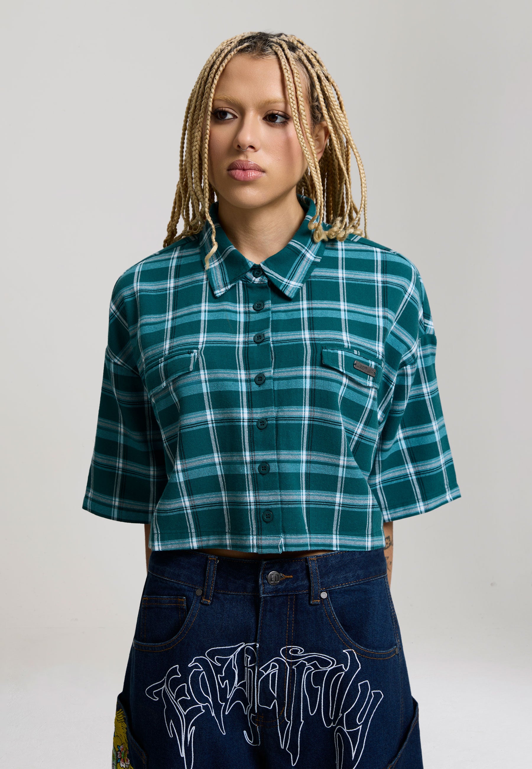 Womens Black Roses Cropped Relaxed Check Shirt - Teal