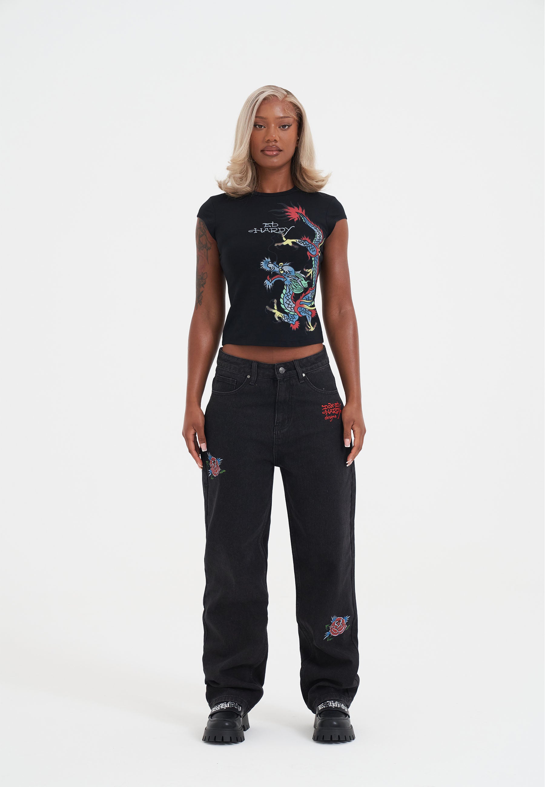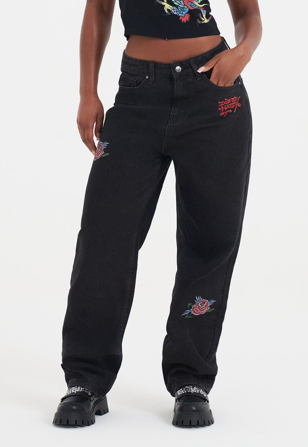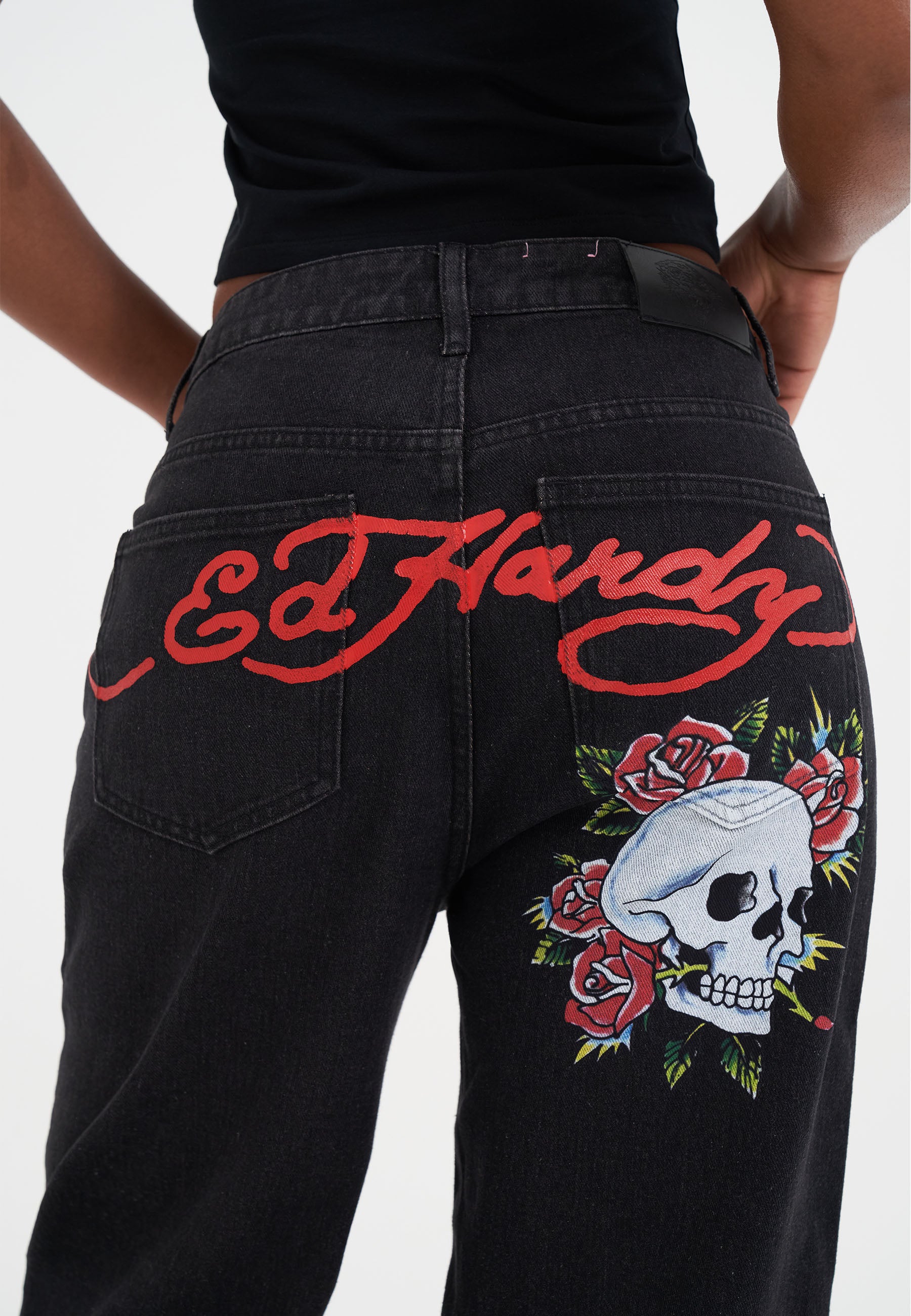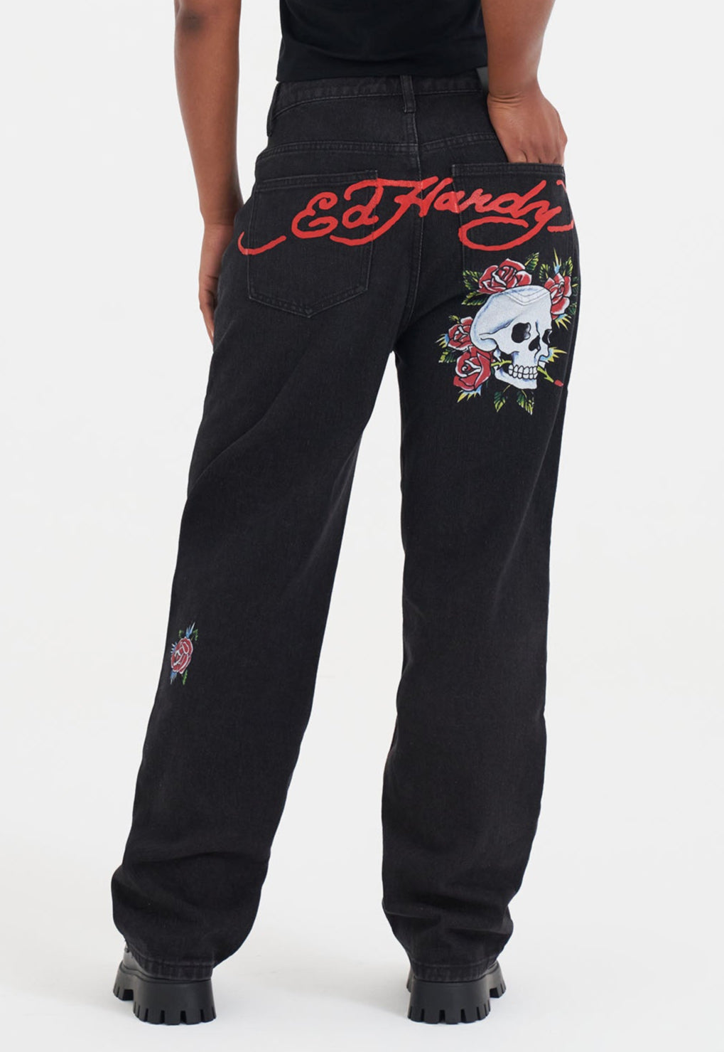 The Women's Blooming Death Relaxed Jeans reinterpret Ed's original drawings into timeless designs. The Relaxed-Fit leg showcases intricate full-colour embroidery, featuring Ed Hardy's iconic Blooming Skull and original Rose graphics from his sketchbook.