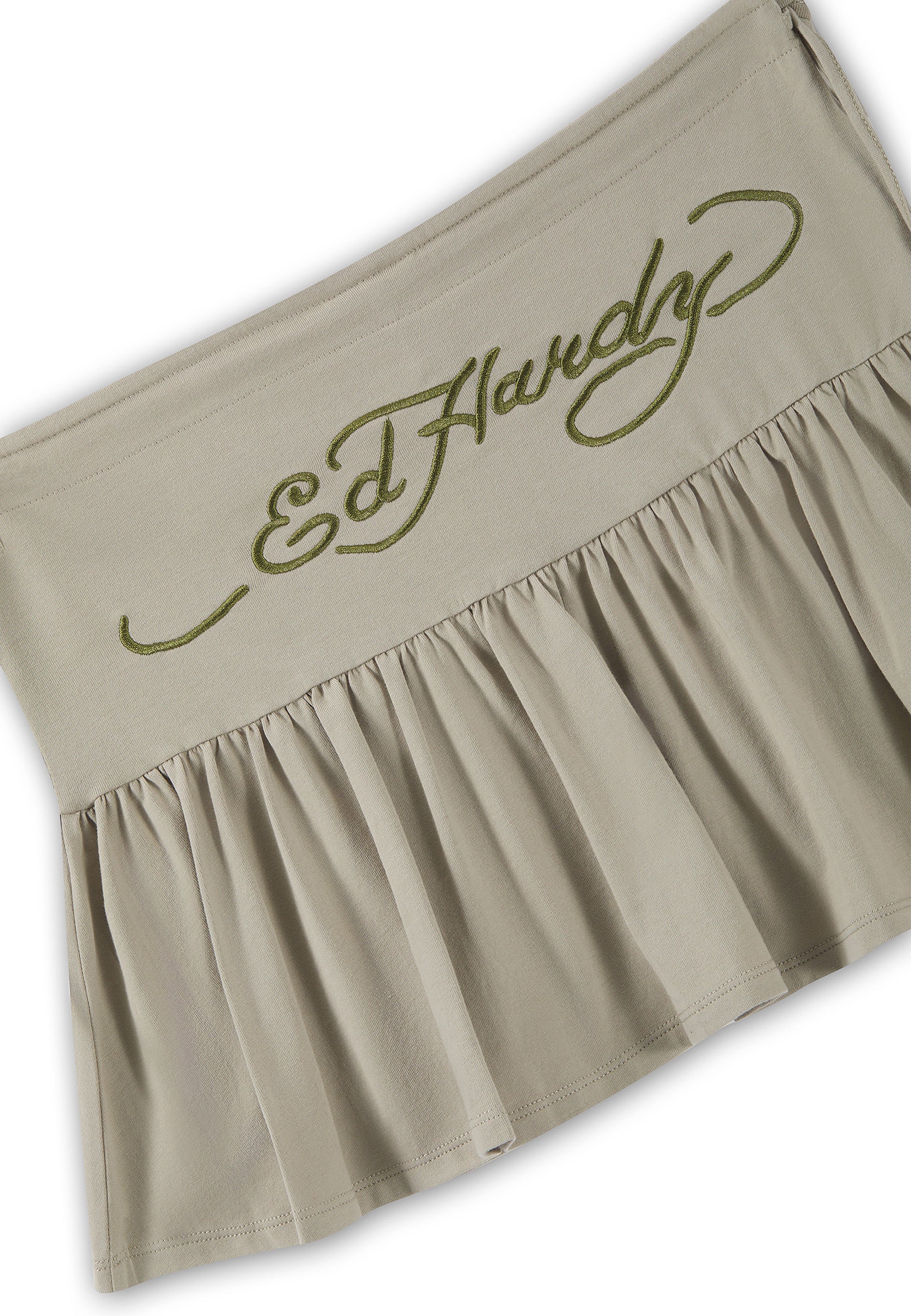 REGULAR FIT 100% COTTON BLEACH WASH FLORALS EMBROIDERY TO FRONT ED HARDY EMBROIDERY TO BACK MINI LENGTH EYELET DETAIL CONTRAST STITCH DETAIL SIDE ZIP FASTENING RAW HEM PLEATED DETAILING 100% COTTON
