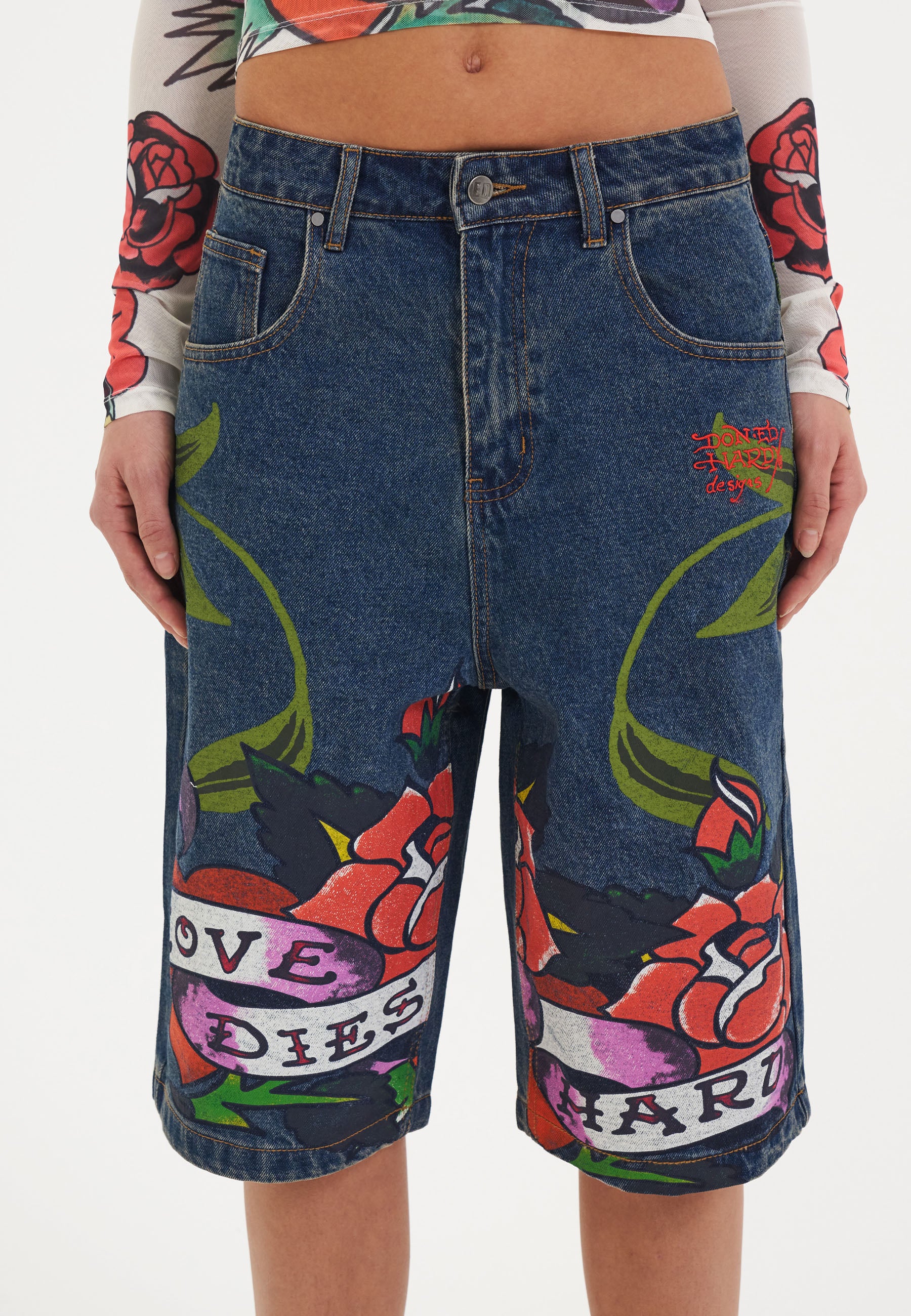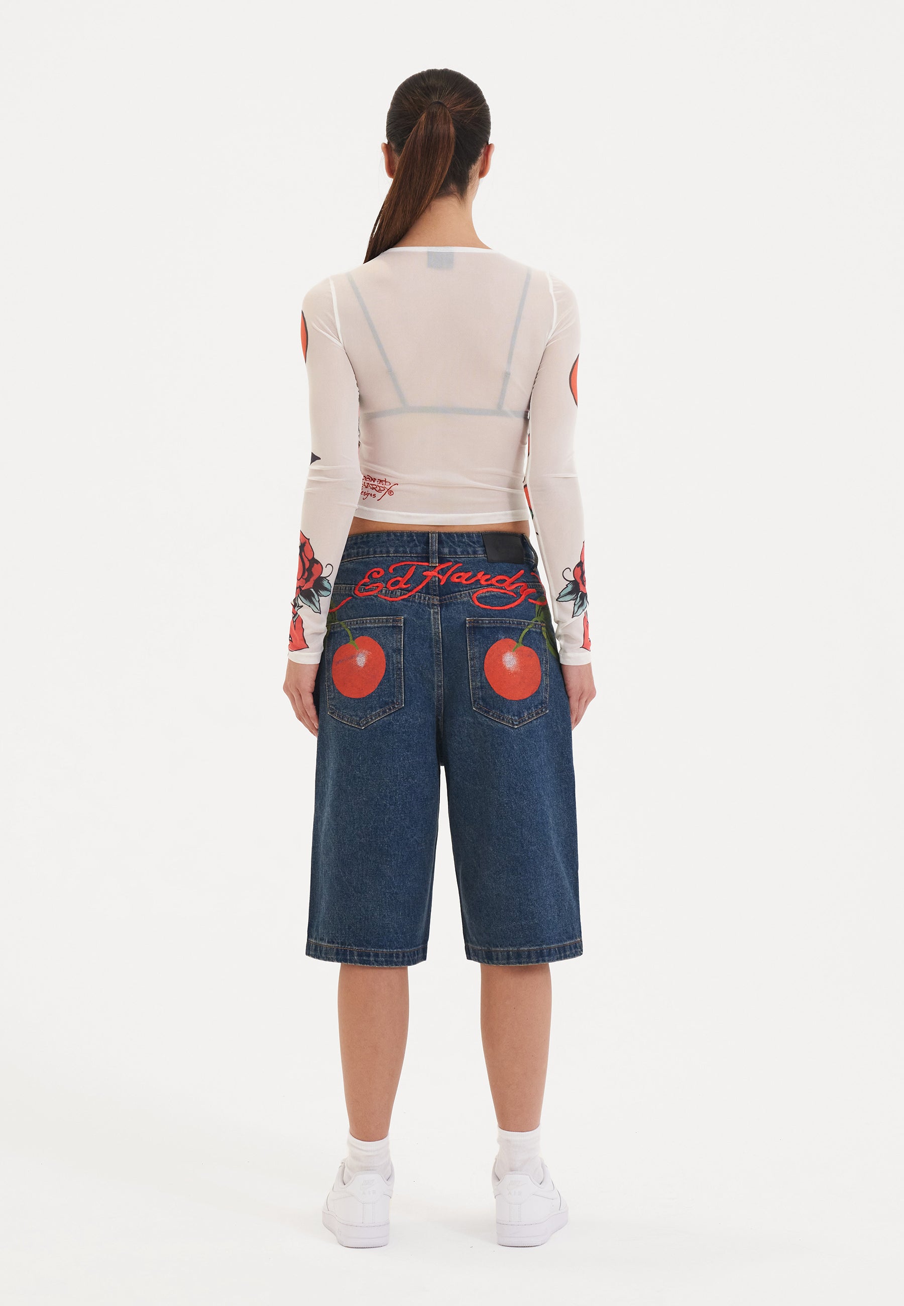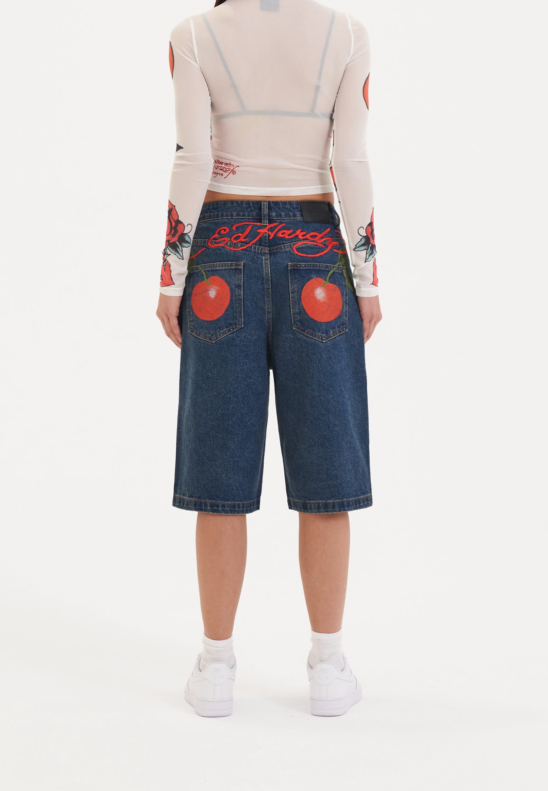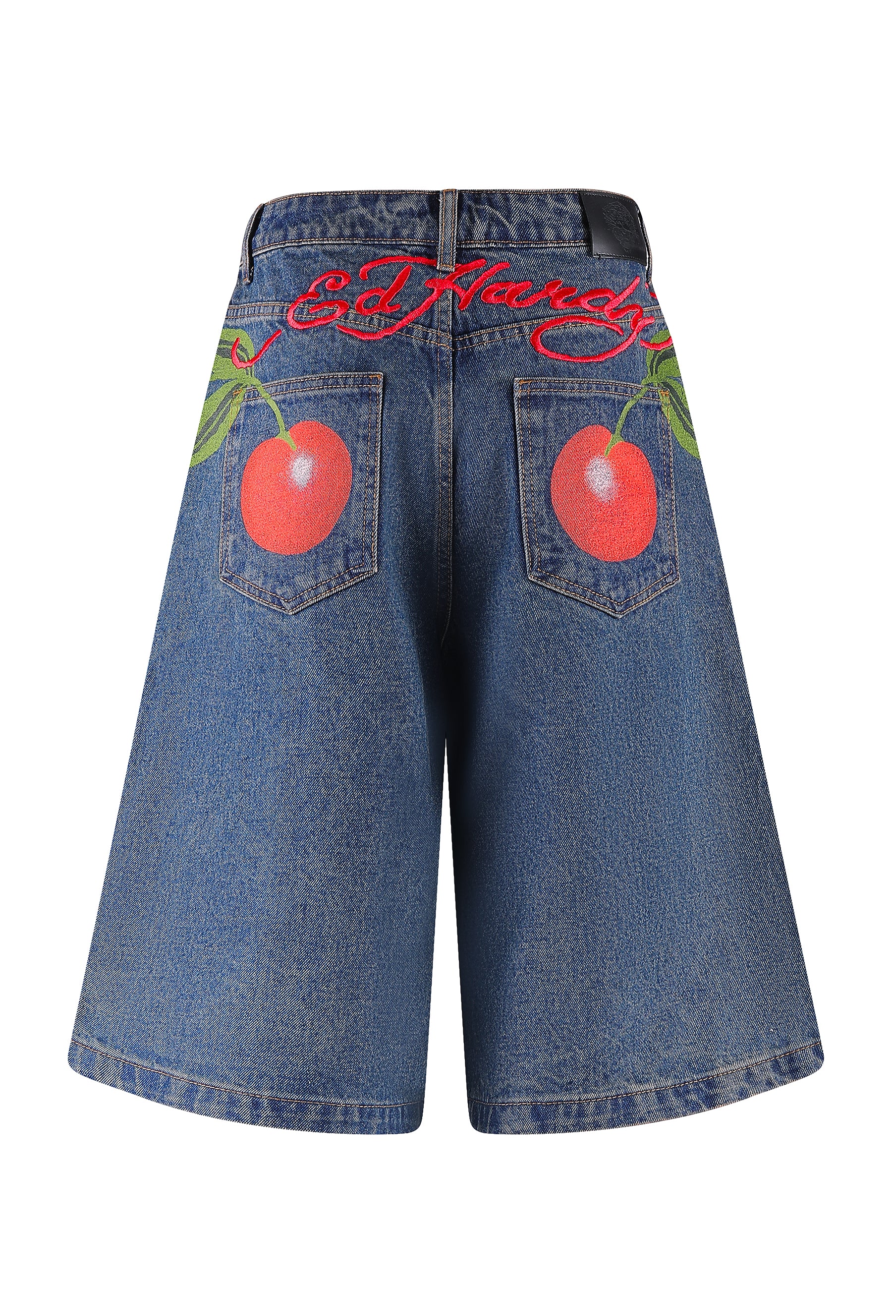 Womens Cherry Love Bomb Relaxed Denim Jorts Shorts - Indigo