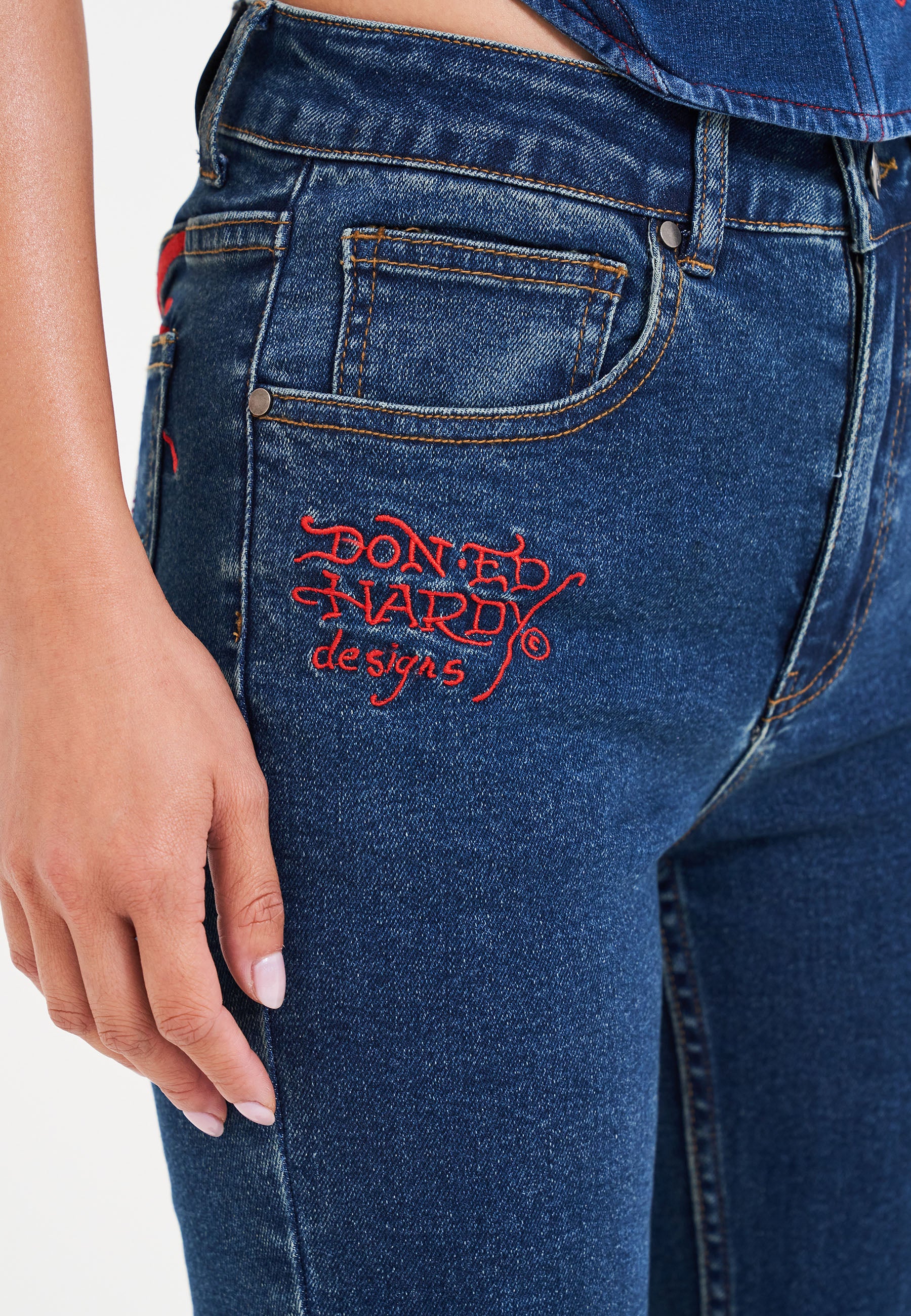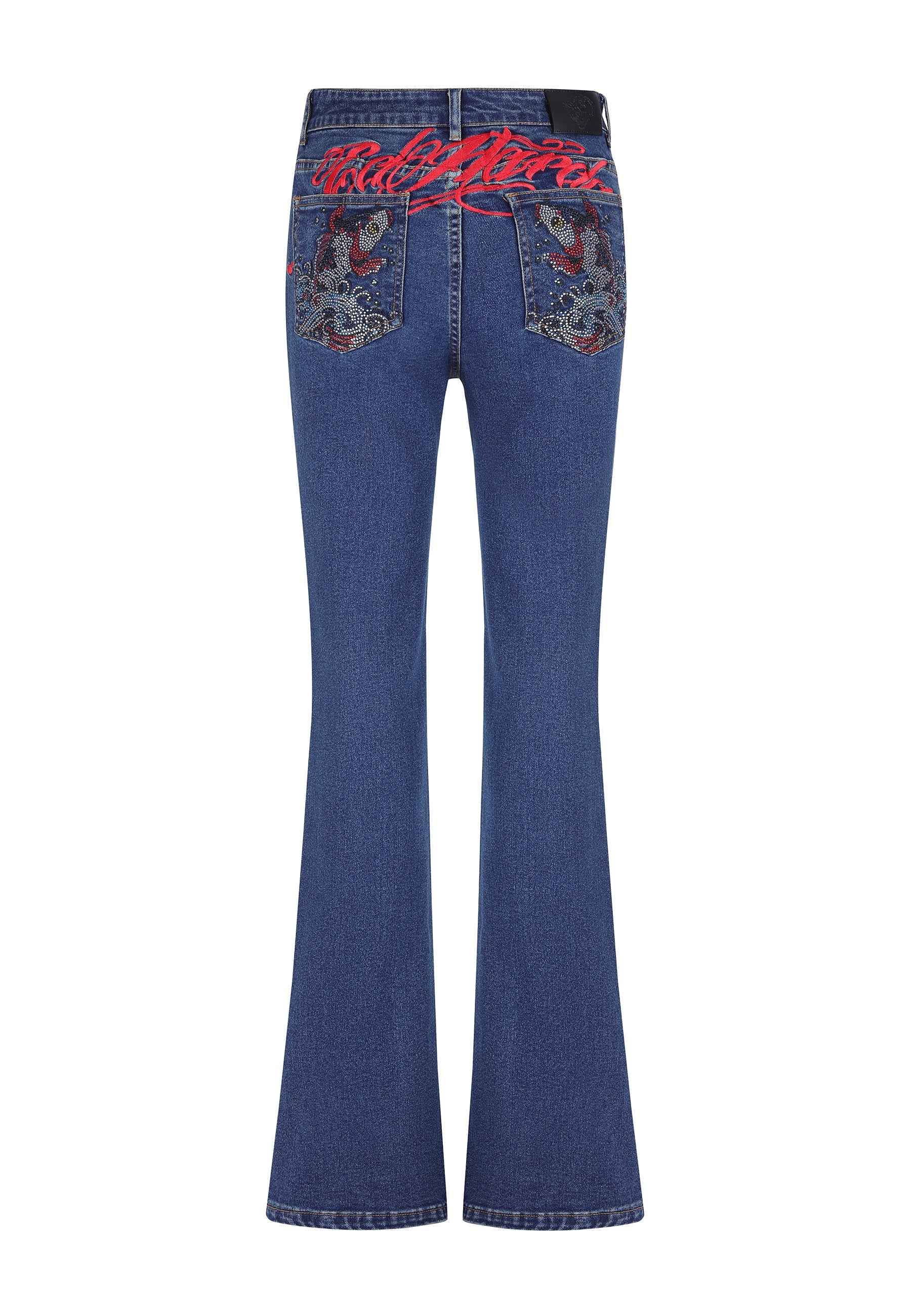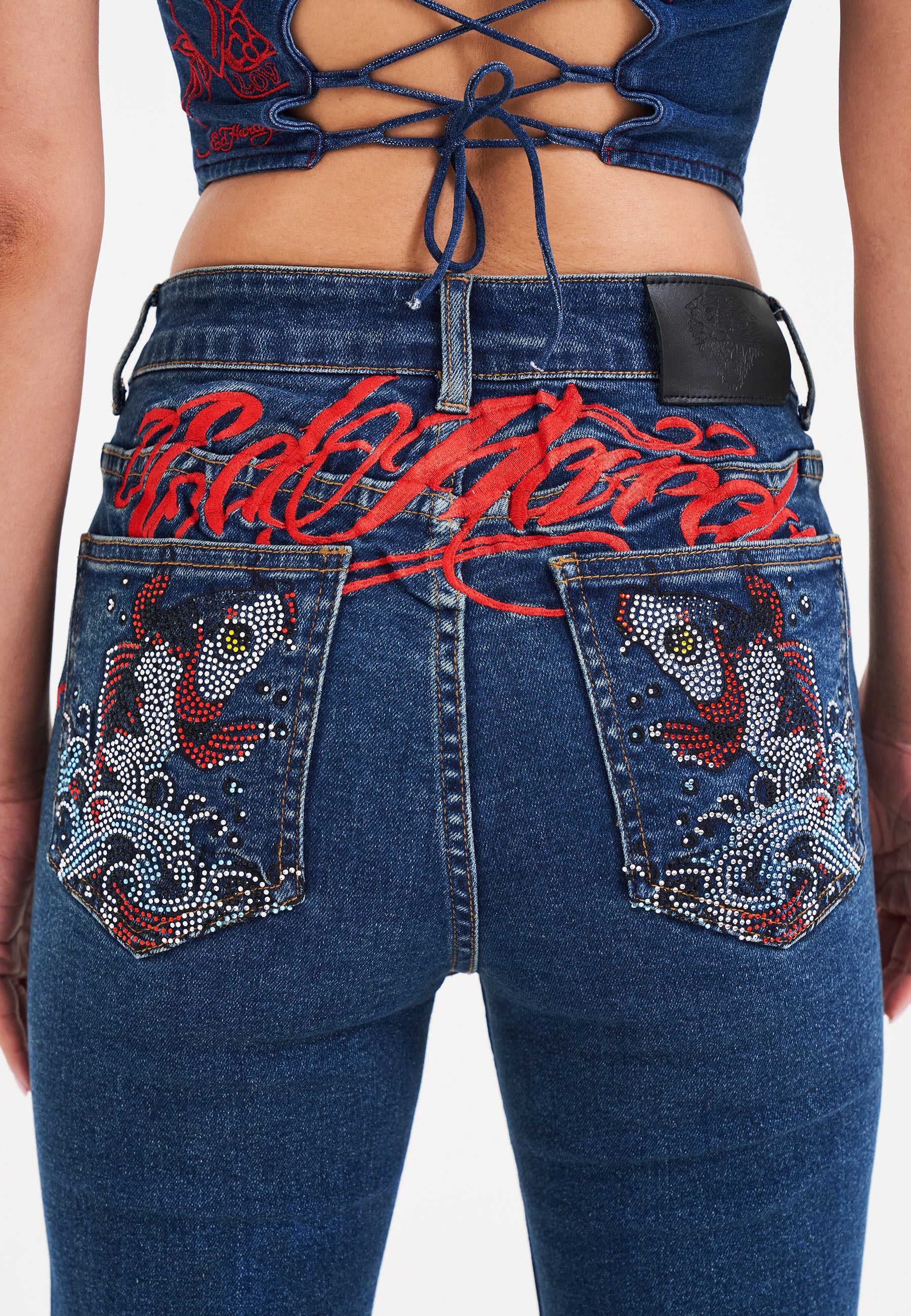 Adorned in intricate rhinestone appliqué, the Crystal Koi Flared Jeans take Ed's legendary designs to new heights.