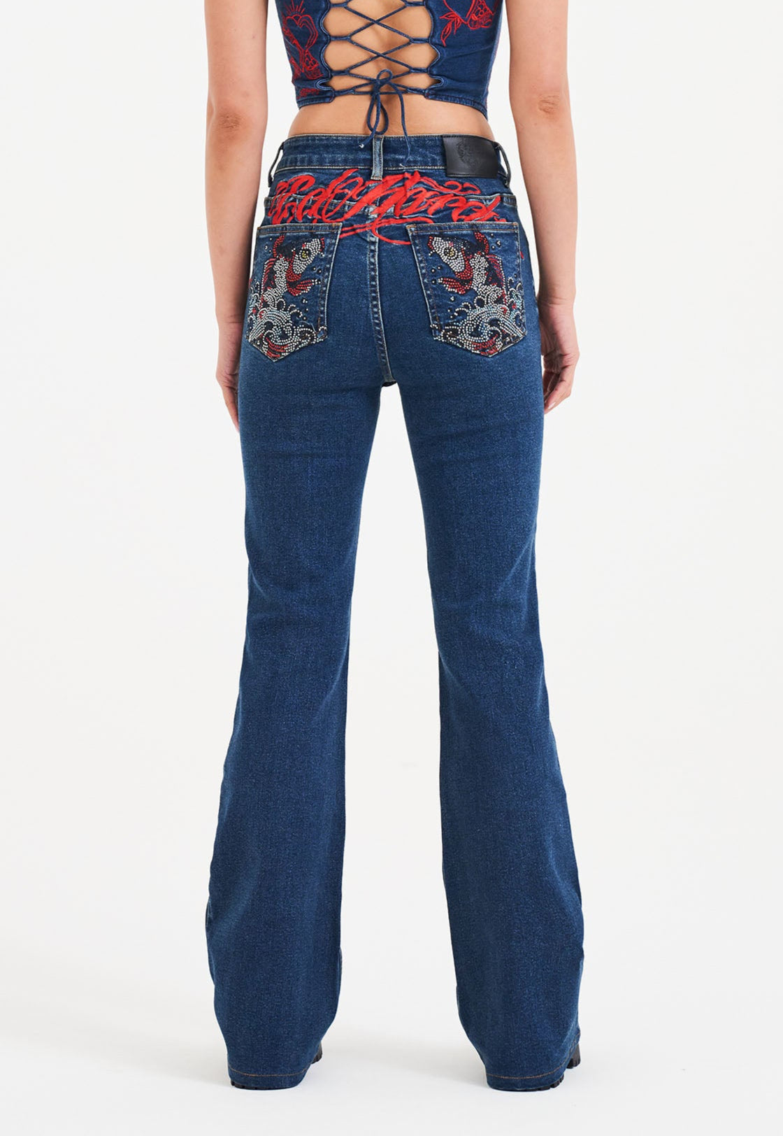 Womens Crystal Koi Flared Denim Trousers Jeans - Indigo