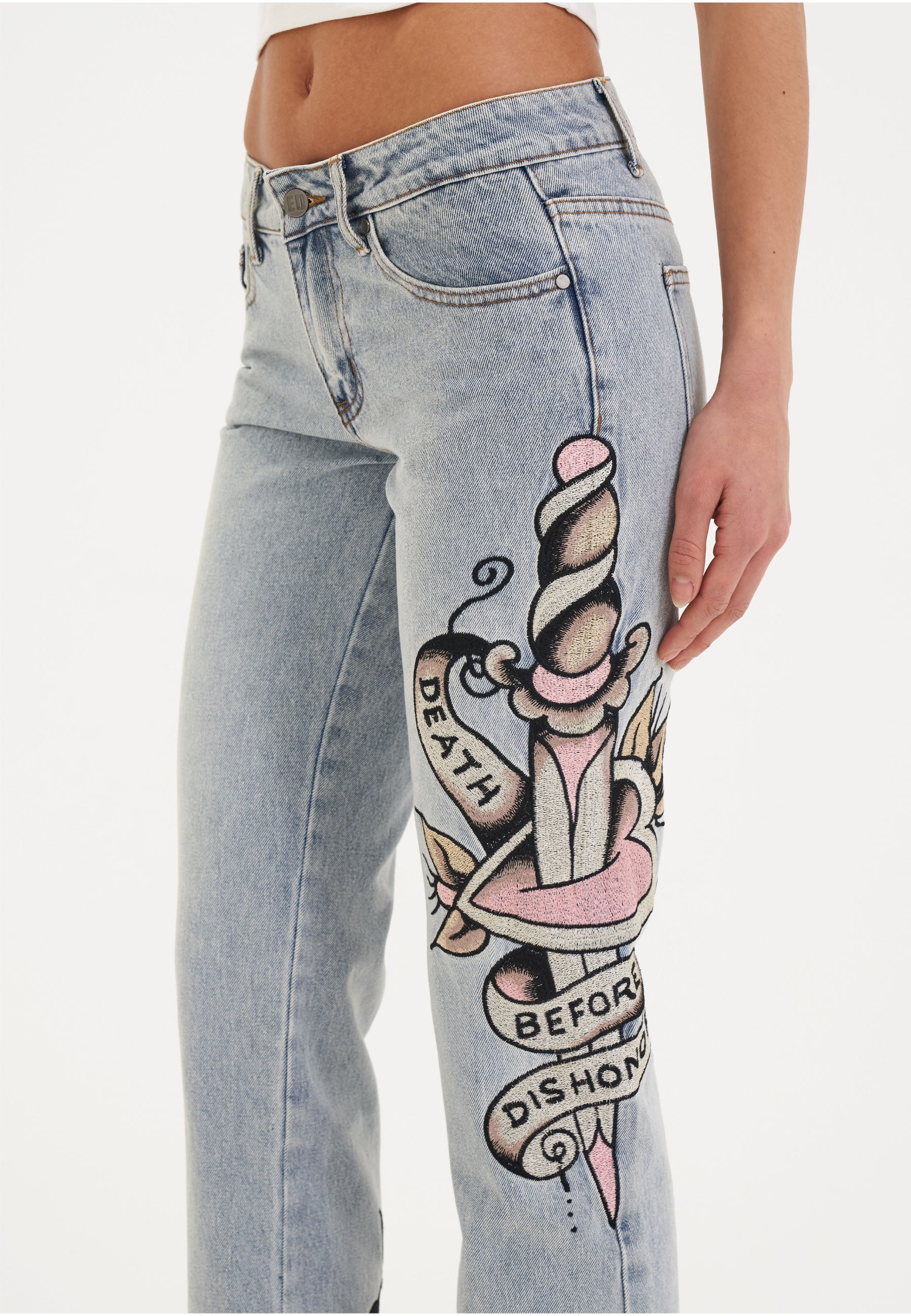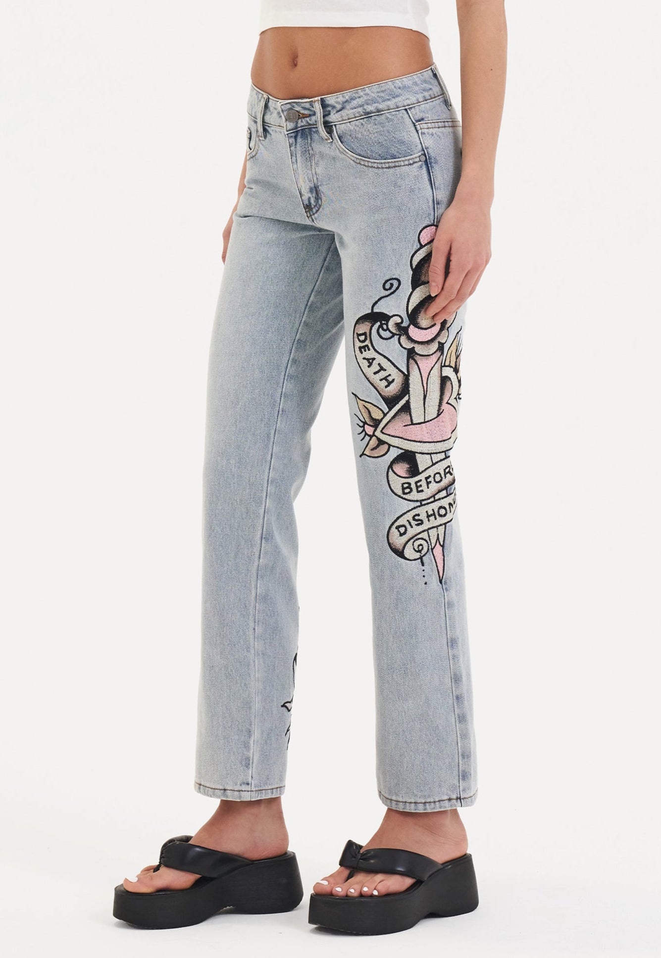 Embodying a creative emblem of rebellion and defiance, the Death & Dishonour Jeans draw inspiration from the bold ethos of Punk culture and the liberating spirit of Summer Festivals.