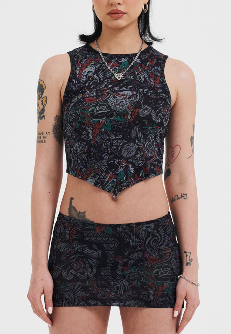 Womens Dragon Repeat Tied Back Mesh Vest Top - Black