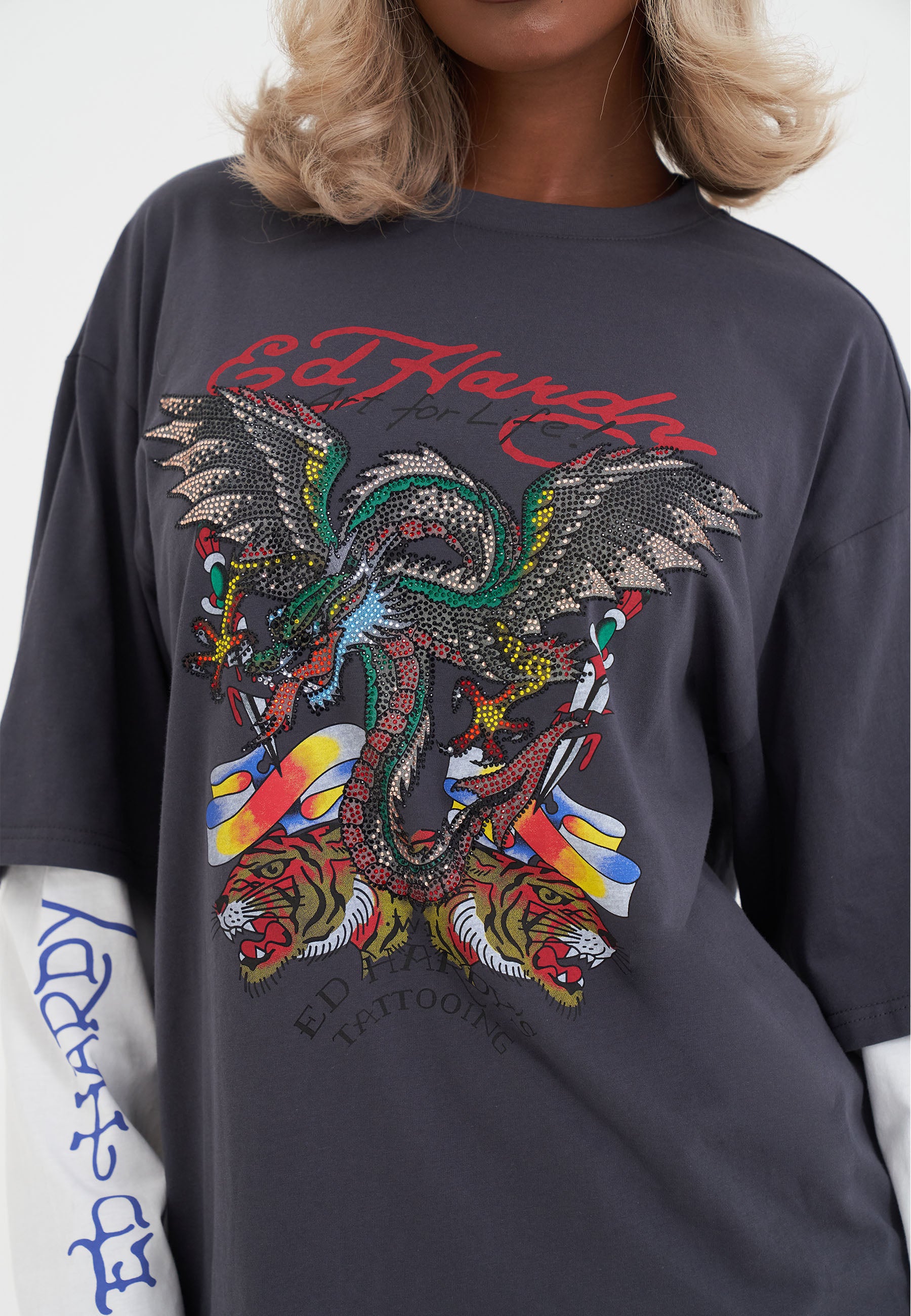Womens Flying Dragon Double Sleeve T-Shirt - Charcoal